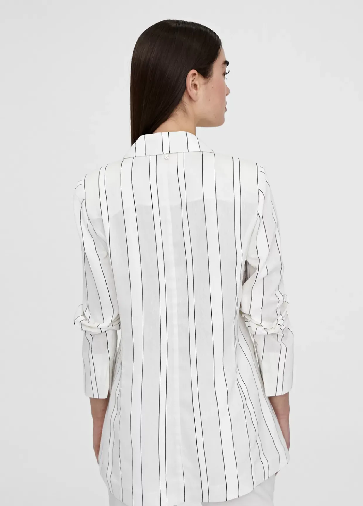 Blazer fluida de rayas y sin forro. Bolsillos tipo tapeta en laterales. Cierre con botón dorado.