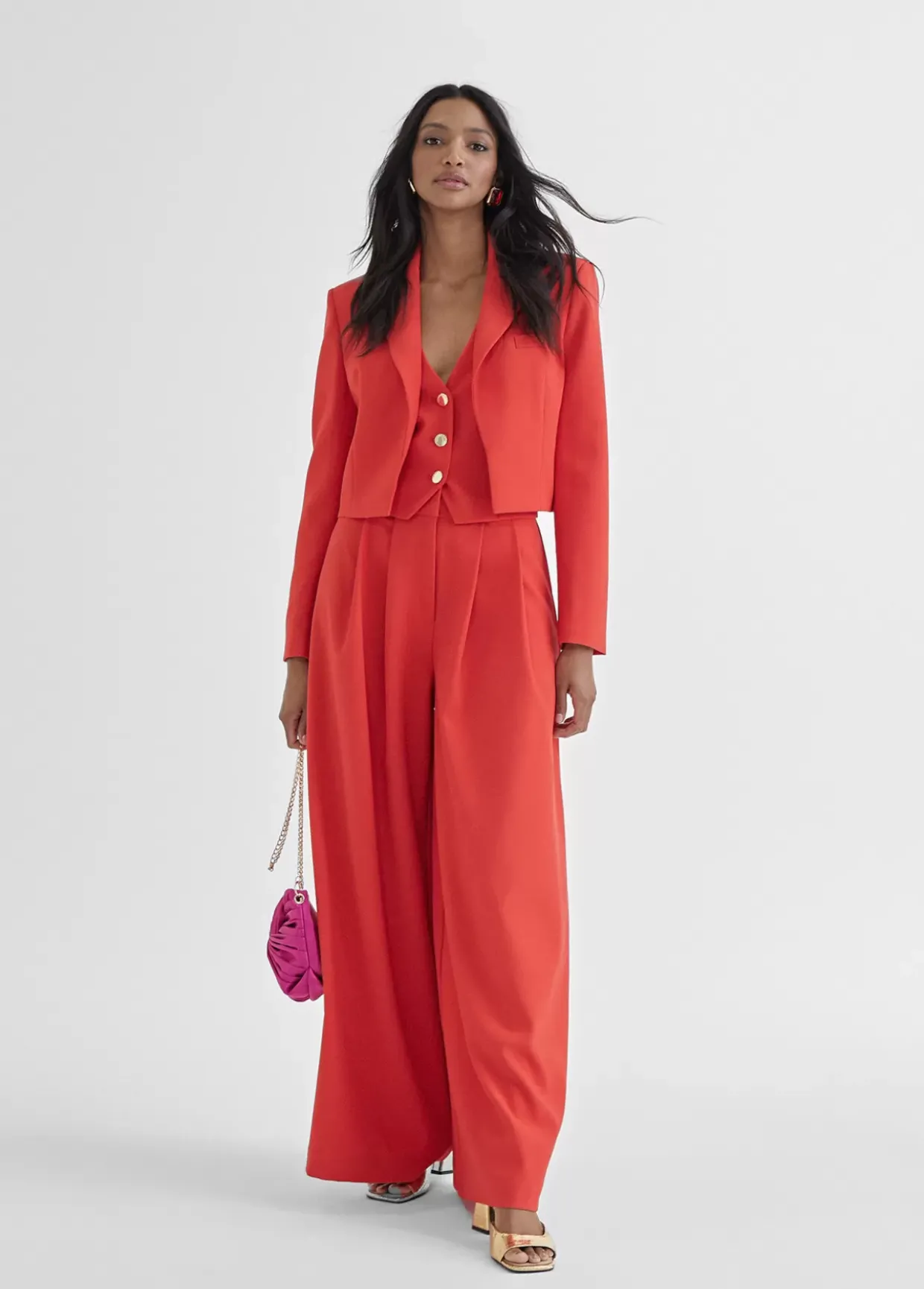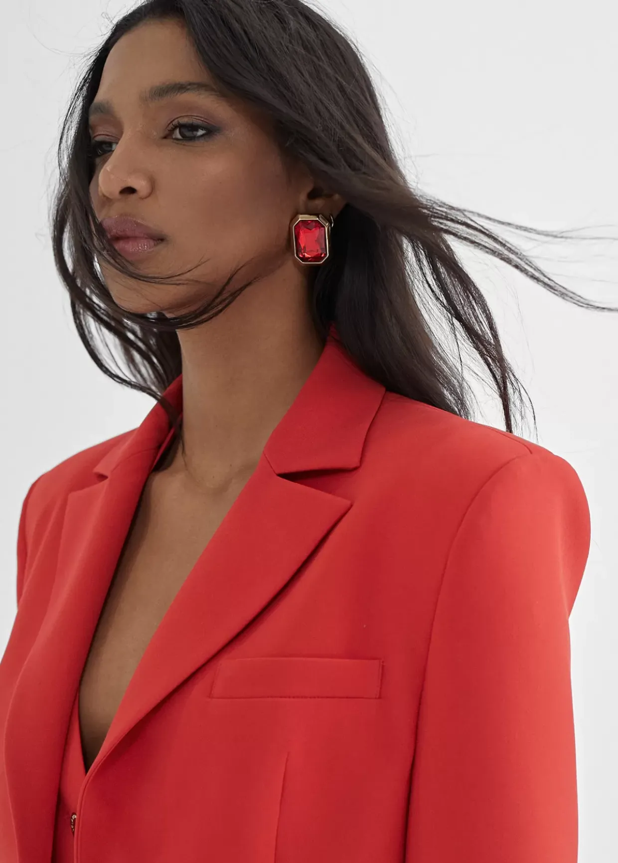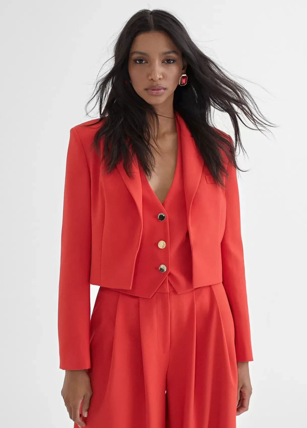 Americana cropped mono color. Cuello solapa y sin botones. Forro logotipado a contraste.