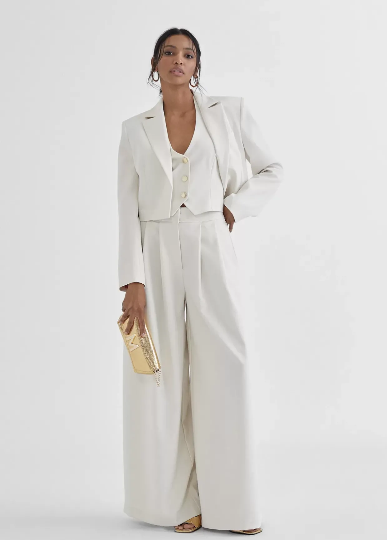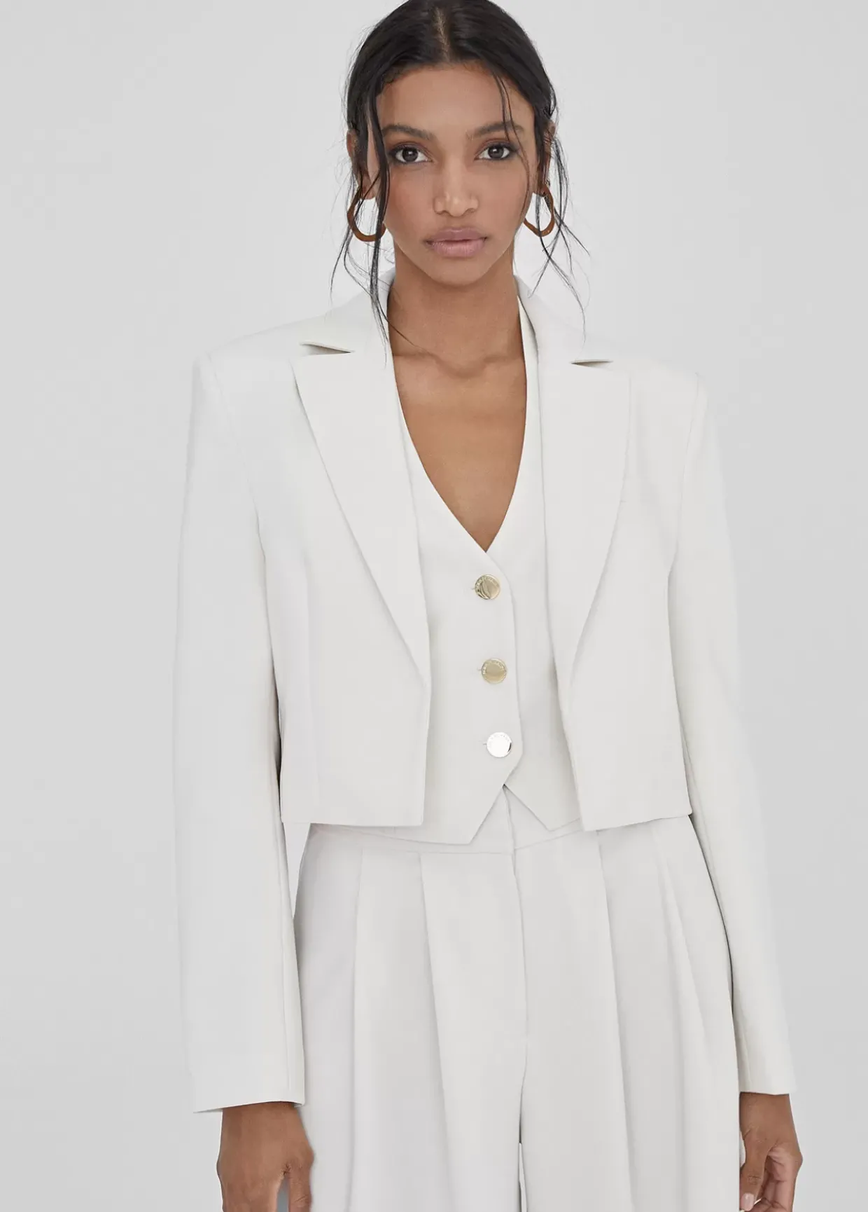 Americana cropped mono color. Cuello solapa y sin botones. Forro logotipado a contraste.