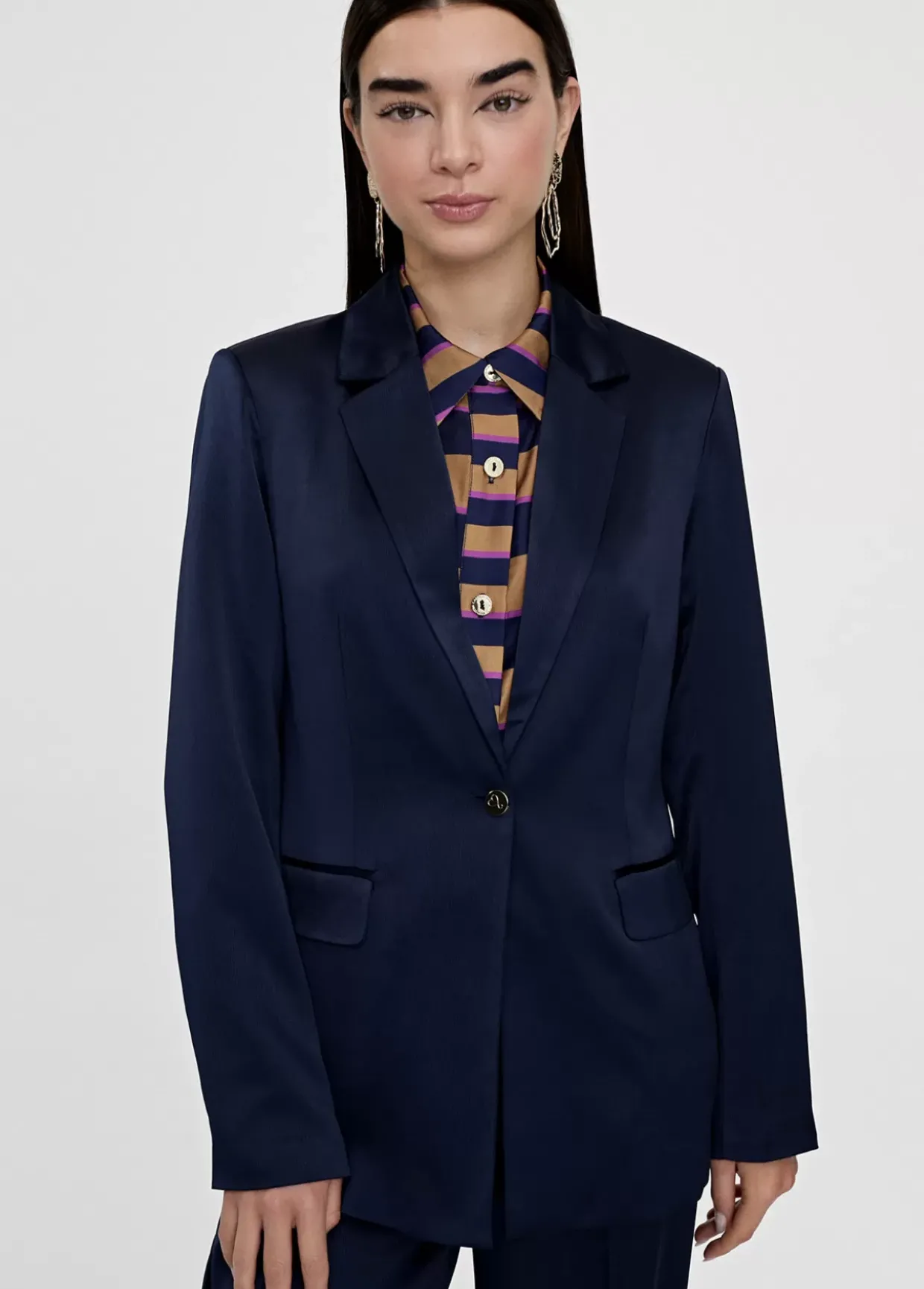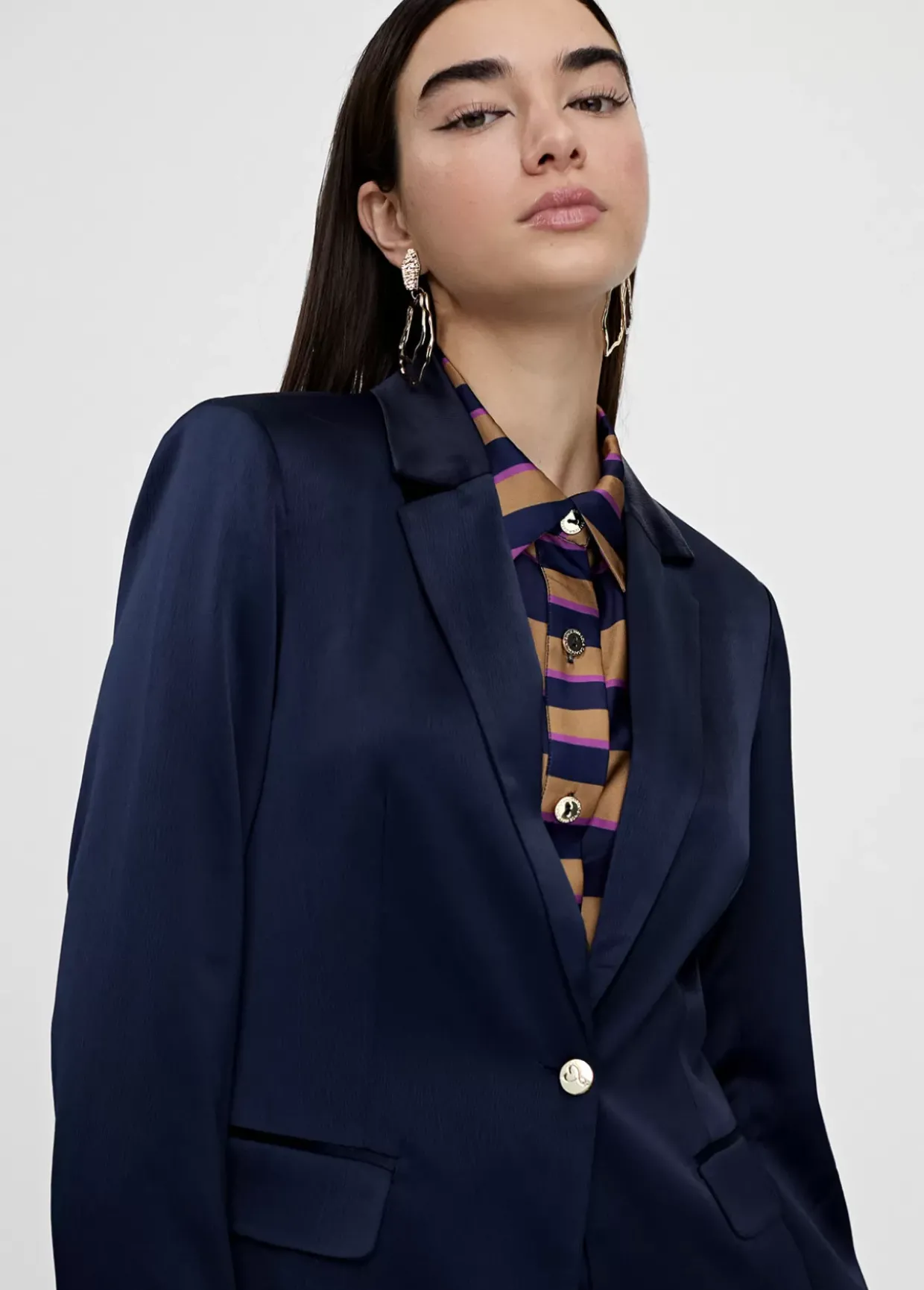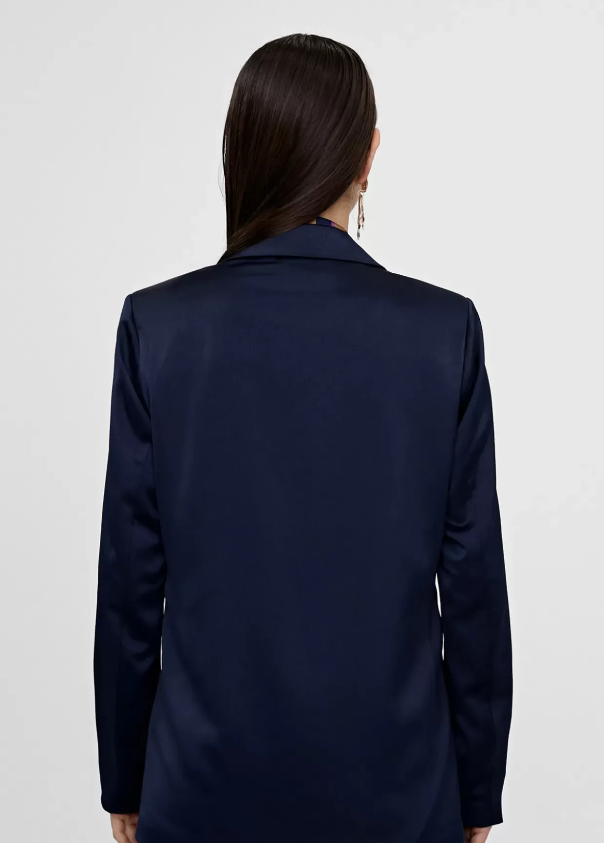 Blazer efecto saten. Cuello solapa y manga larga con hombreras. Bolsillo delantero con vivo y solapa. Forro a contraste estampado animal.