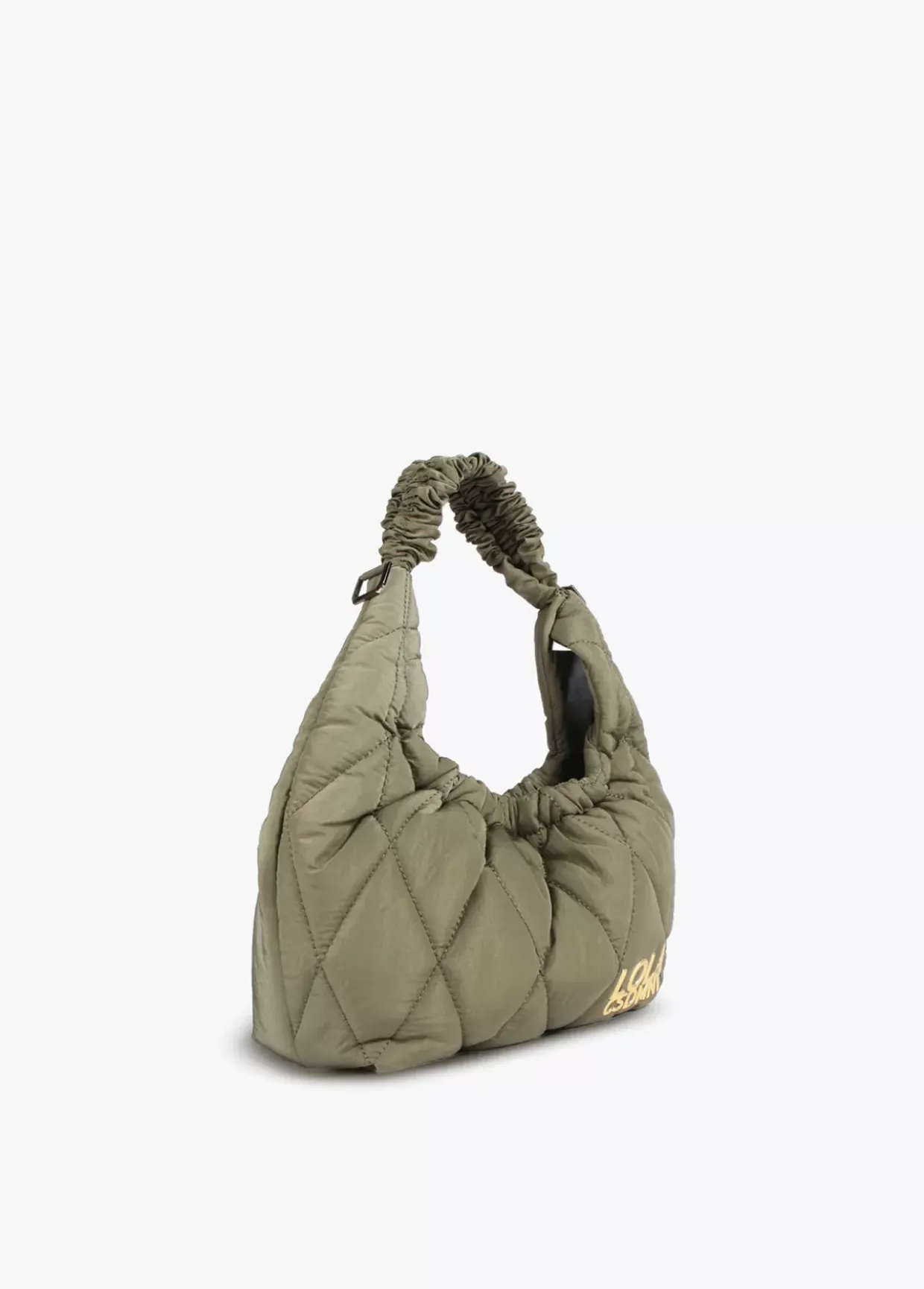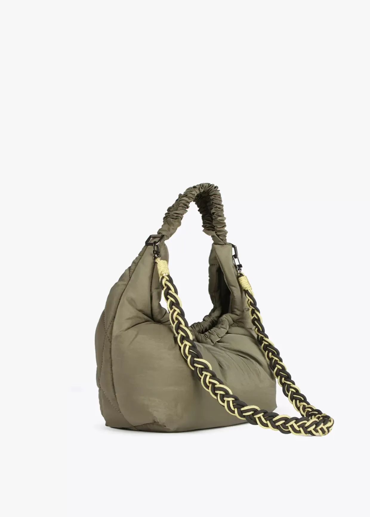 Bolso tipo bandolera acolchada con mega logo en parte frontal inferior. Asa de hombro y asa bandolera de cordones trenzados extraíble.