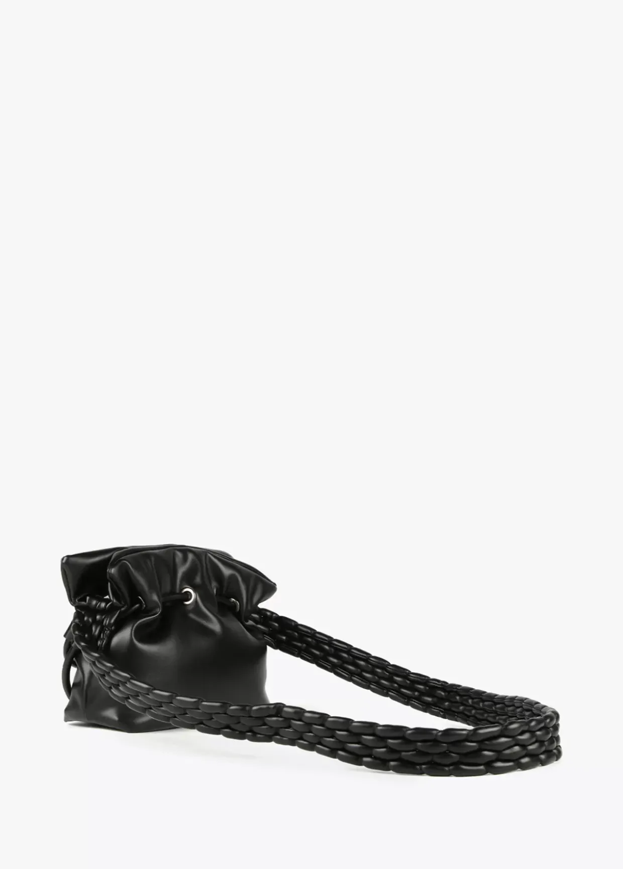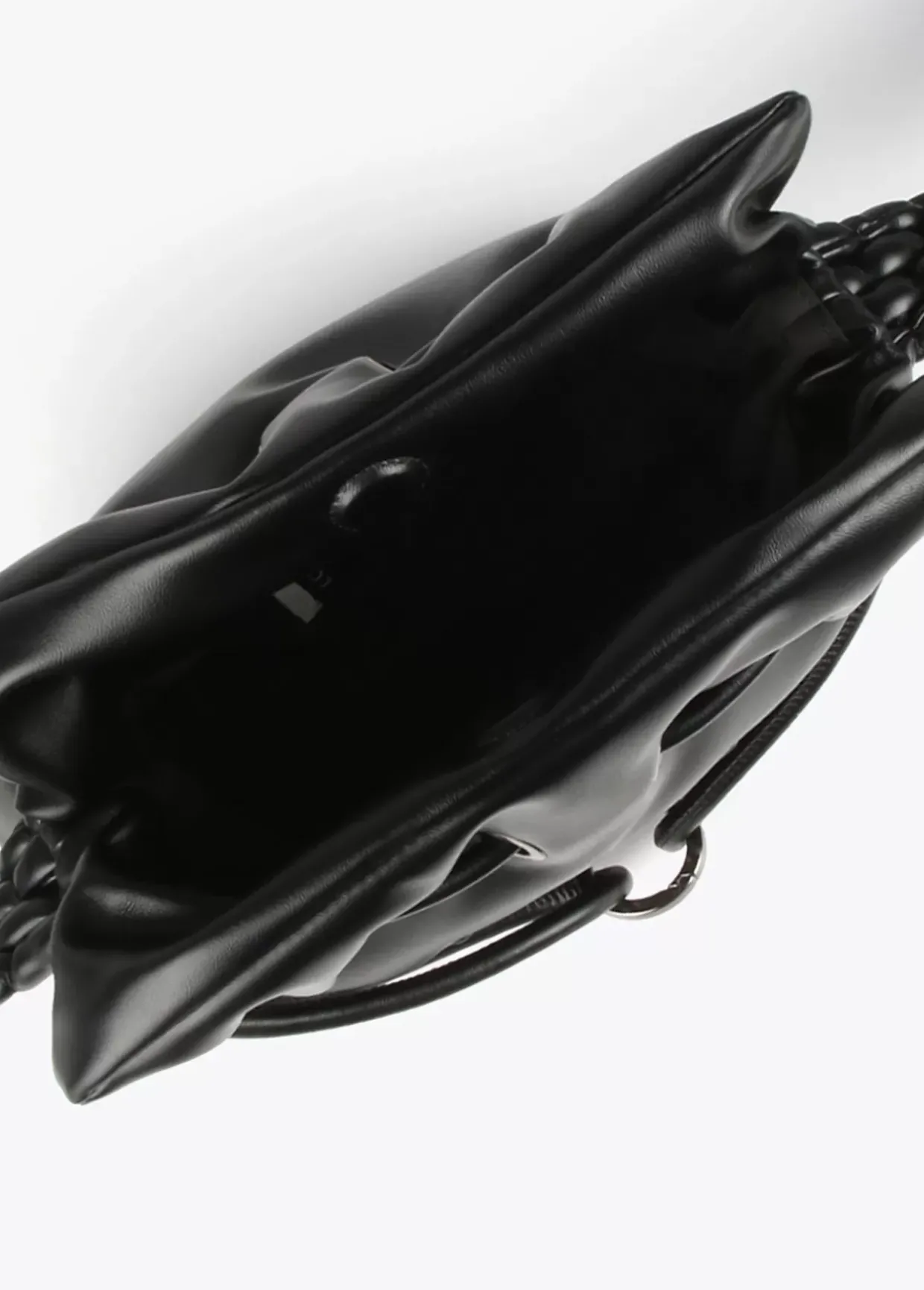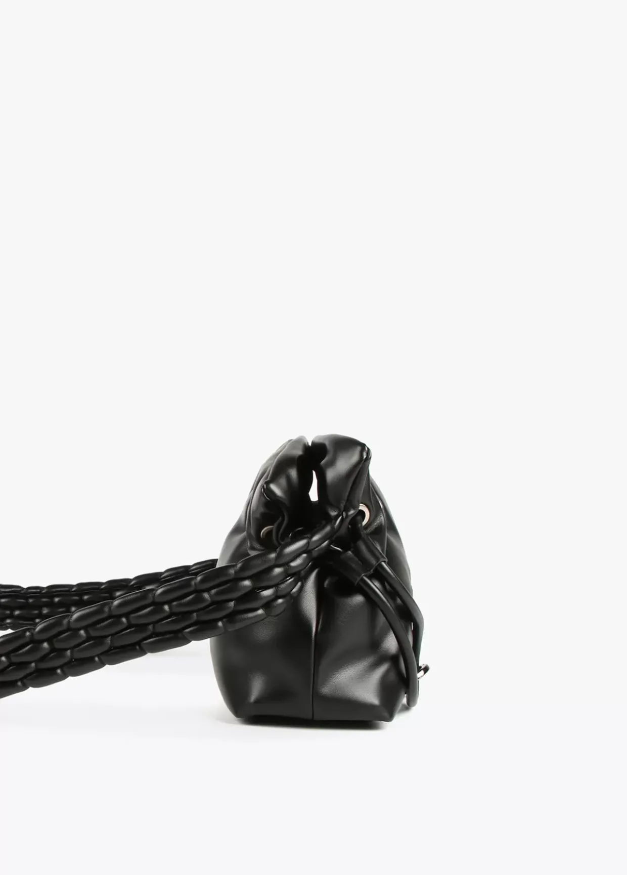 Bolso tipo bandolera en efecto piel con logo en relieve en parte frontal. Asa bandolera trenzada, cordón ajustable y cierre con botón imantado.