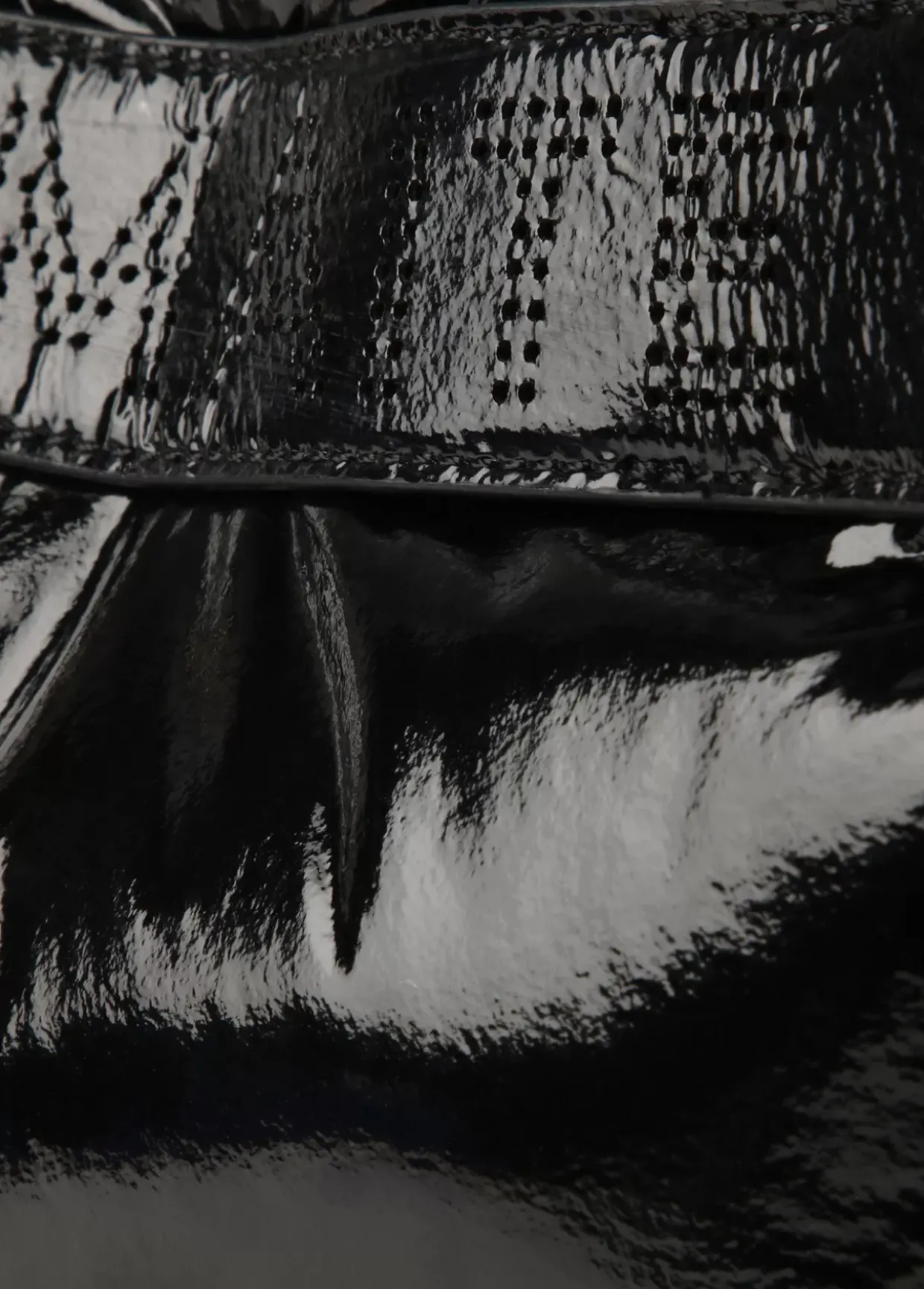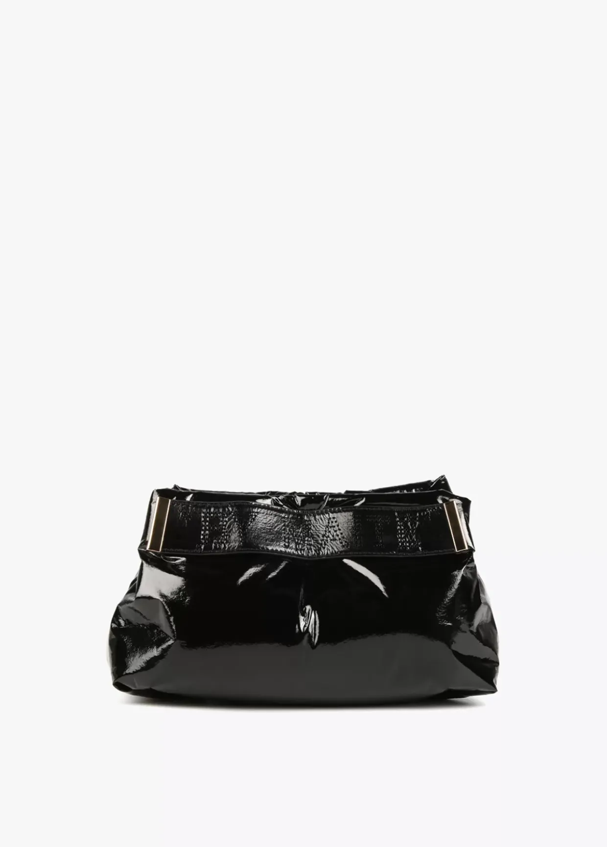Bolso tipo bandolera efecto charol brillante con asa bandolera de cadena extraíble y cinta logotipada en parte frontal. Cierre con botón imantado y bolsillo interior.