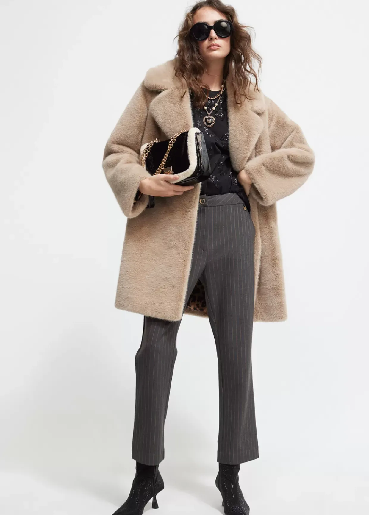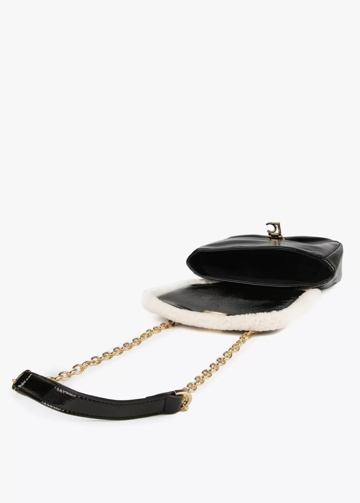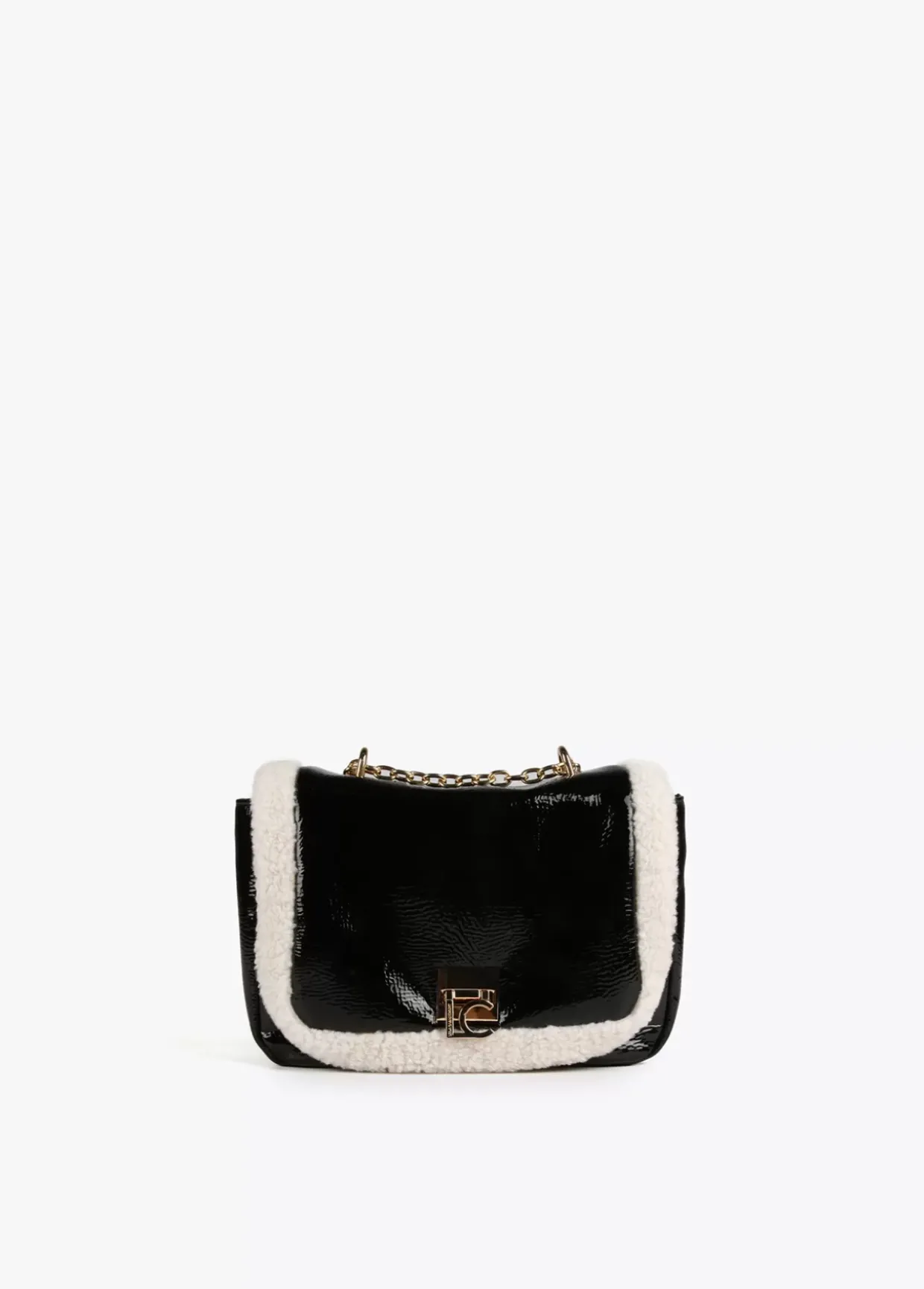 Bolso tipo bandolera en efecto piel brillante y borreguito combinados. Cierre con letras logotipo a modo de hebilla en solapa. Asa bandolera de cadena con zona protectora en efecto piel.