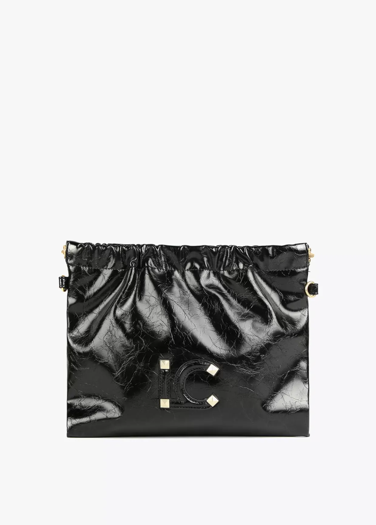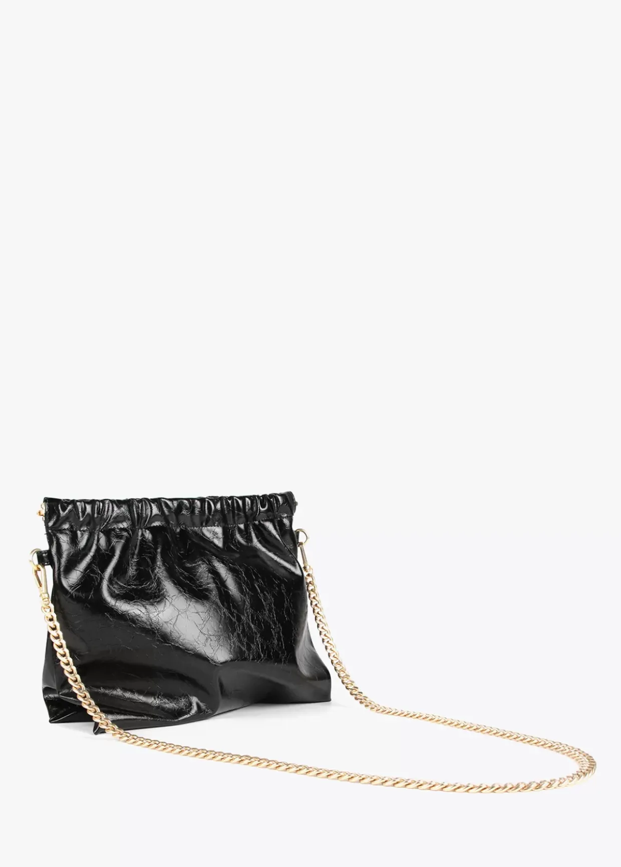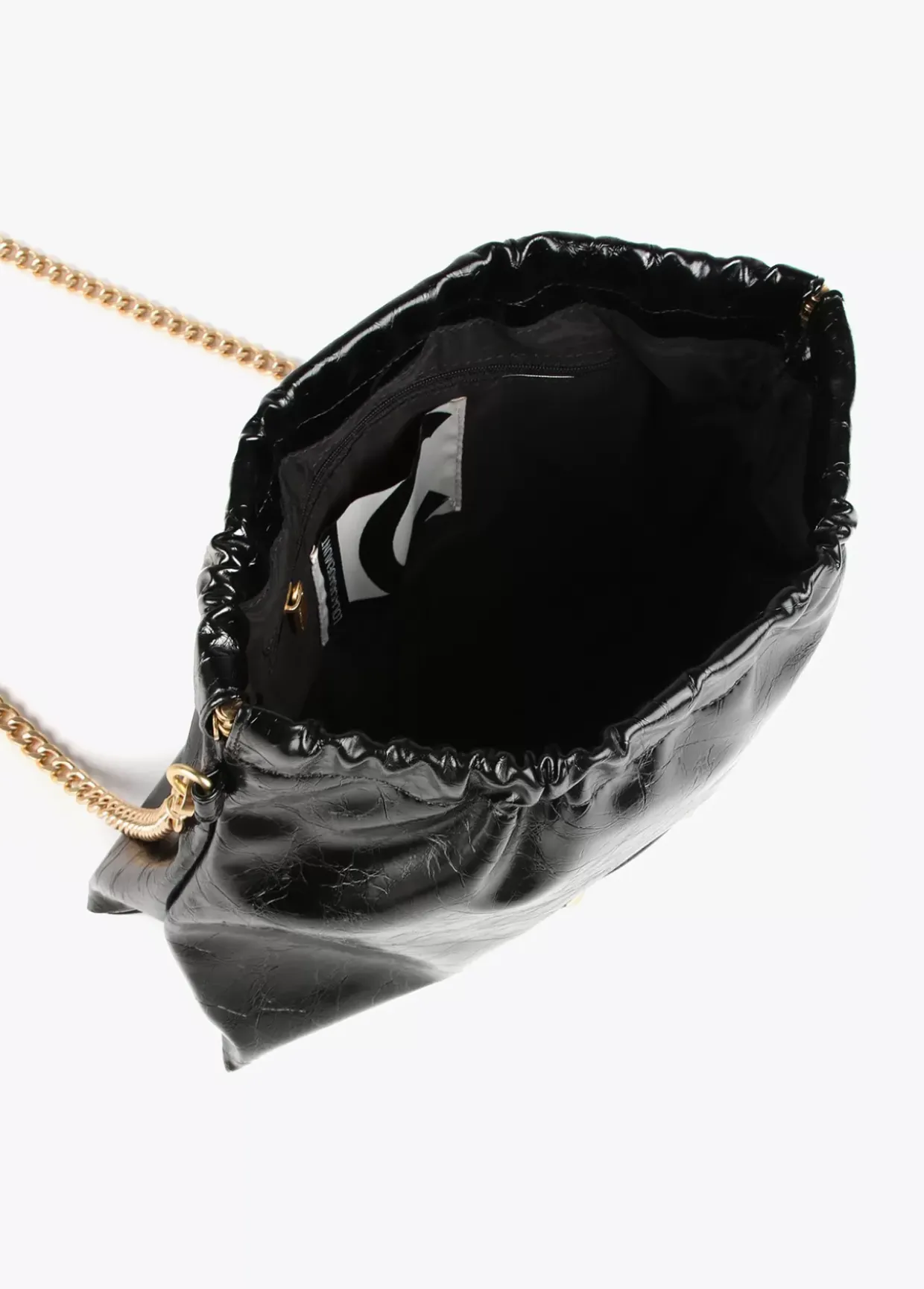 Bolso tipo bandolera en efecto piel brillante y mega logo en parte frontal. Asa bandolera de cadena dorada extraíble.