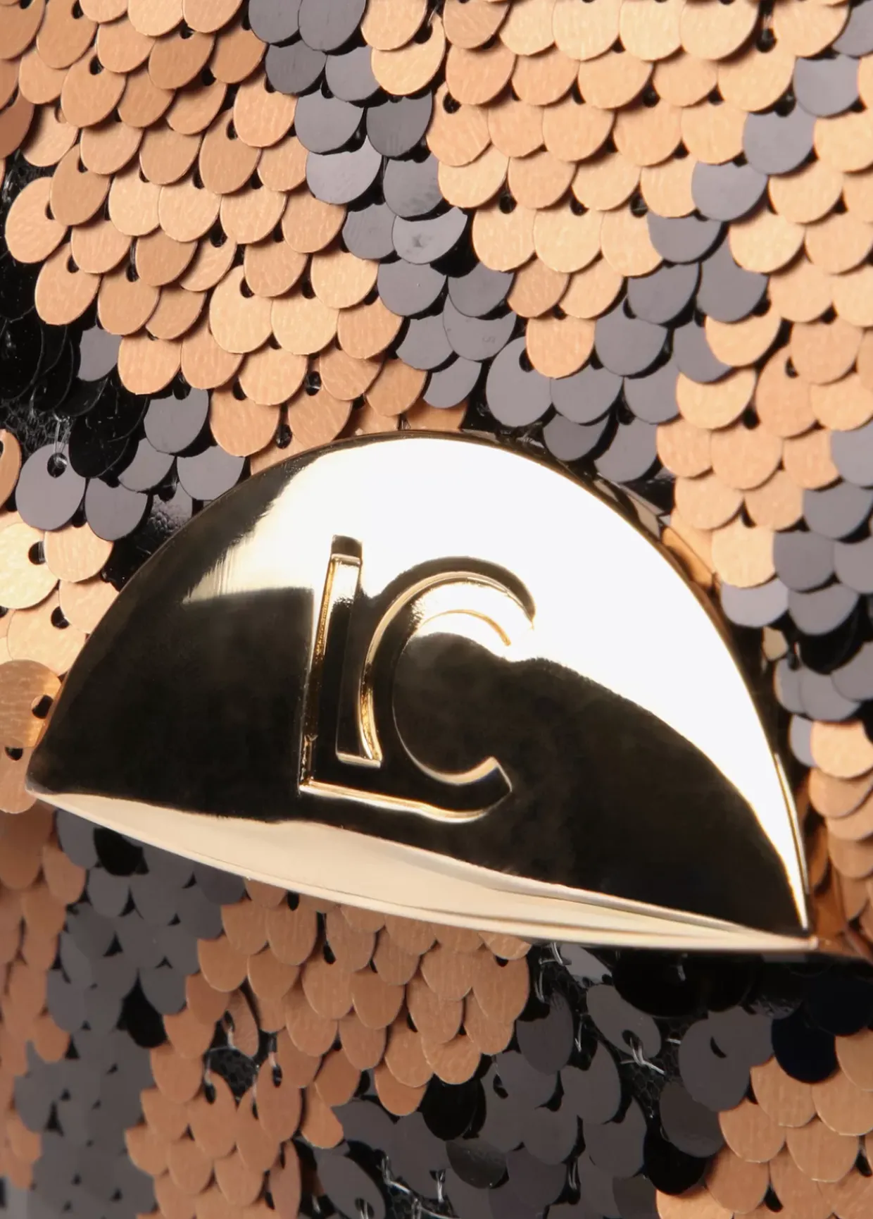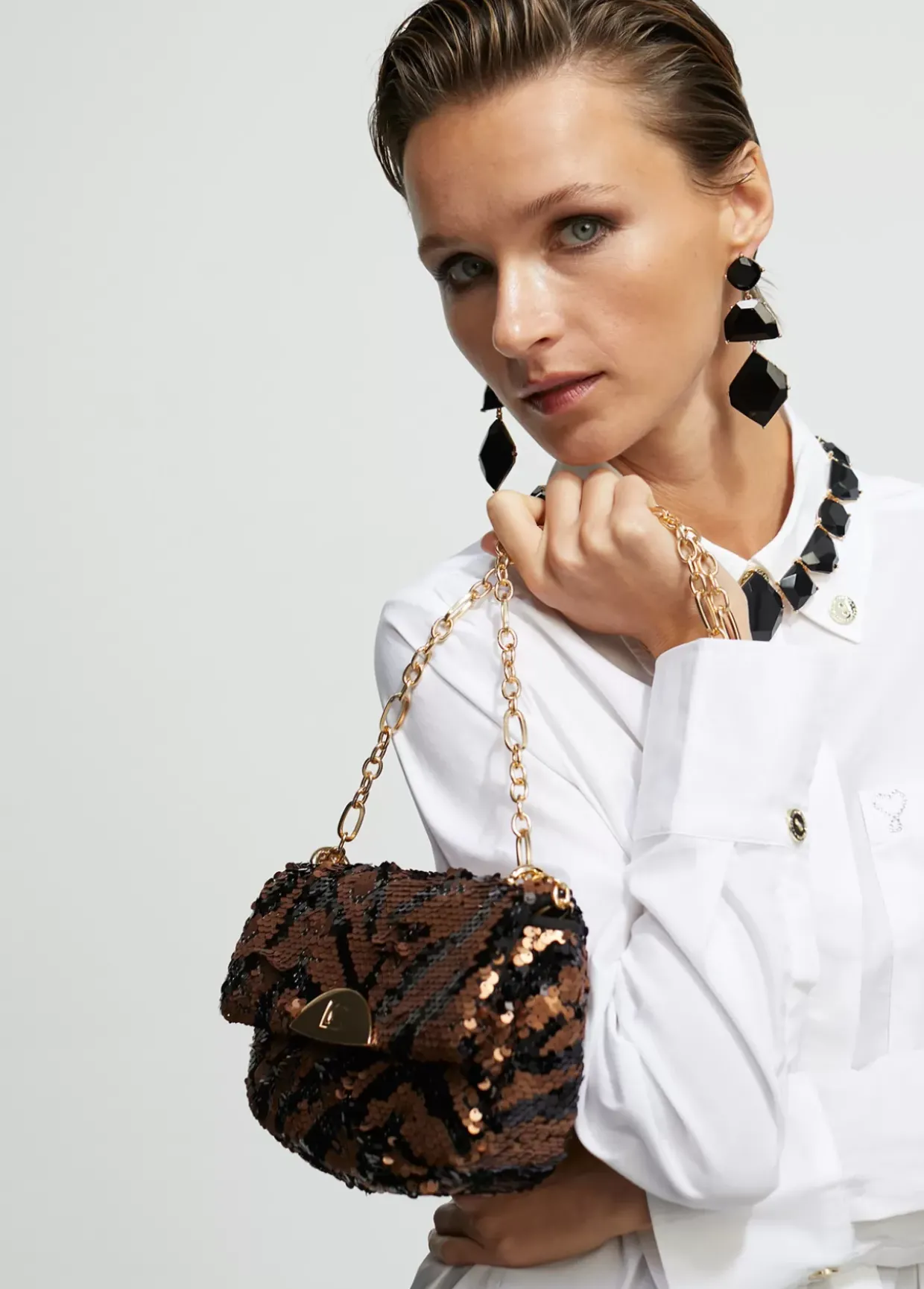 Bandolera con lentejuelas y detalles dorados. Cierre con botón imantado en solapa y asa bandolera de cadena dorada.