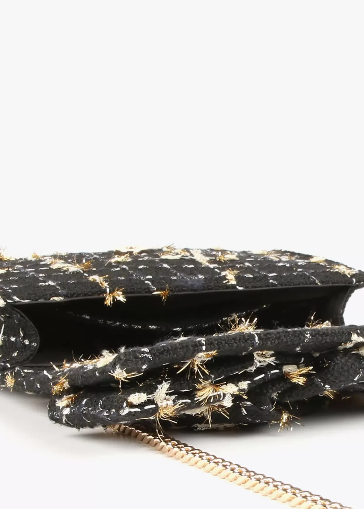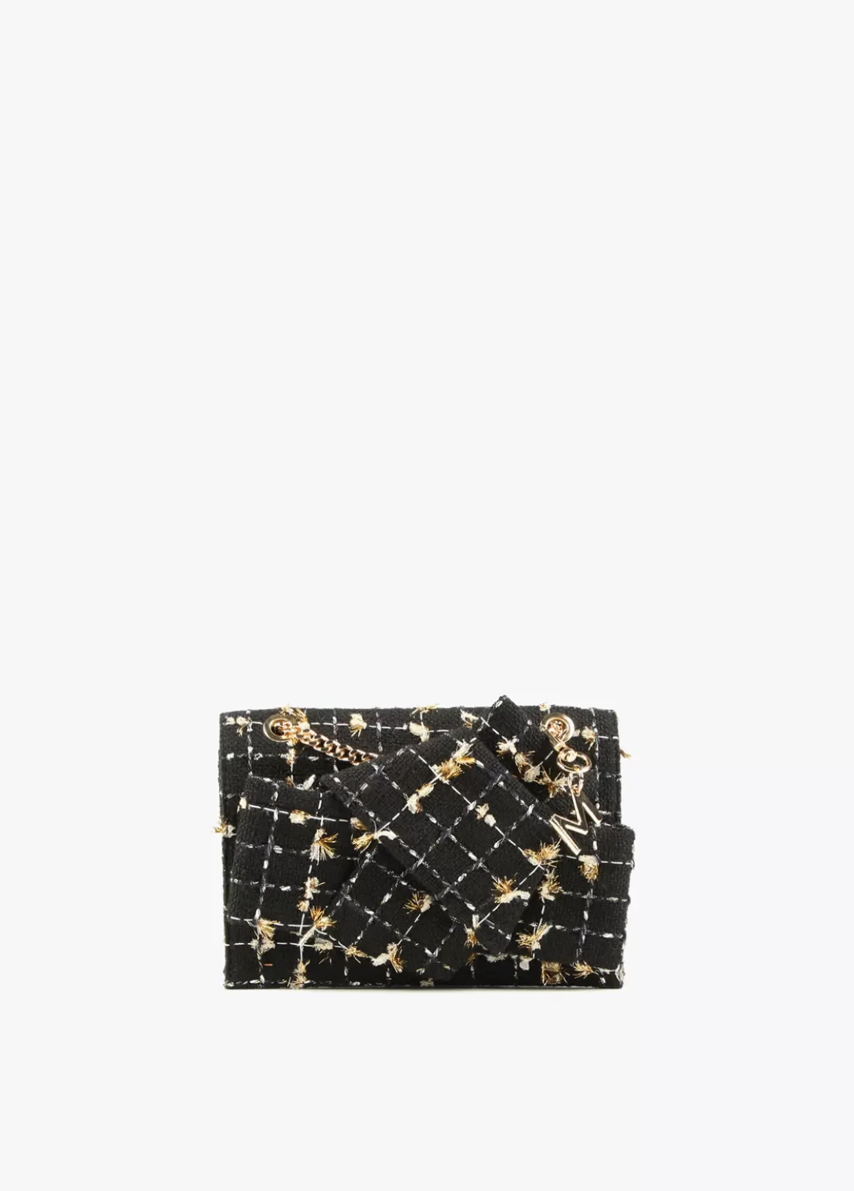 Bolso tipo bandolera en tejido tweed con lazo en la solapa. Asa bandolera de cadena dorada convertible en asas de hombro y cierre con botón imantado.