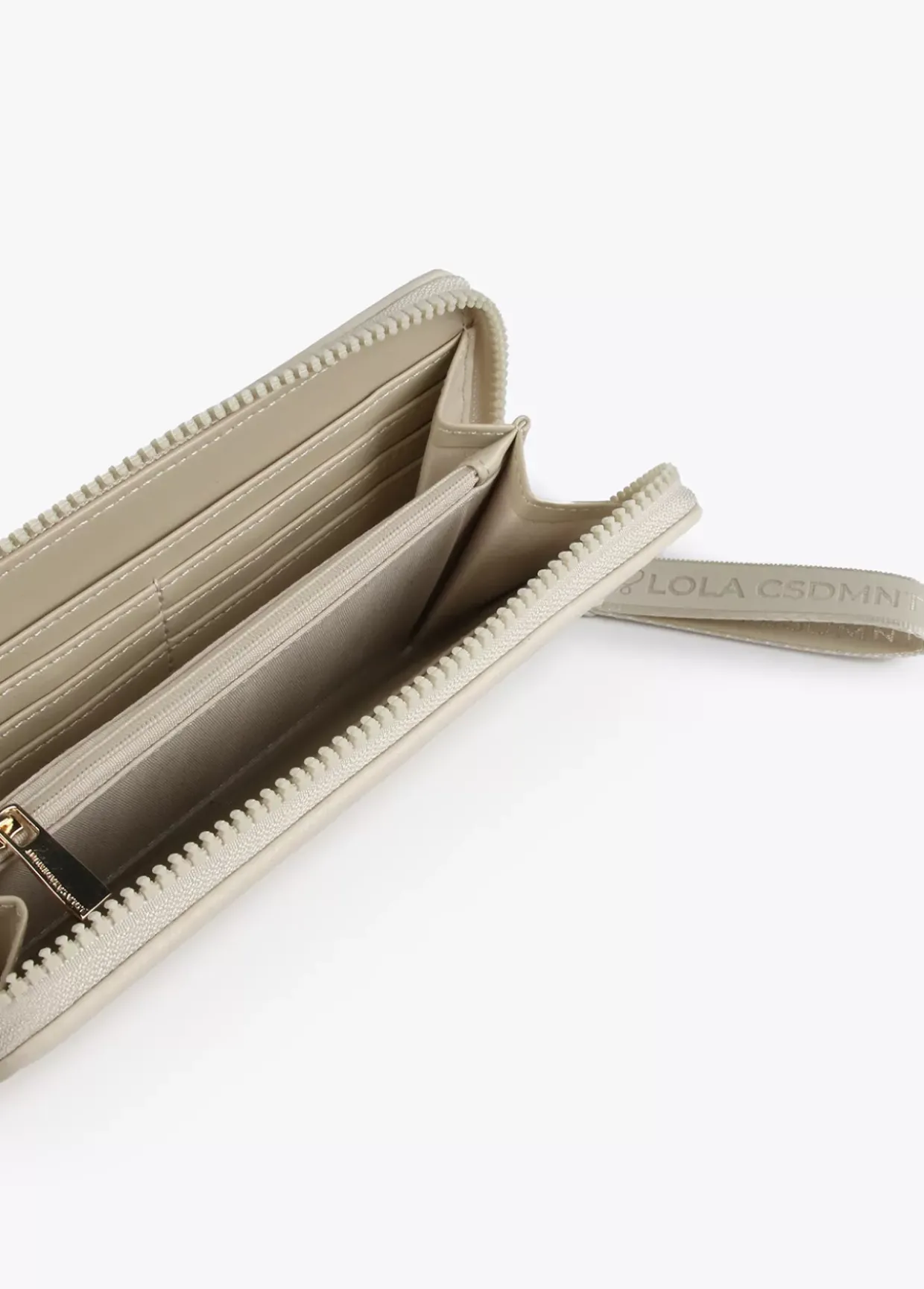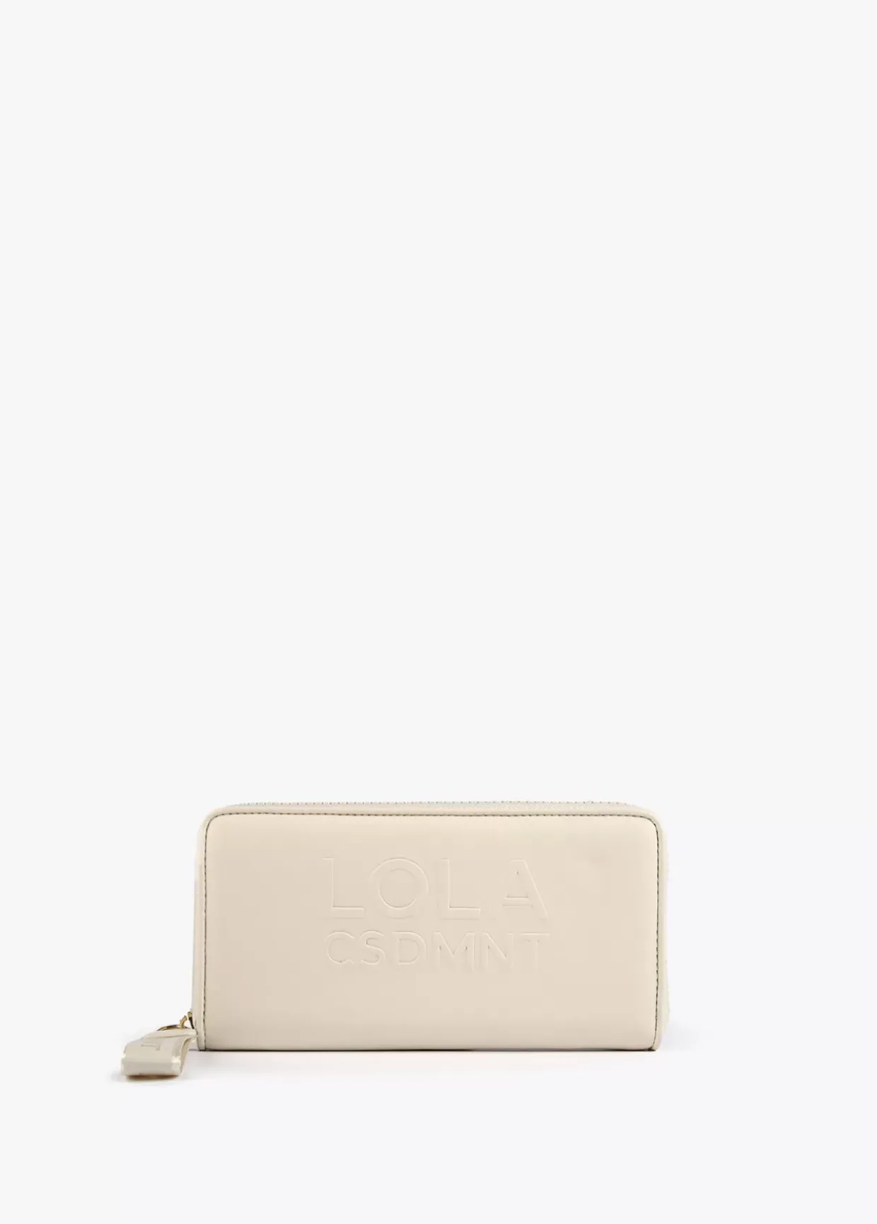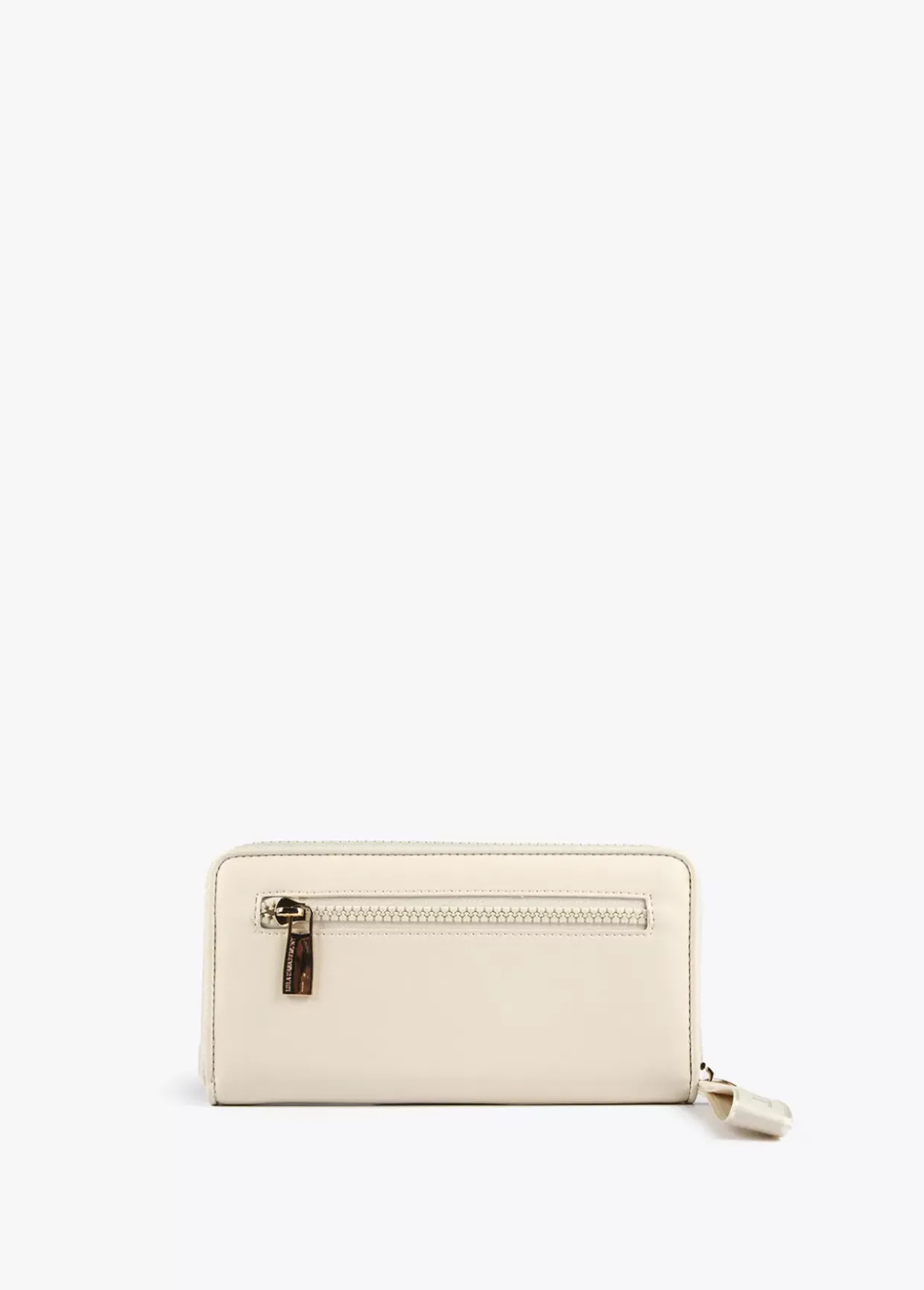 Billetero grande en efecto piel y logo en relieve. Asa de mano logotipada, cierre de cremallera y logo lacado en parte frontal.