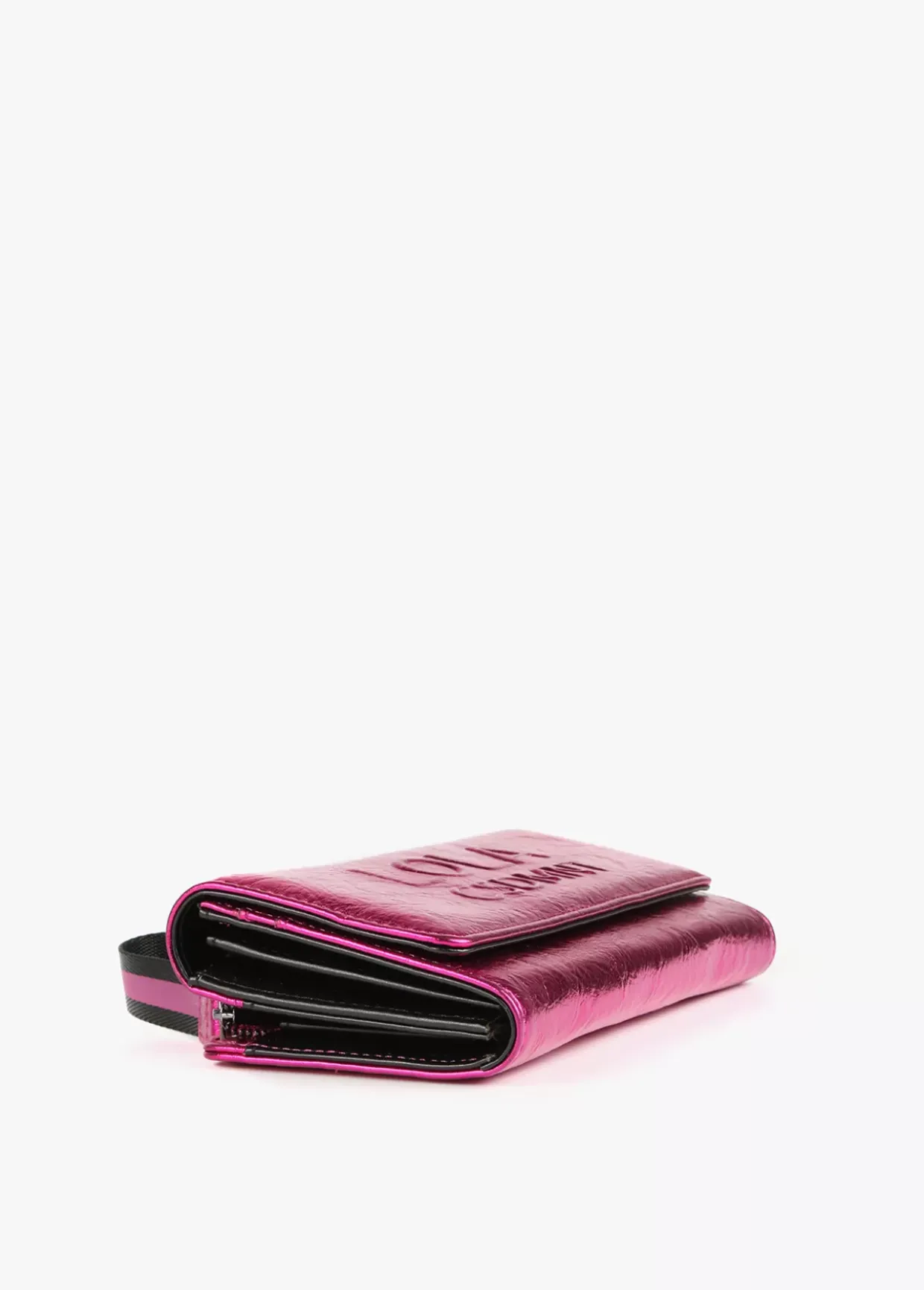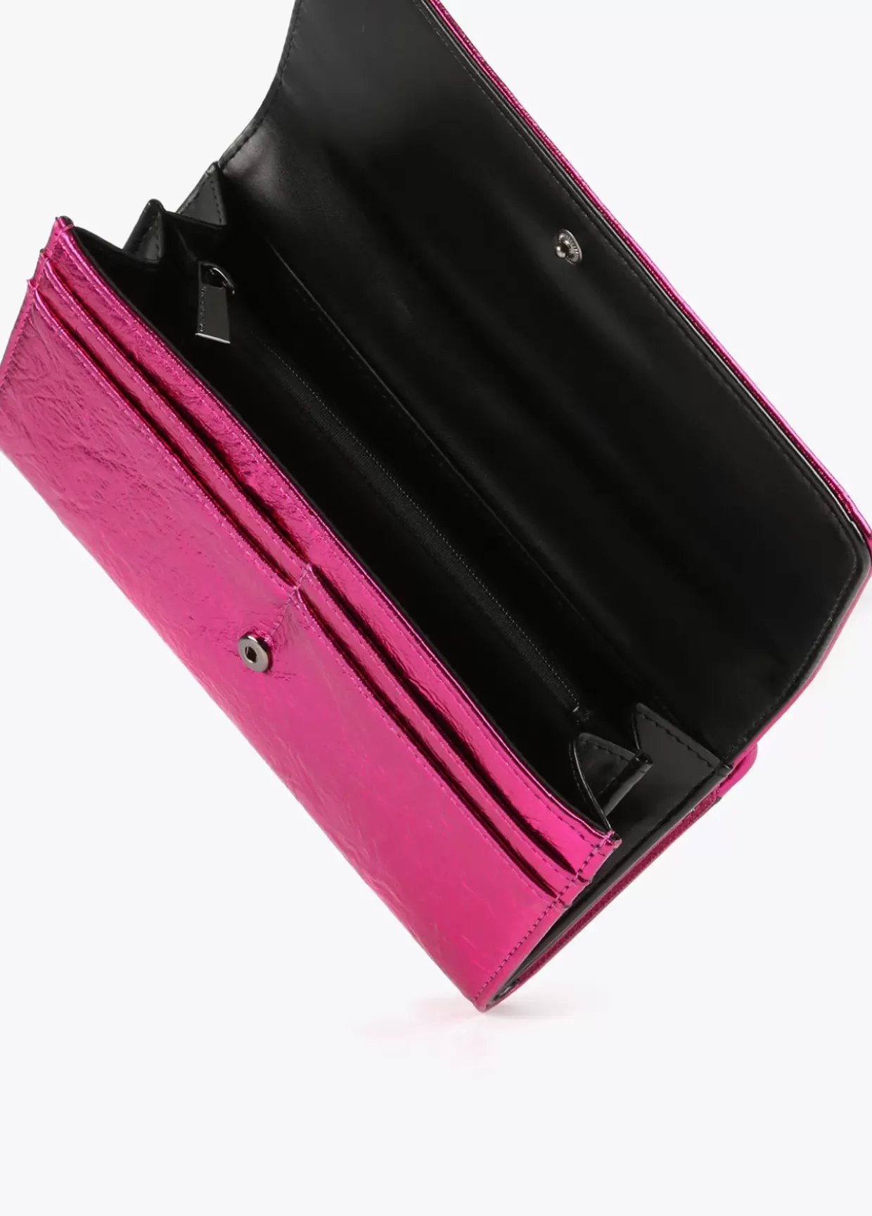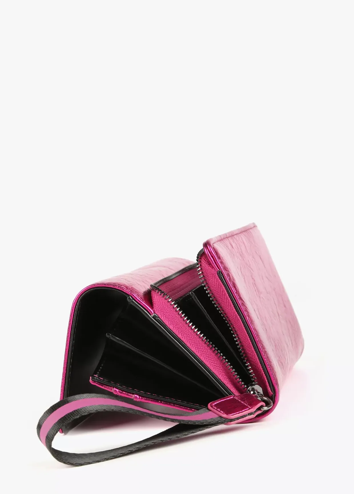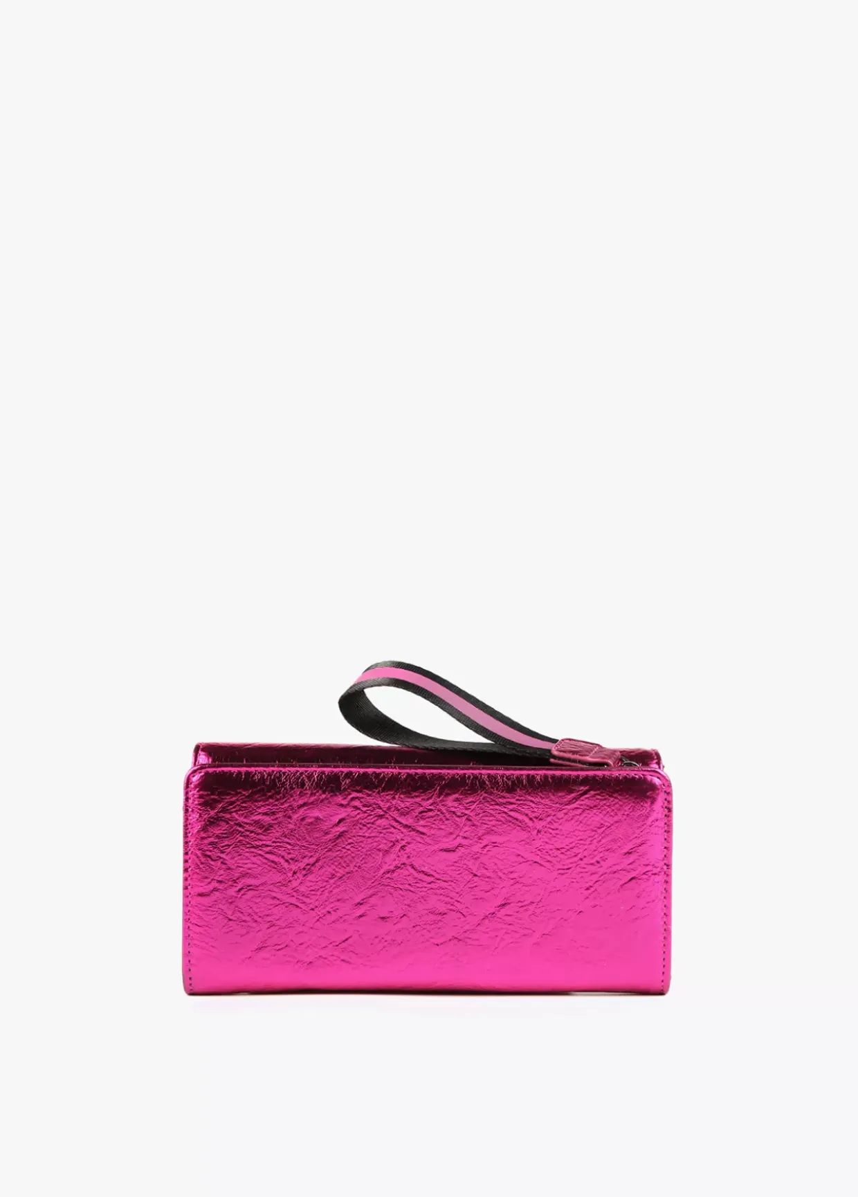 Billetero grande metalizado con logo grabado en parte frontal. Cierre con cremallera y botón clic. Detalle asa de mano.