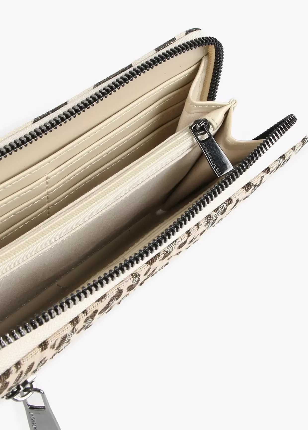 Billetero grande con estampado animal zebra. Cierre con cremallera, bolsillo exterior y letras logo doradas en parte frontal.