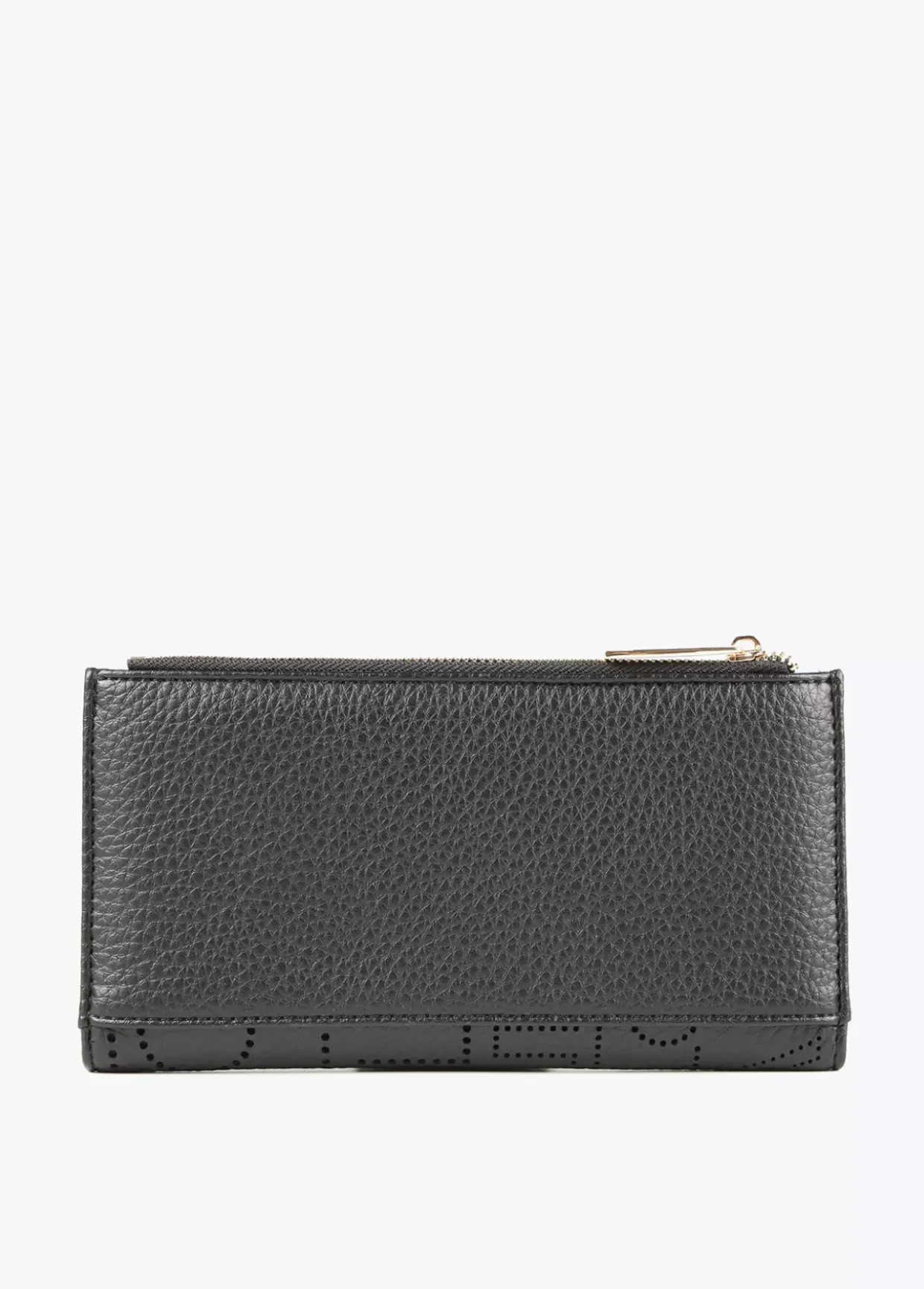 Billetero grande con logotipo troquelado. Cierre con cremallera en monedero y cierre con botón clic en zona tarjetero.