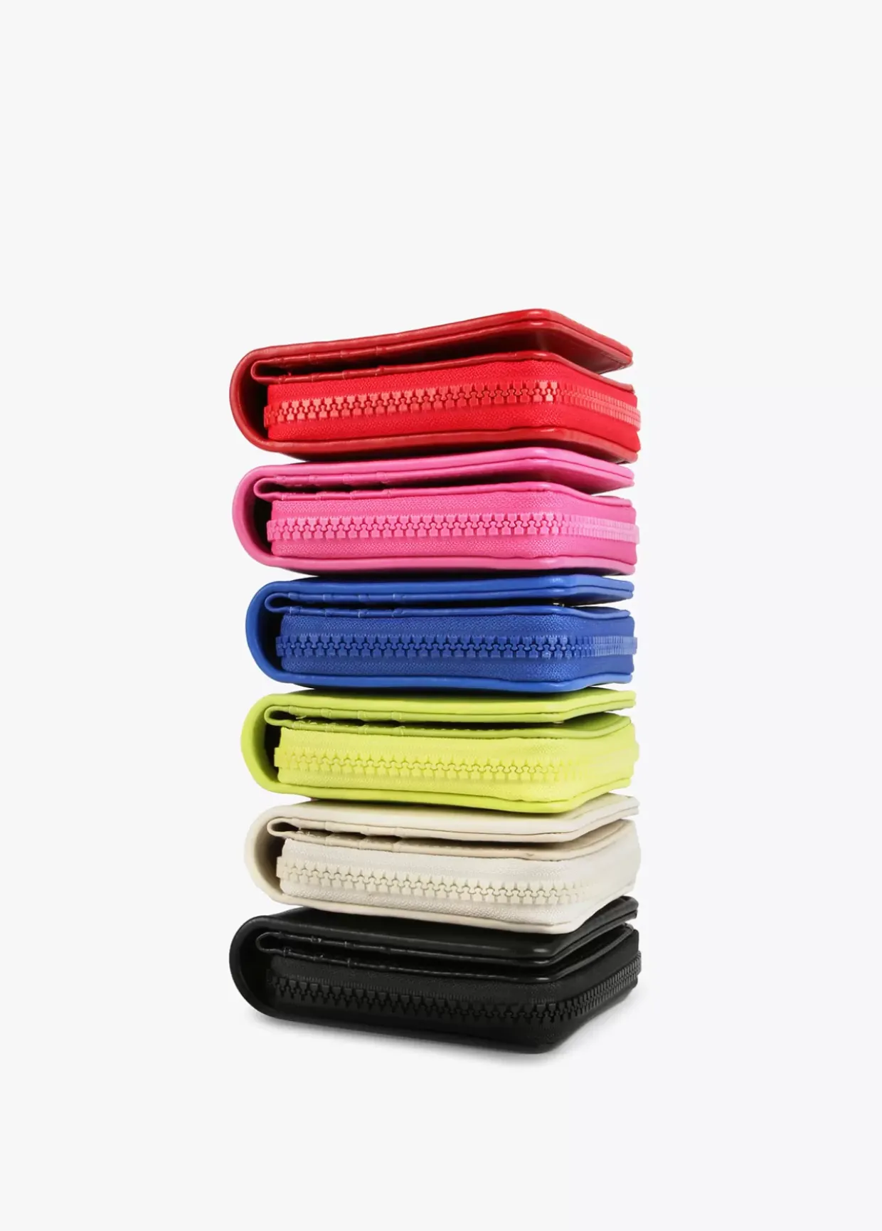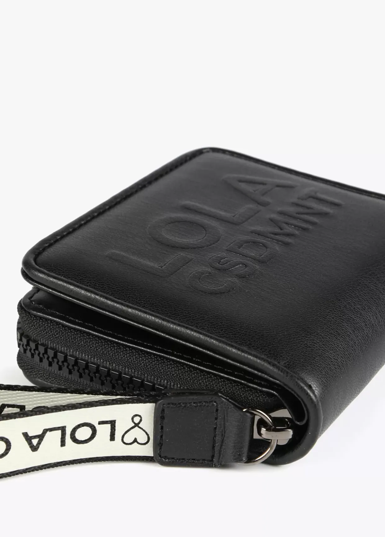 Billetero pequeño en efecto piel y logo en relieve. Asa de mano logotipada, cierre de cremallera y logo lacado en parte frontal.