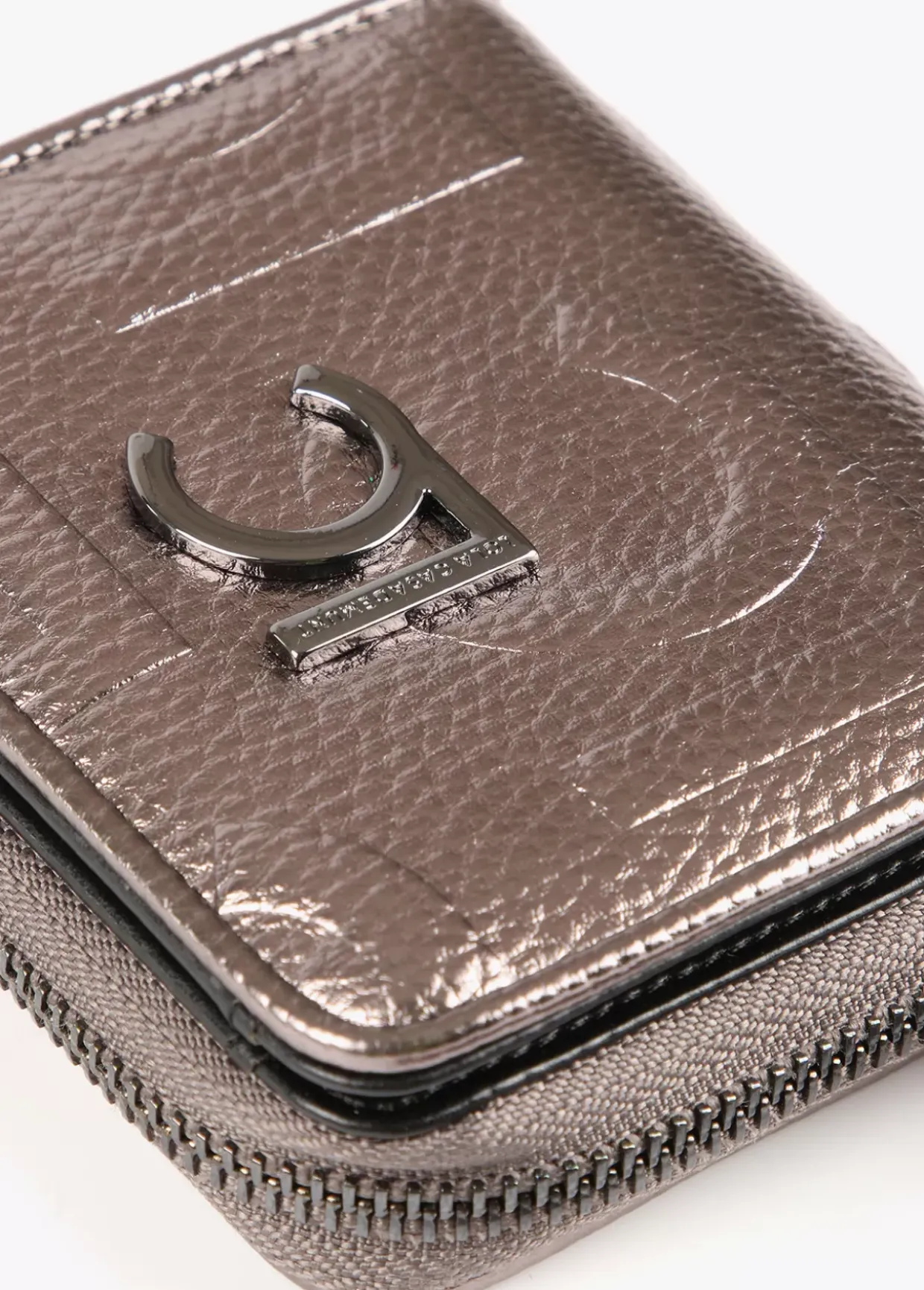 Billetero pequeño en efecto piel metalizado y logo grabado. Cierre de cremallera y asa de mano.