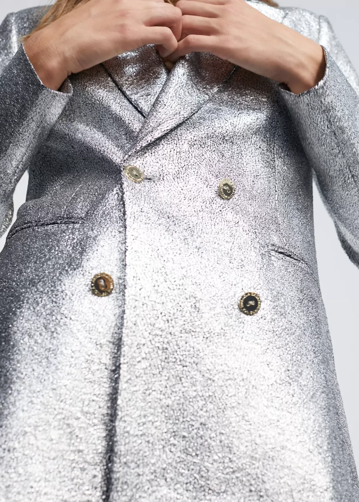 Blazer cruzada en tejido fantasía craquelado plata. Cuello solapa. Botones frontales metálicos y bolsillos tipo vivo.