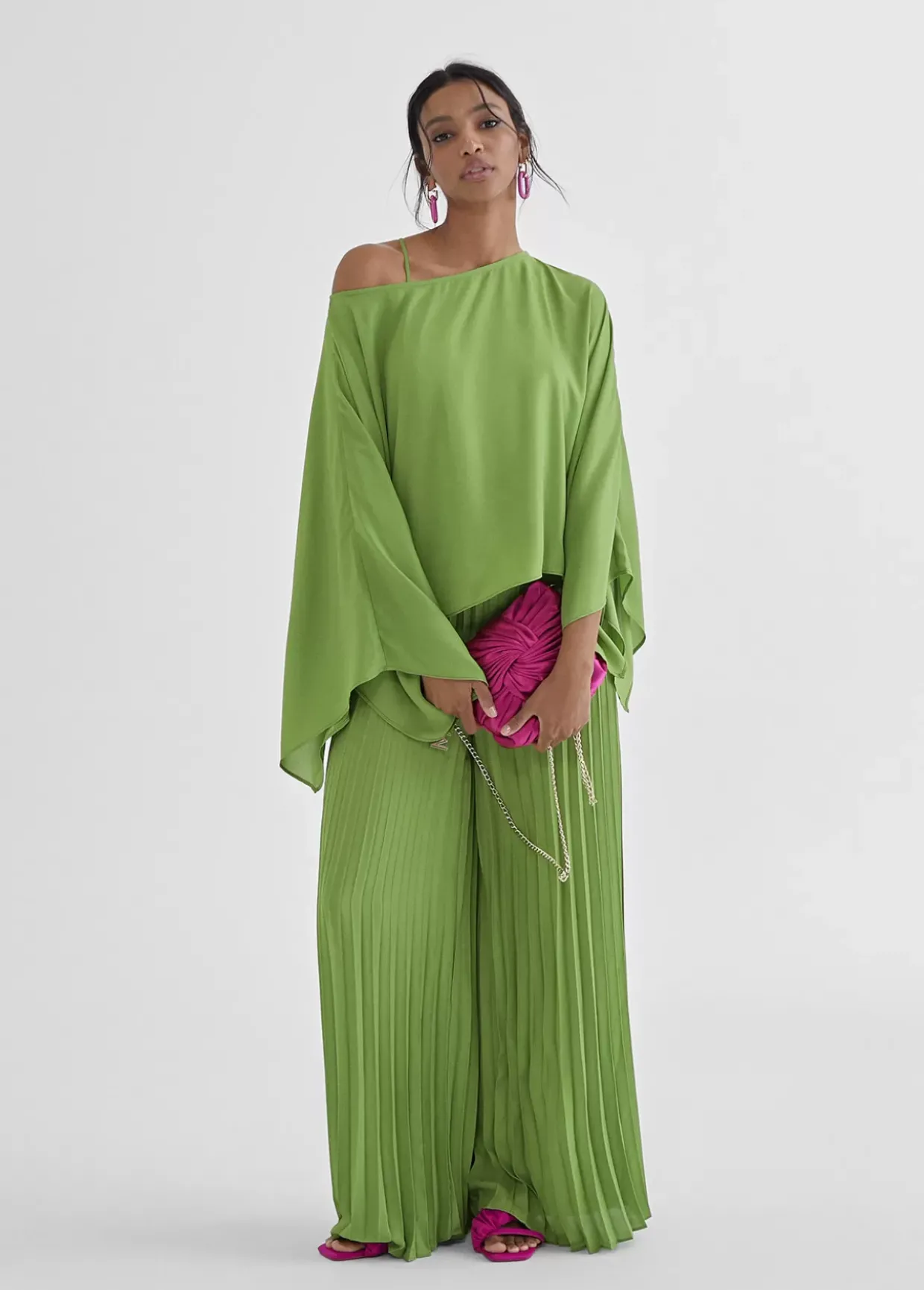 Blusa tipo capa satinada con manga ancha . Largo hasta cintura.