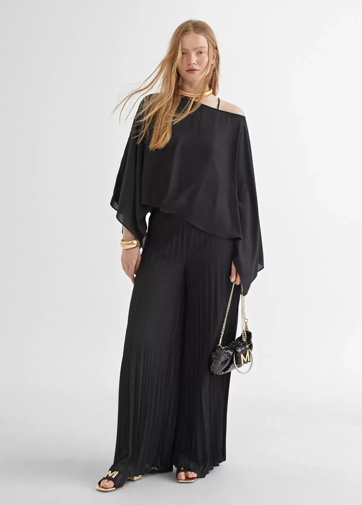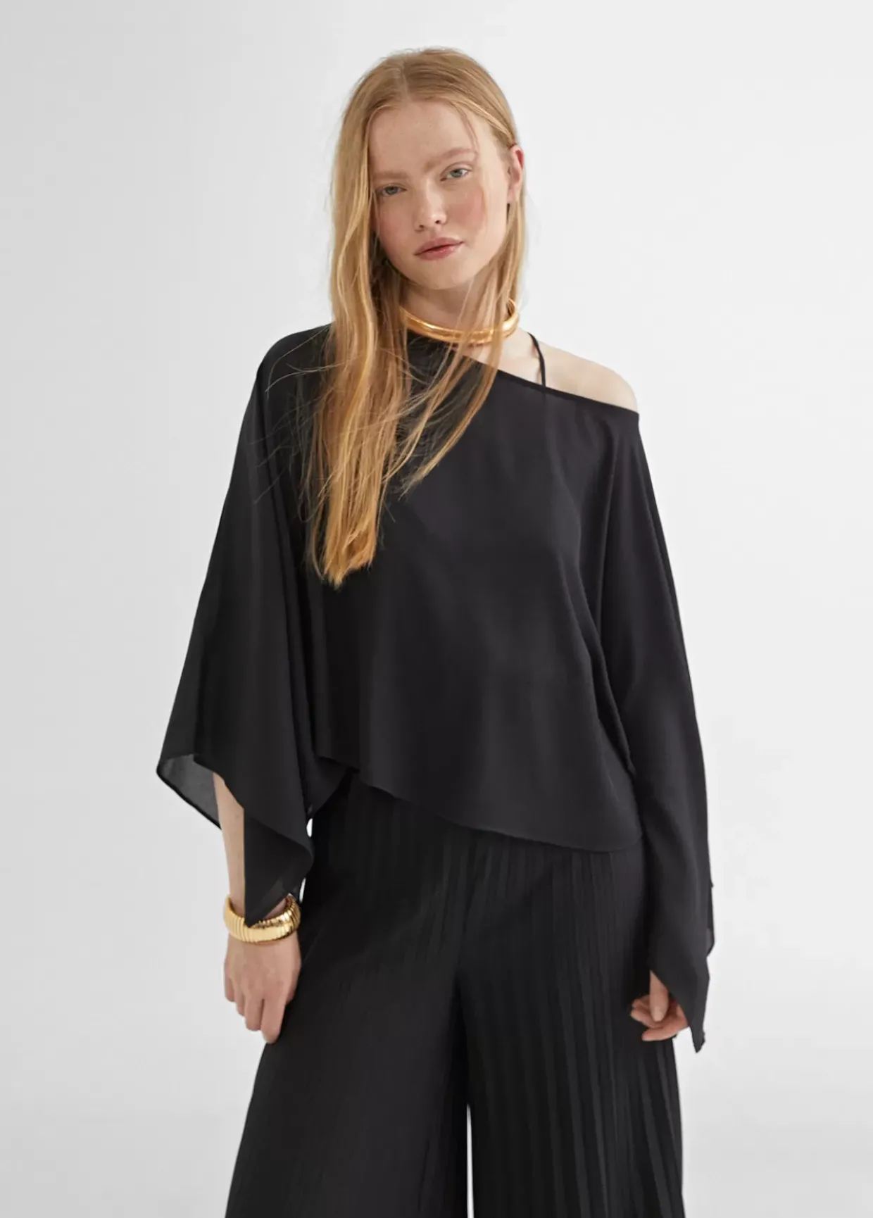 Blusa tipo capa satinada con manga ancha. Largo hasta cintura.
