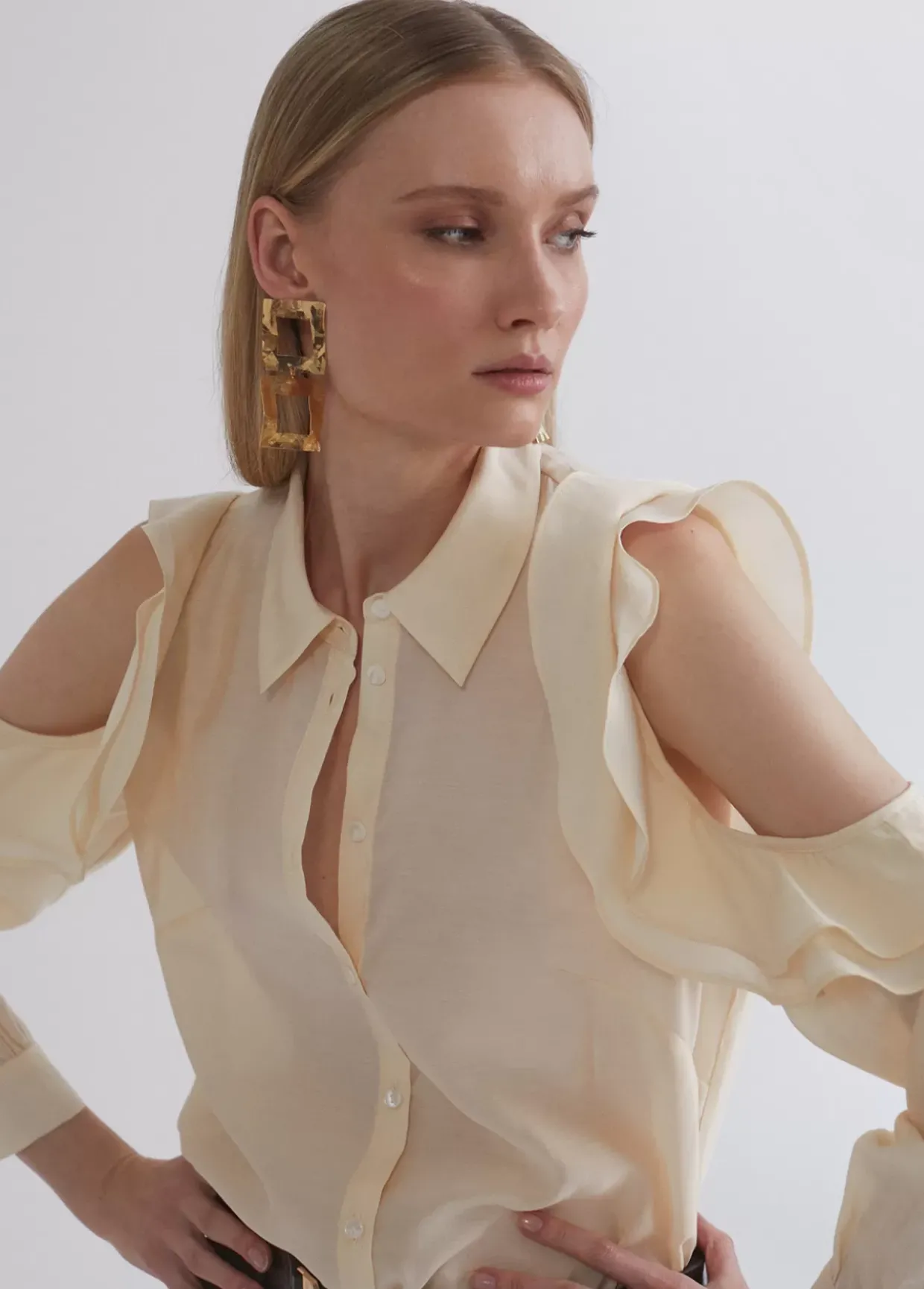 Blusa fluida con manga de volantes y hombros descubiertos. Cuello y puños camisero y cierre con botones a tono.