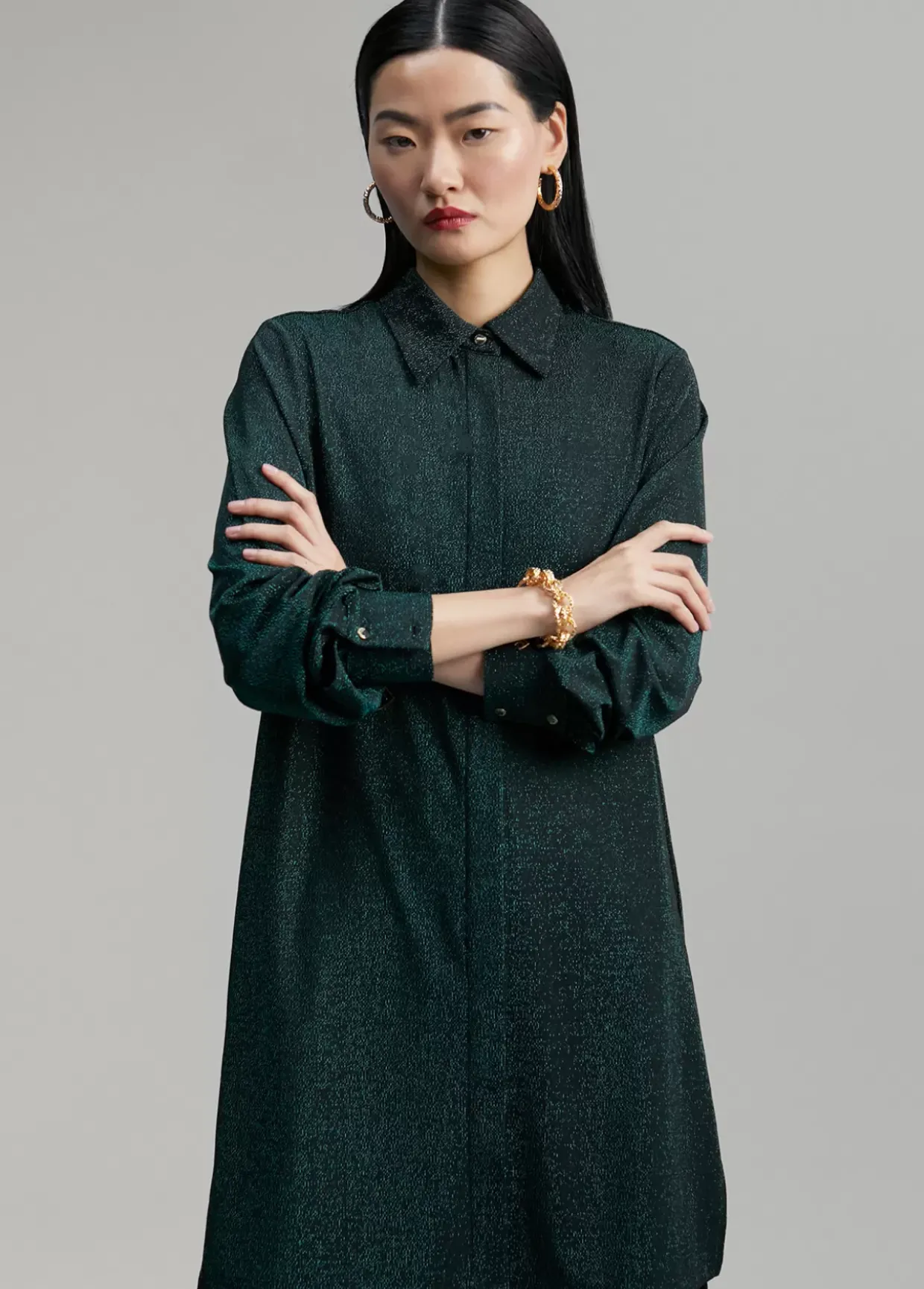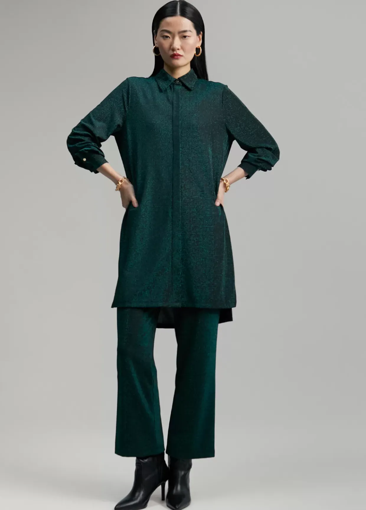 Blusón largo de punto con lúrex. Cuello camisero y cerrado con botones frontales y en puños. Aberturas laterales en bajo.