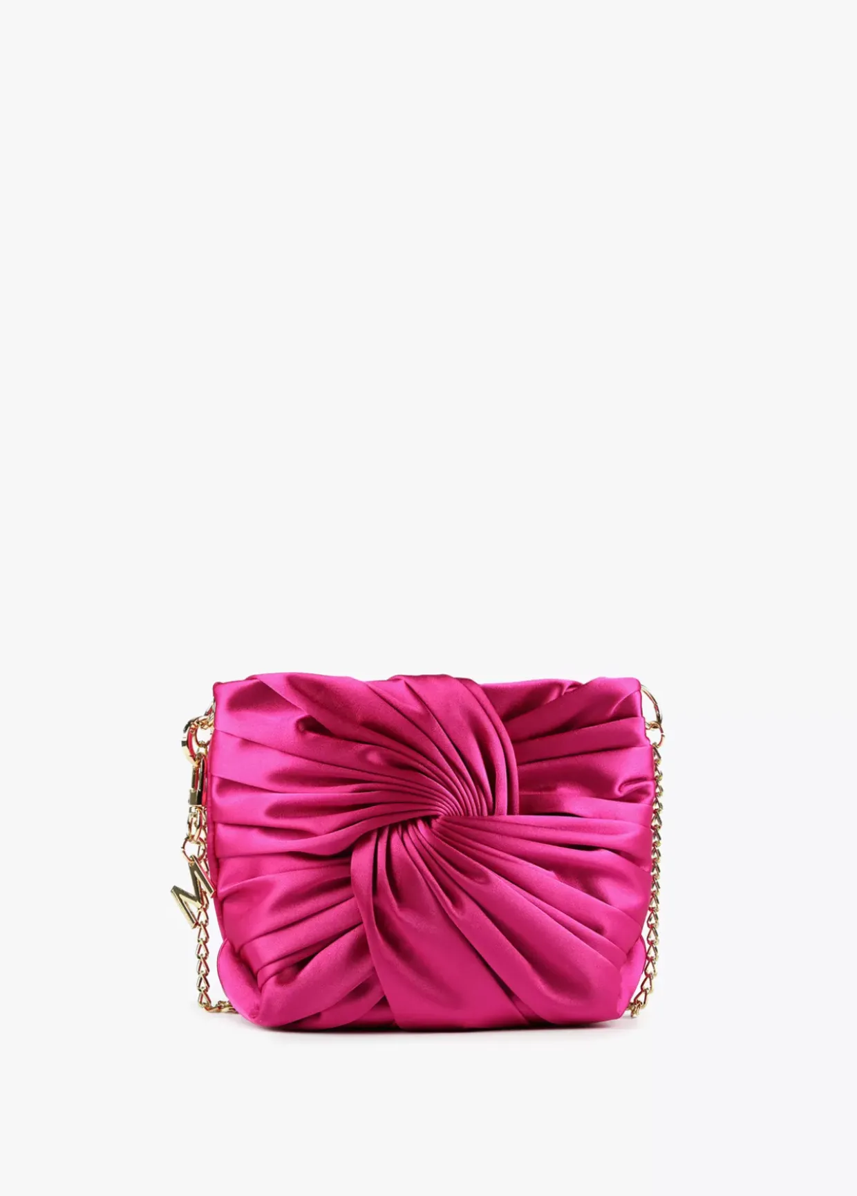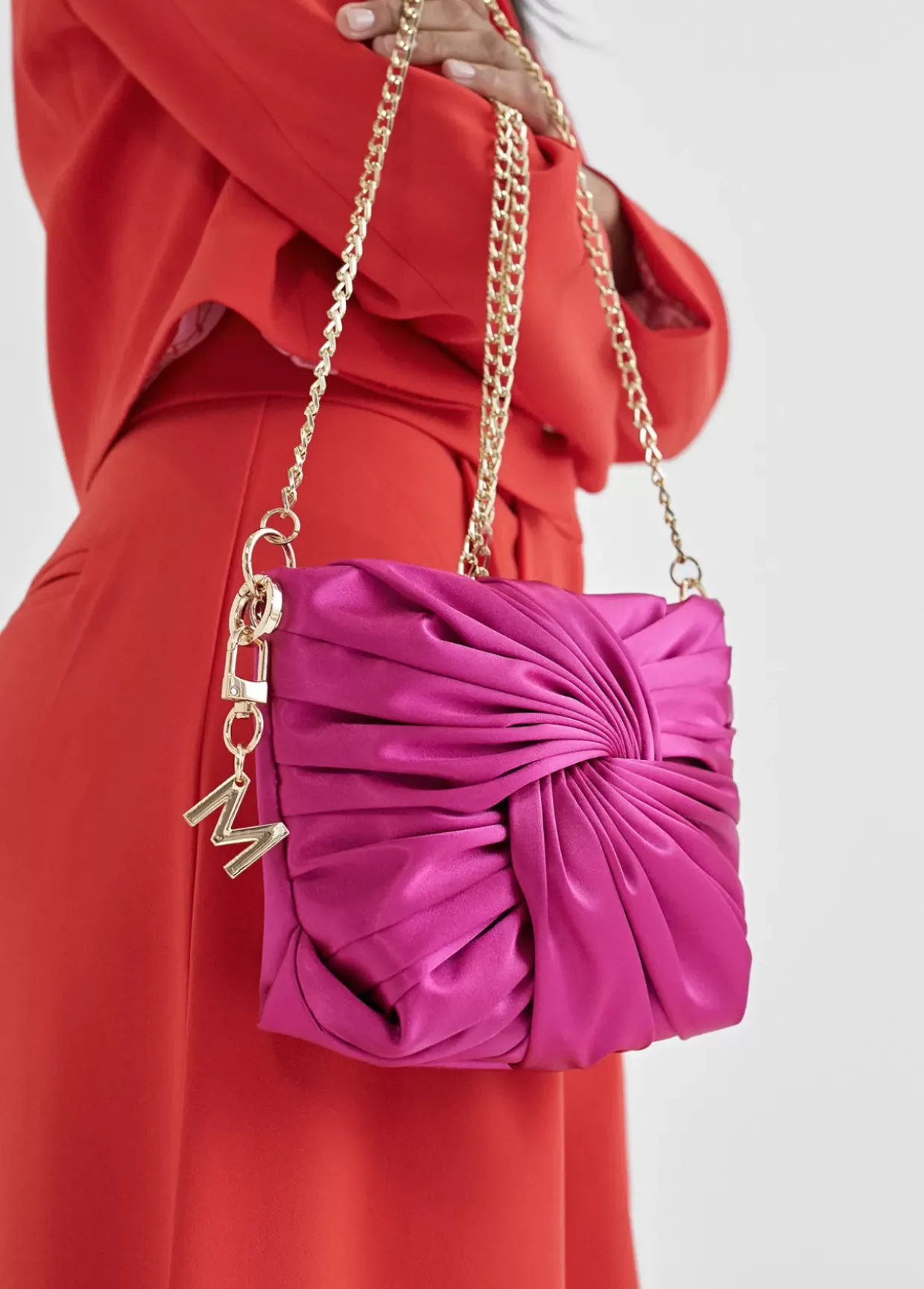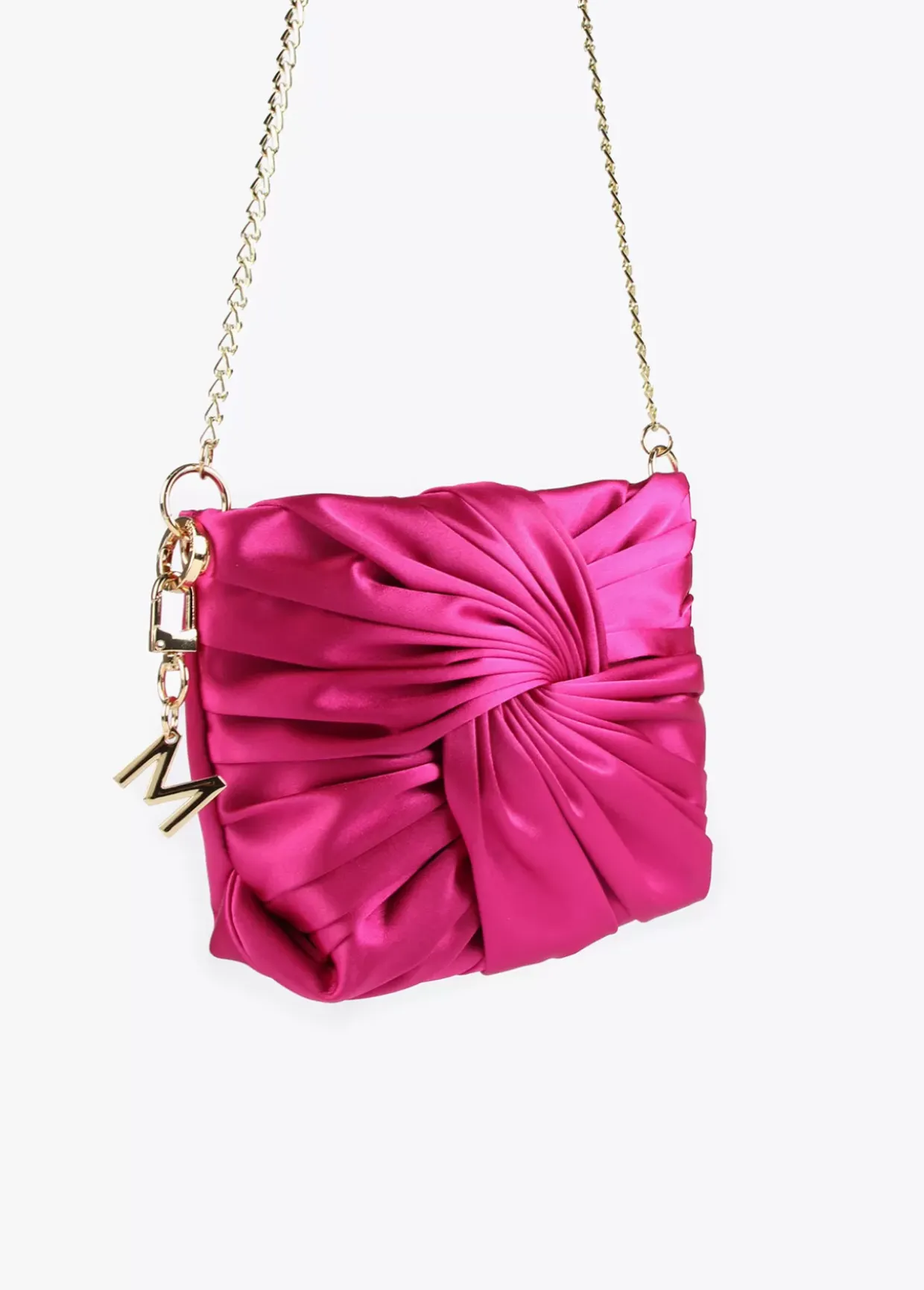 Bolsito bandolera de satén con lazo frontal y asa bandolera de cadena extraíble. Cierre con botón imantado y detalle llavero con letra M dorada.