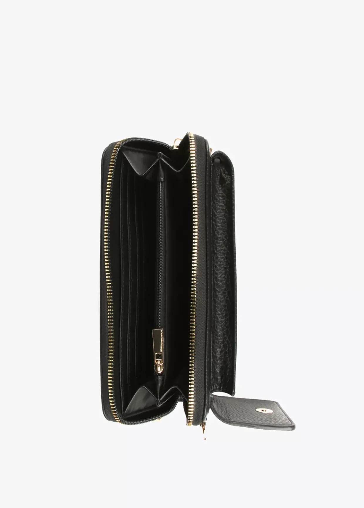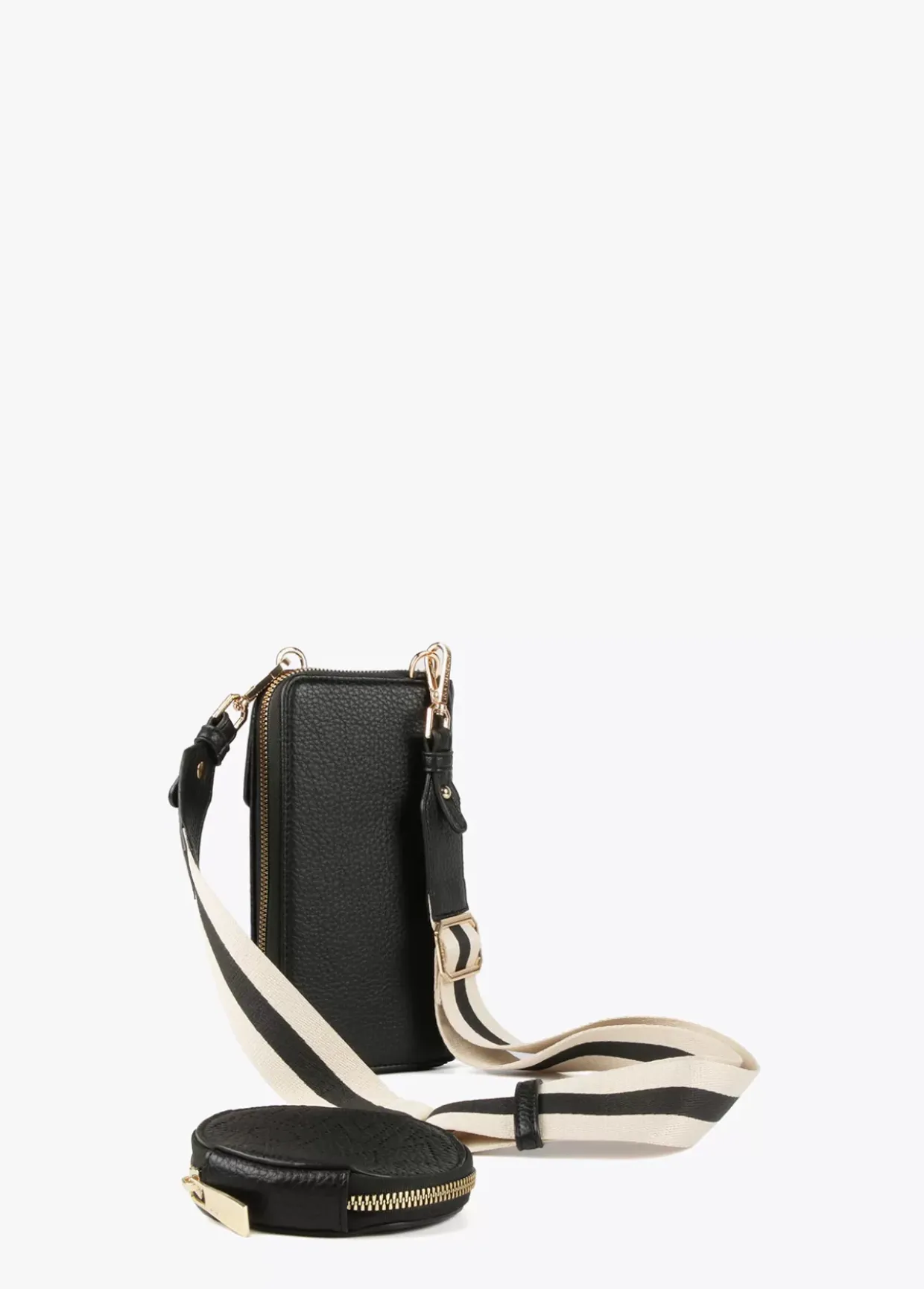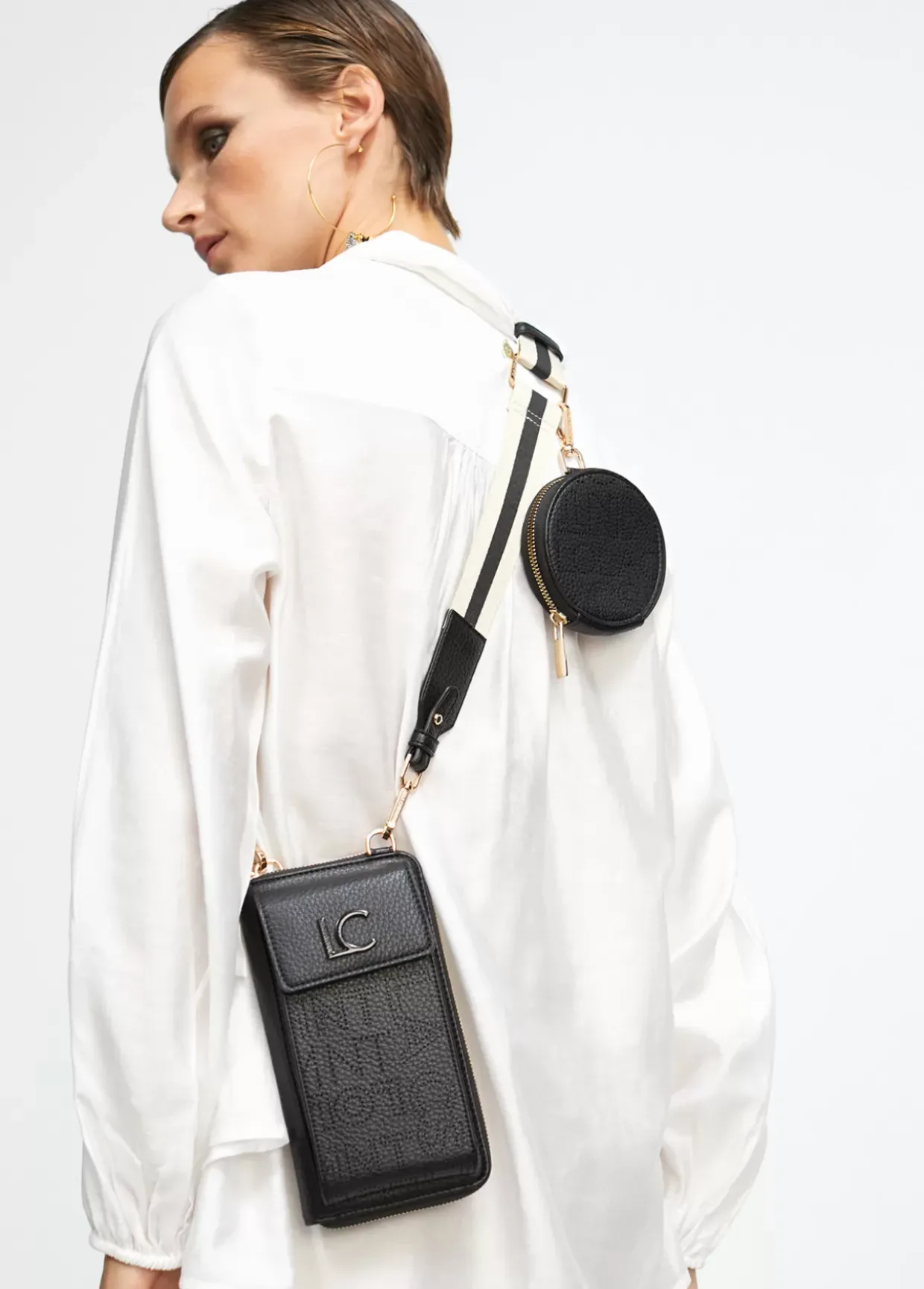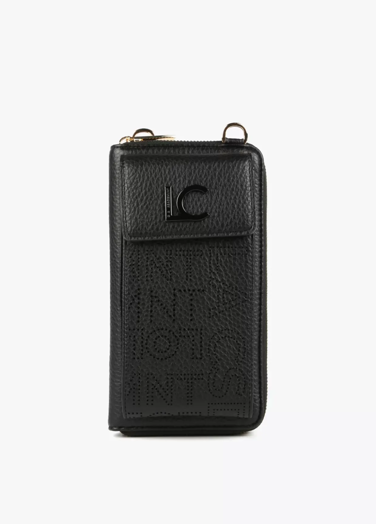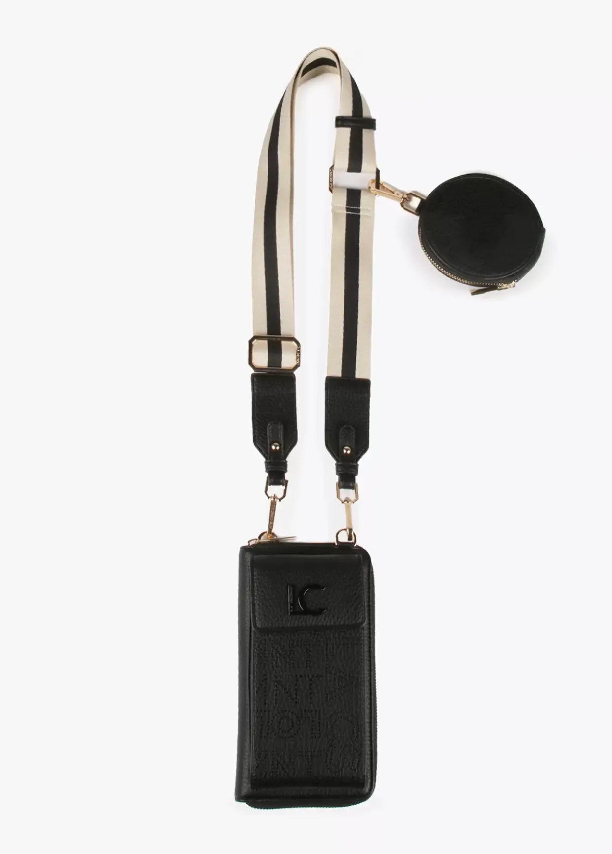 Monedero y bolsito para el móvil con logotipo troquelado y asa bandolera ajustable y extraíble. Detalle monedero en asa bandolera.