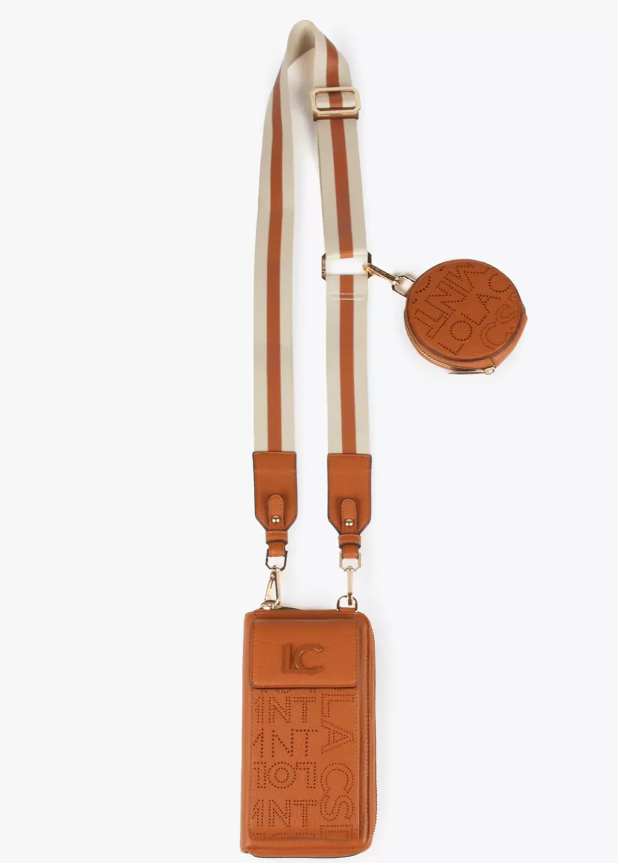 Monedero y bolsito para el móvil con logotipo troquelado y asa bandolera ajustable y extraíble. Detalle monedero en asa bandolera.