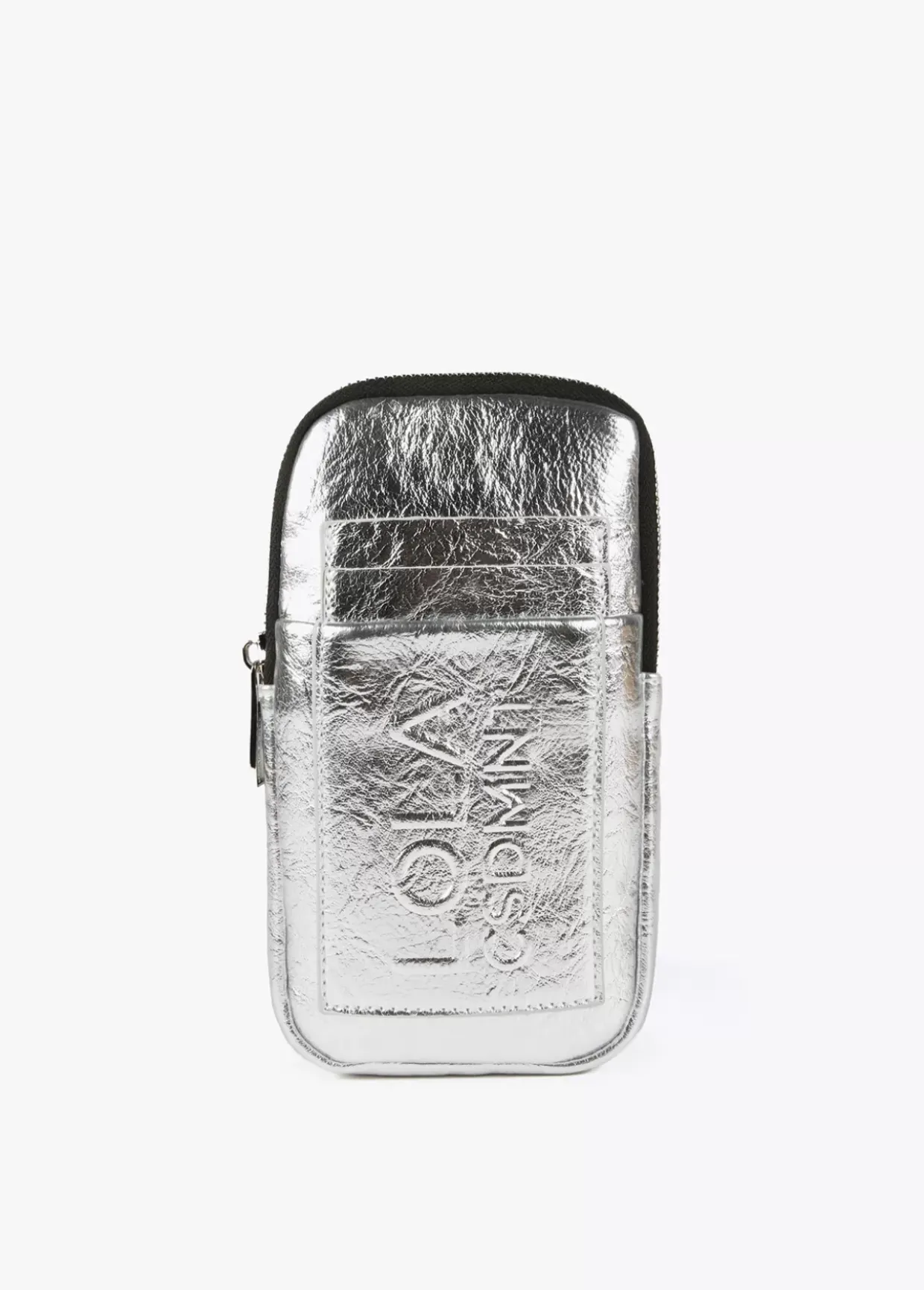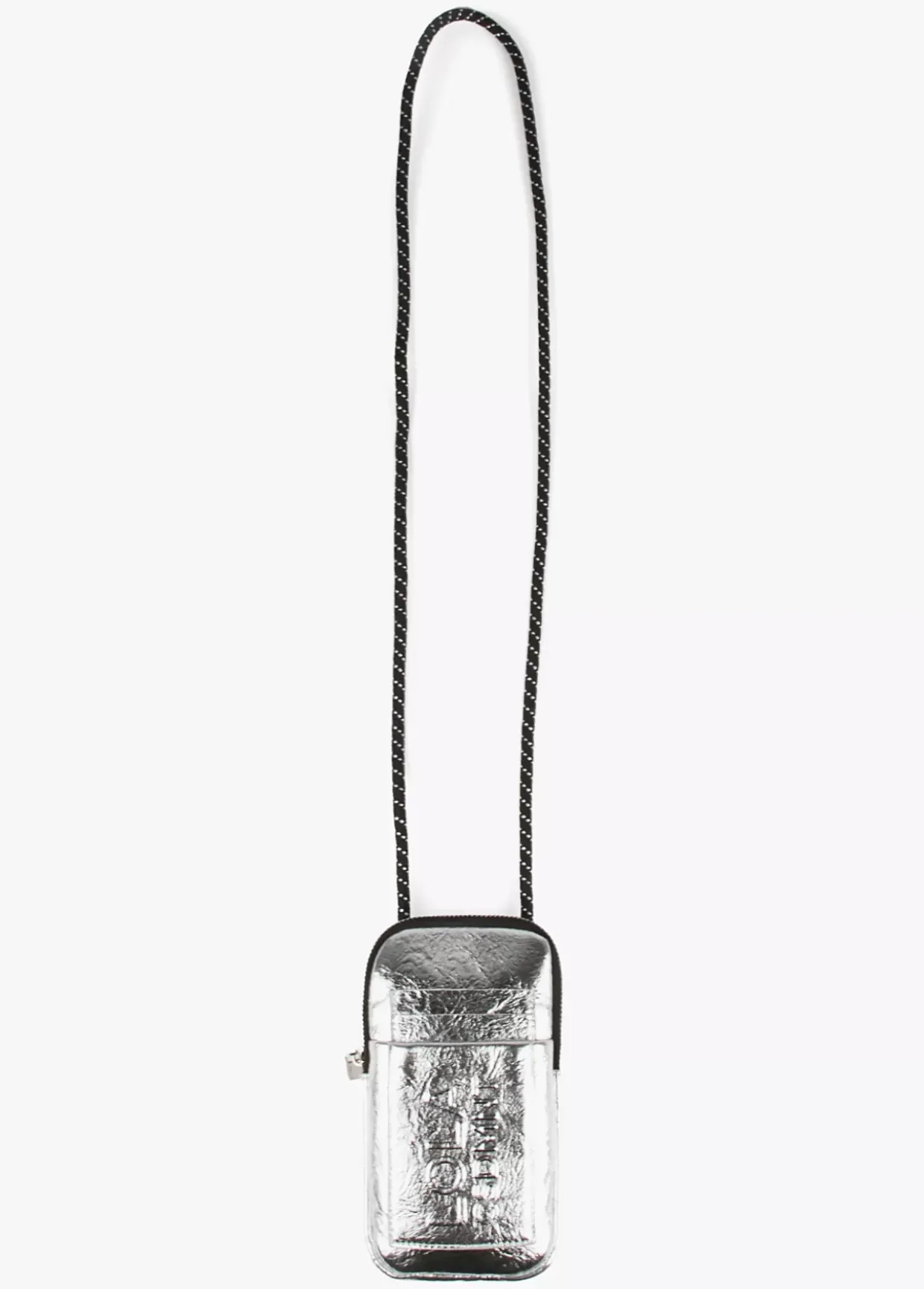 Bolsito porta móvil metalizado con logo grabado en relieve y cierre de cremallera. Asa bandolera de cordón ajustable.