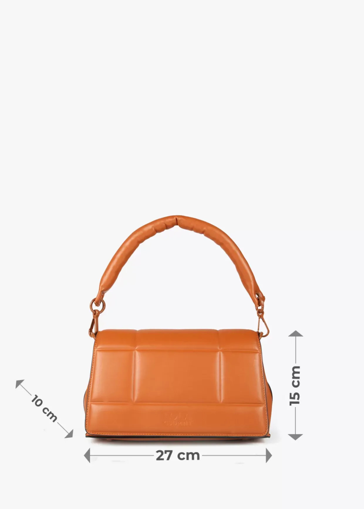 Bolso bandolera acolchada en efecto piel con asas de mano y bandolera extraibles. Cierre con cremallera y solapa con logotipo grabado.