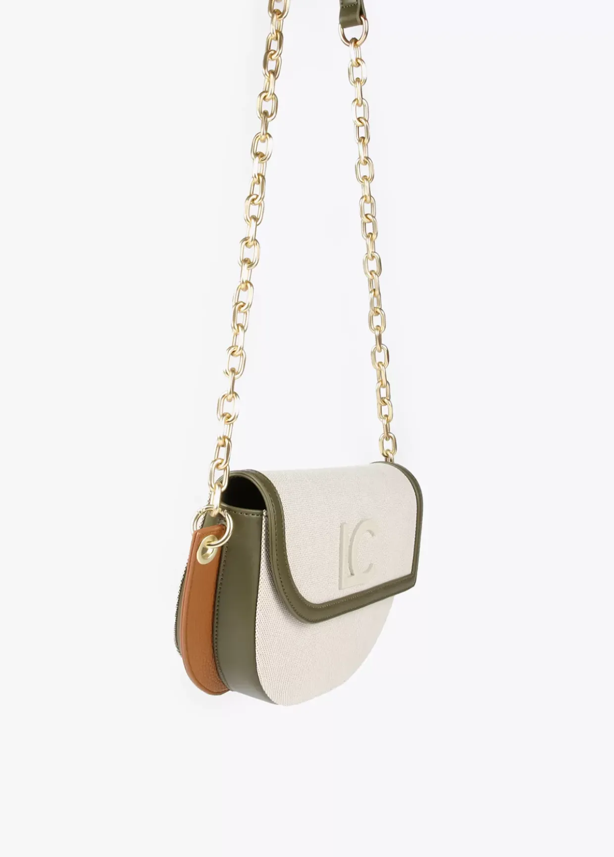Bolso bandolera de diferentes materiales y colores combinados. Asa bandolera de cadena dorada y efecto piel combinados. Cierre de solapa y botó imantado. Logo frontal lacado.