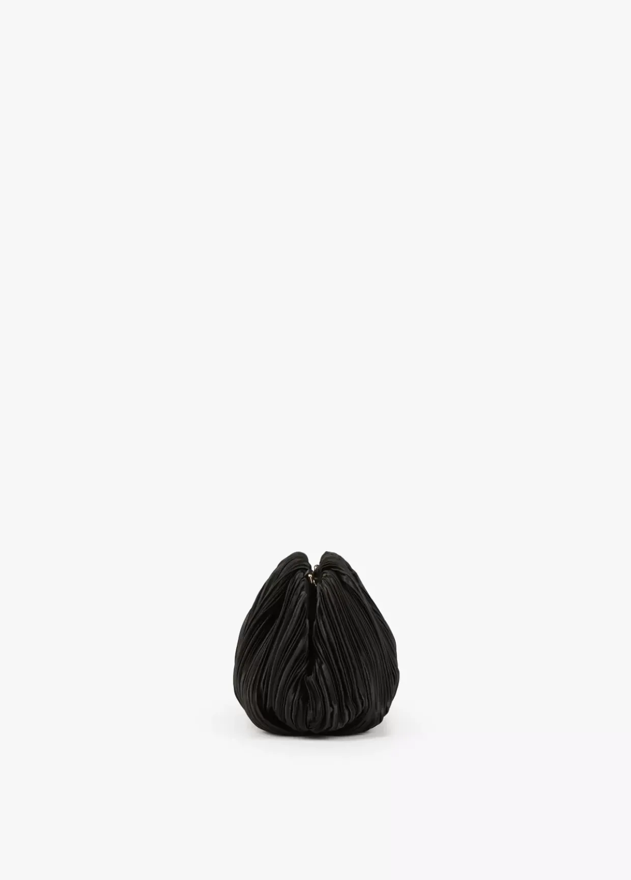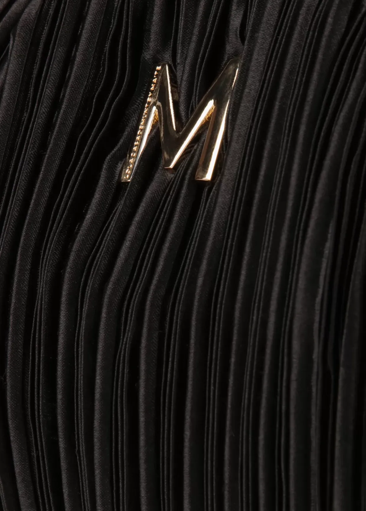 Bolso de fiesta con forma de concha plisado con cadena dorada extraíble. Detalle letra logo dorada en parte frontal.