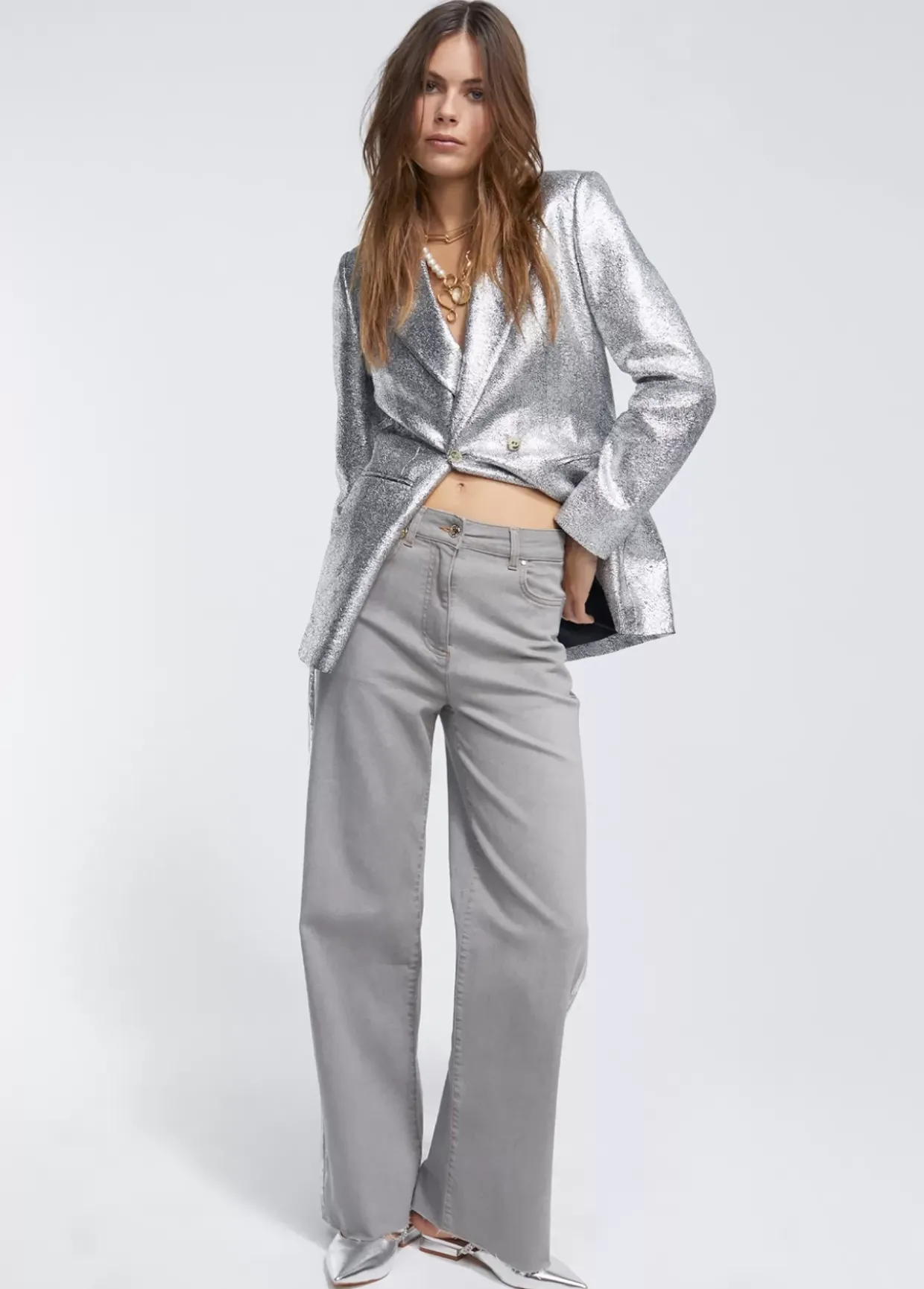 Chaqueta bomber en tejido craquelado plata. Cierre con snaps metálicos en dorado en frontal y puños. Bolsillos laterales con tapete y snap.