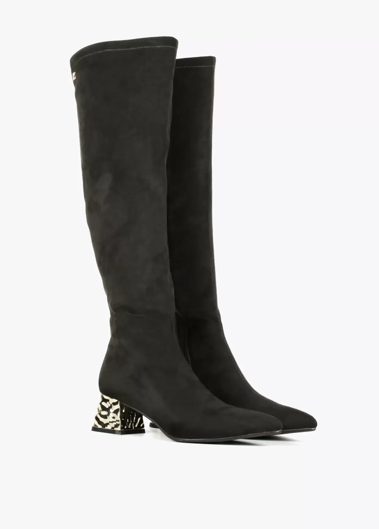 Bota de caña alta negra en efecto terciopelo con tacón dorado y grabado. Cremallera en el lateral y detalle logo dorado en el lateral.