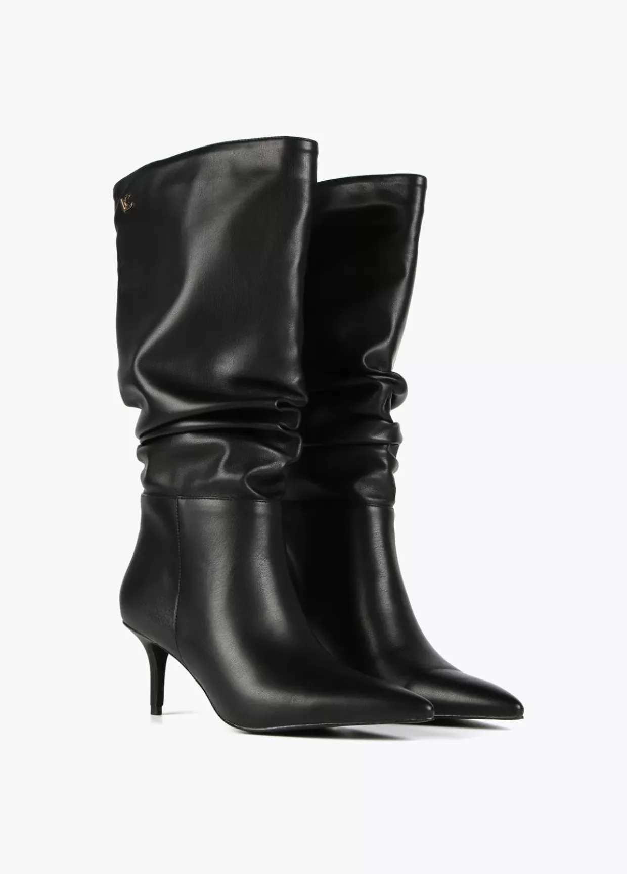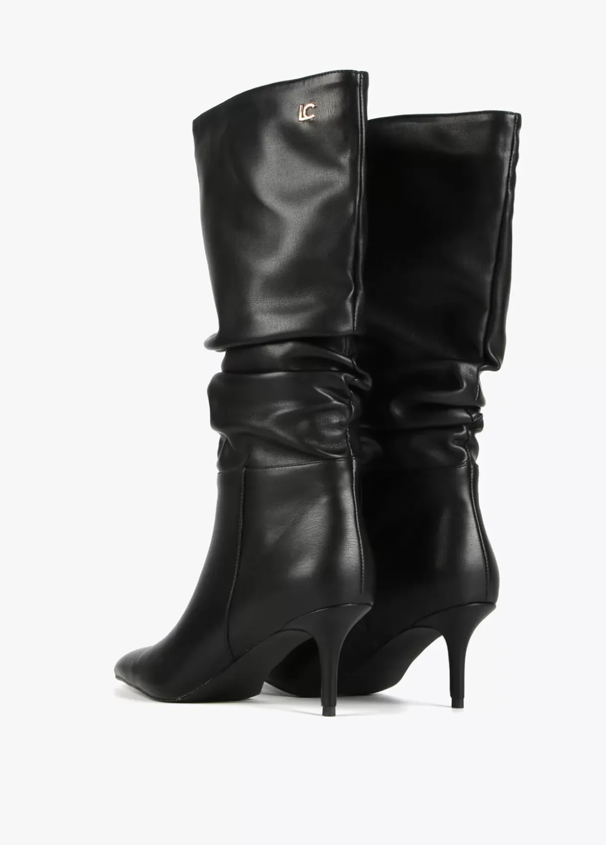 Bota de tacón con caña alta fruncida y letras logo en laterales.