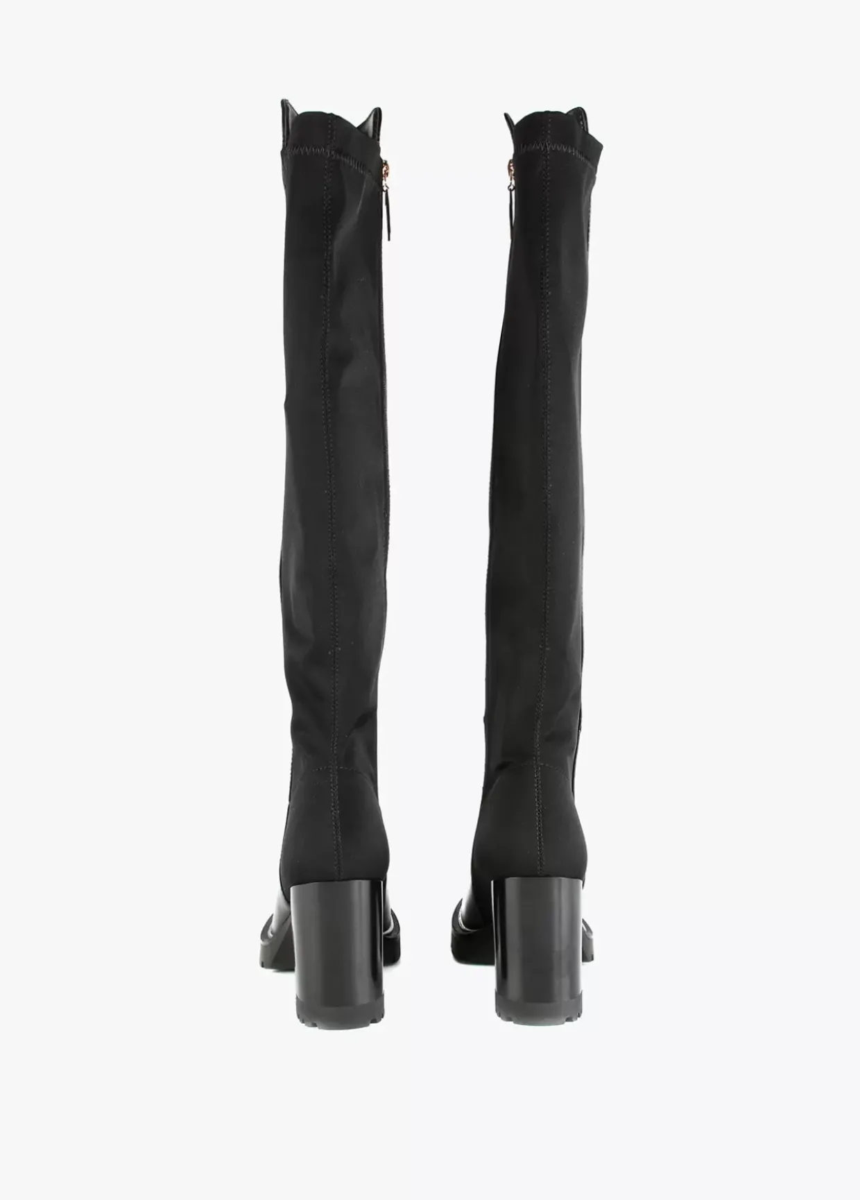 Botas tipo mosquetera altas con tacón en diferentes tejidos, efecto piel y efecto neopreno combinados. Maxi suela y logo dorado en parte superior.