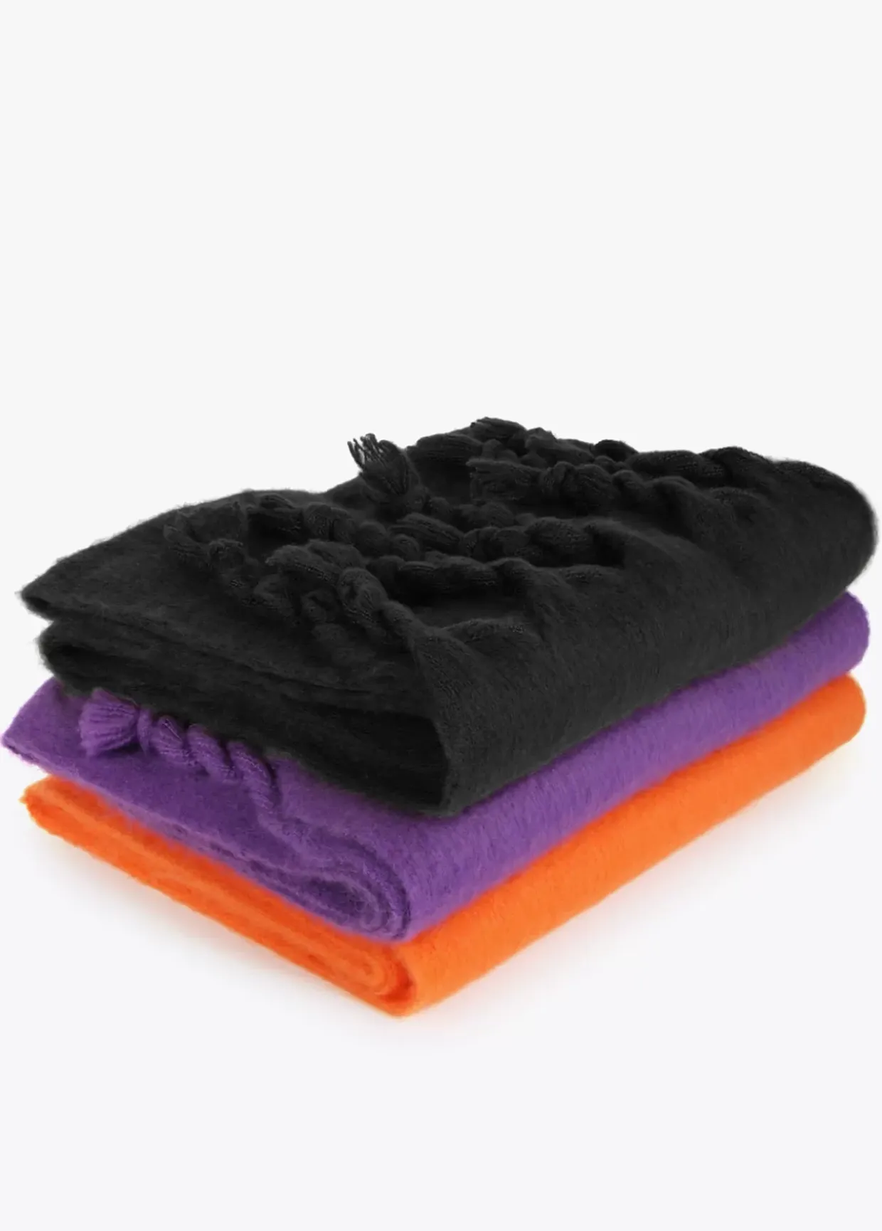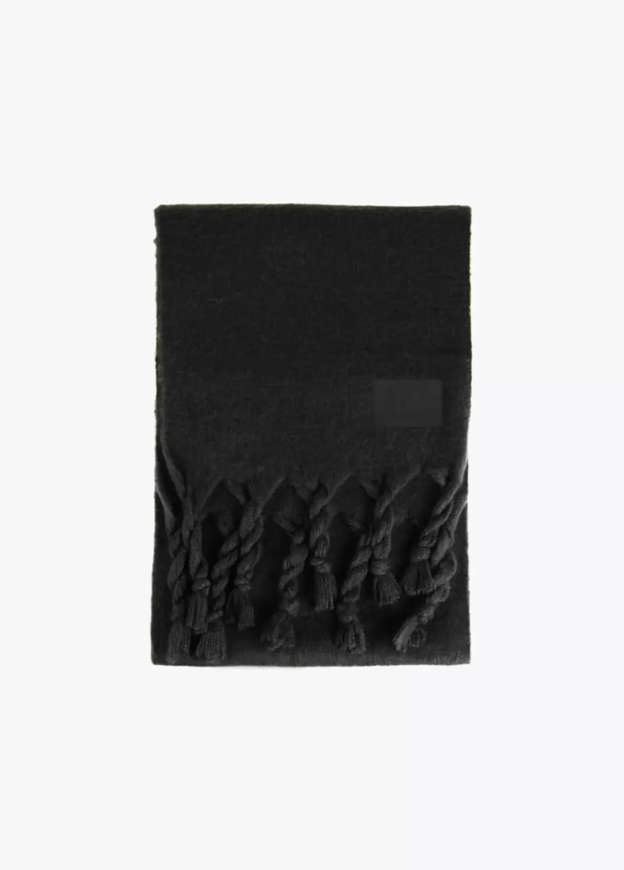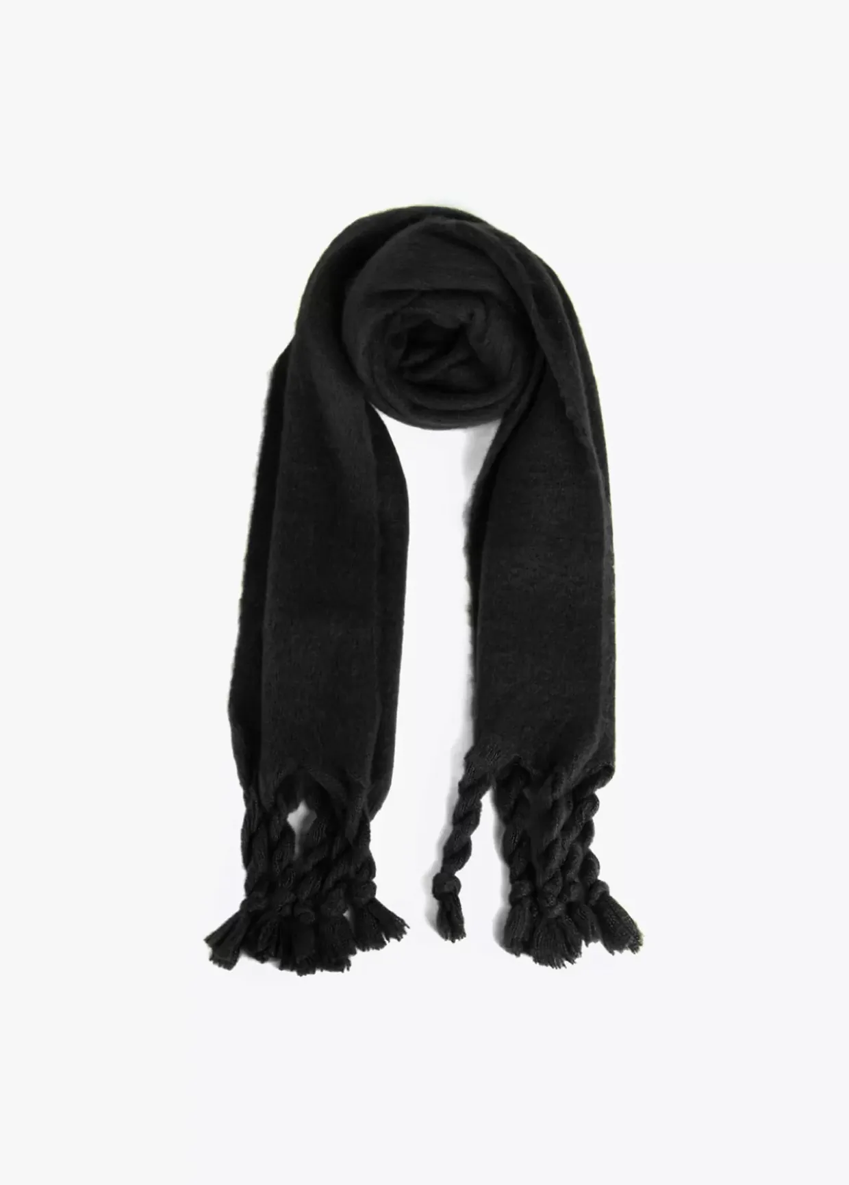 Bufanda unicolor con flecos trenzados en extremos.