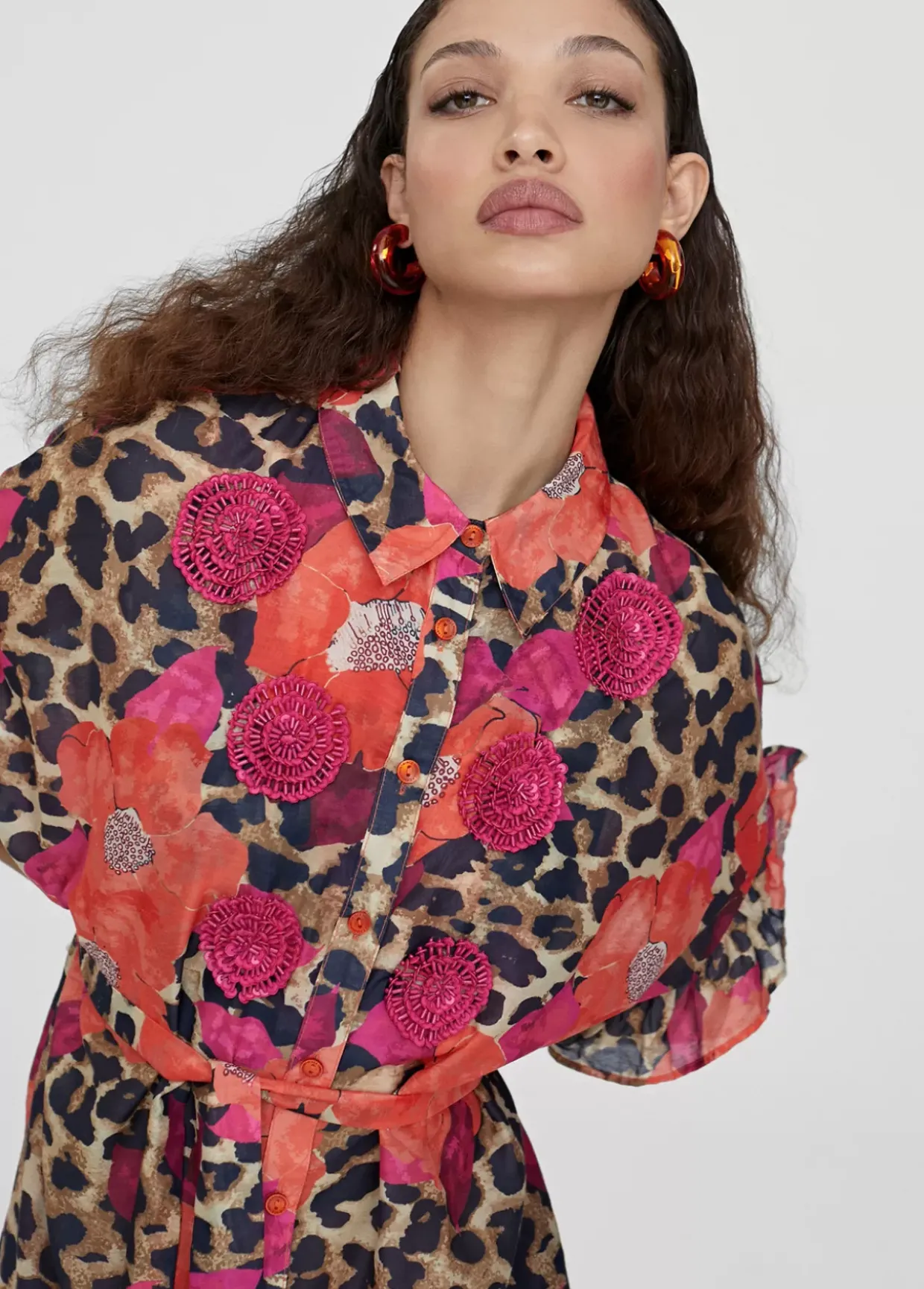 Caftan midi en estampado floral y animal print. Cuello camisero y manga corta con volante. Cierre frontal con botones y cinturon del mismo tejido. Volantes en lateral bajo con abertura.