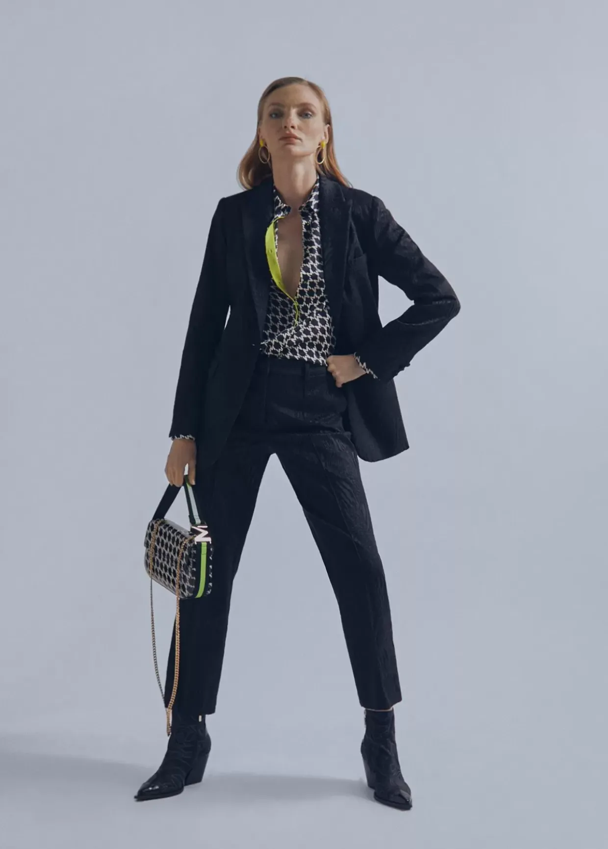 Camisa tejido fluido con estampado M bicolor. Cuello y puños camiseros. Detalles color fluor.