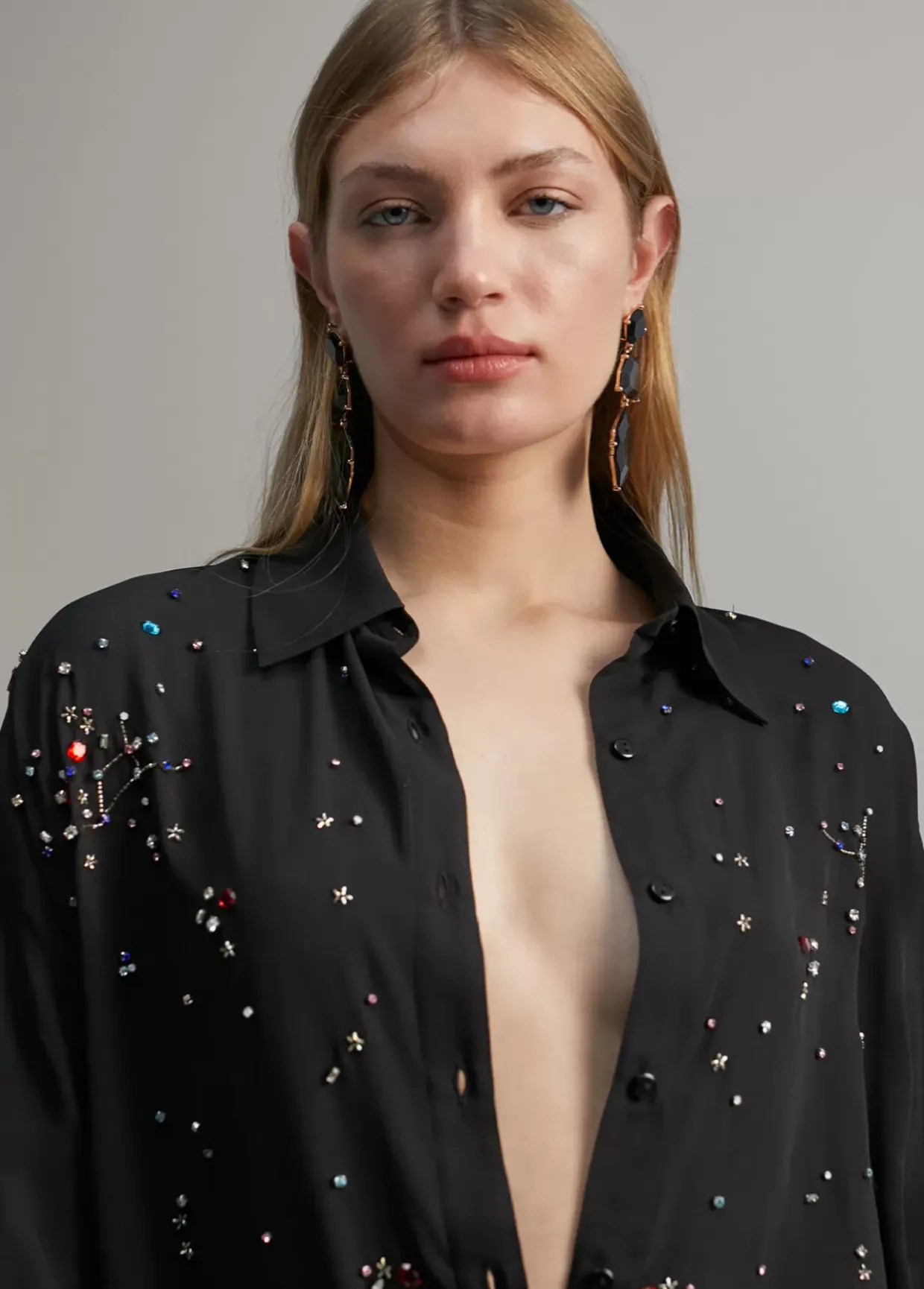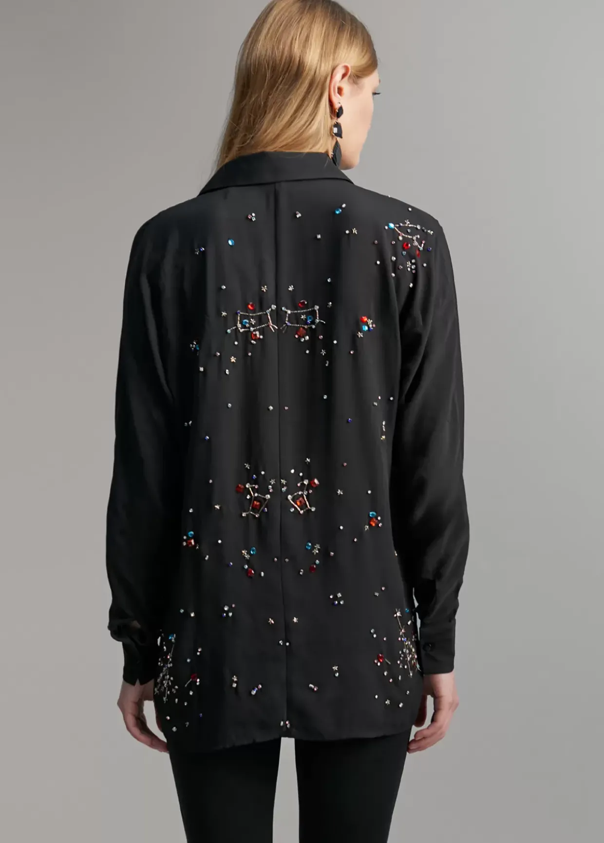 Camisa fluida con cuello y puños camiseros. Aplicaciones tipo joya bordadas. Cerrada con botones.