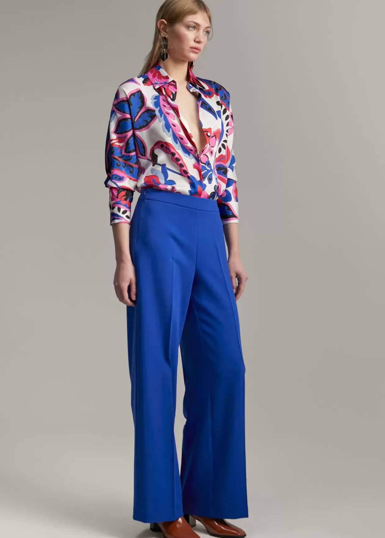 Camisa efecto satén estampada en paisley. Cuello y puños camiseros. Cerrada con botones.