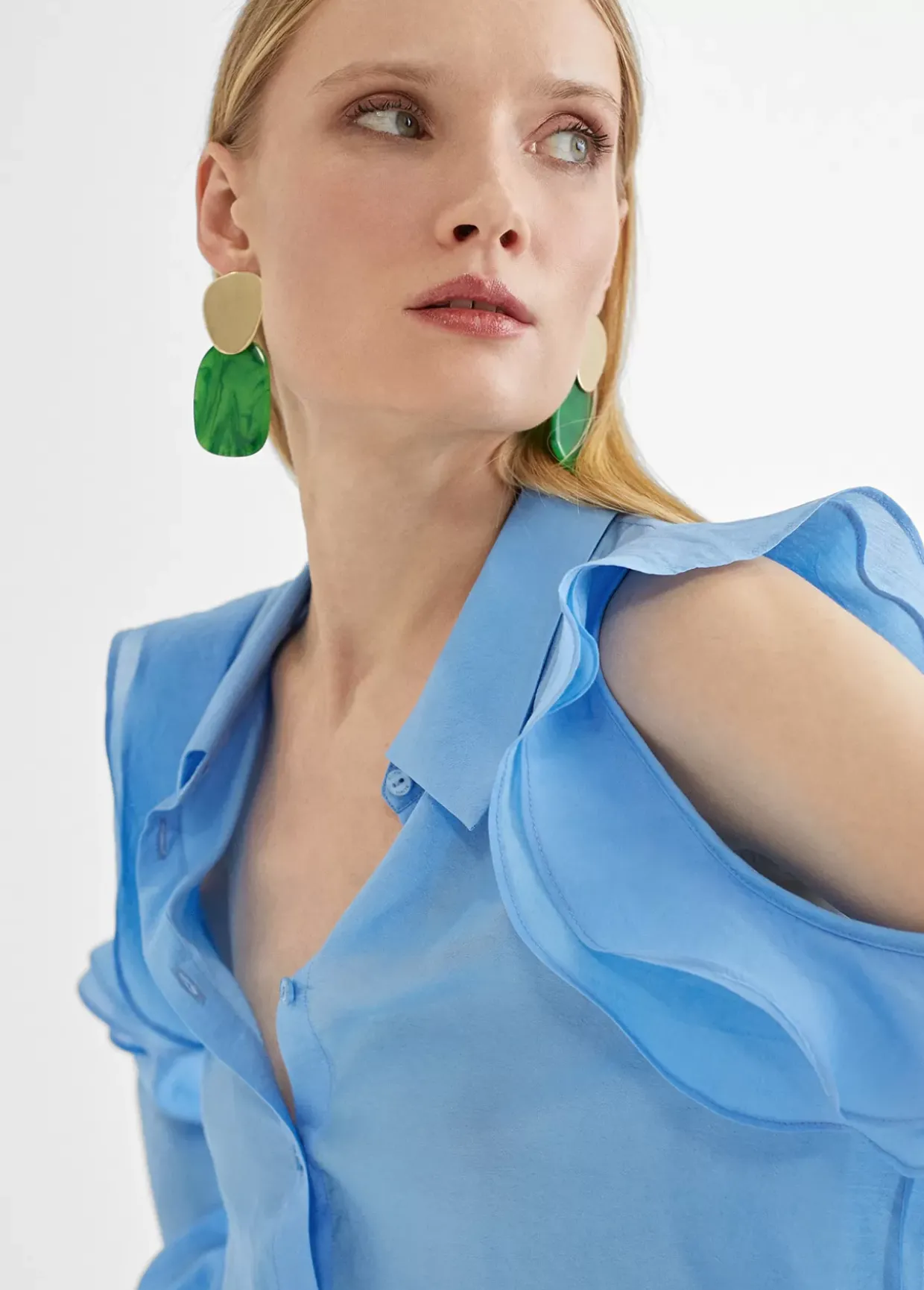Blusa fluida con manga de volantes y hombros descubiertos. Cuello y puños camisero y cierre con botones a tono.