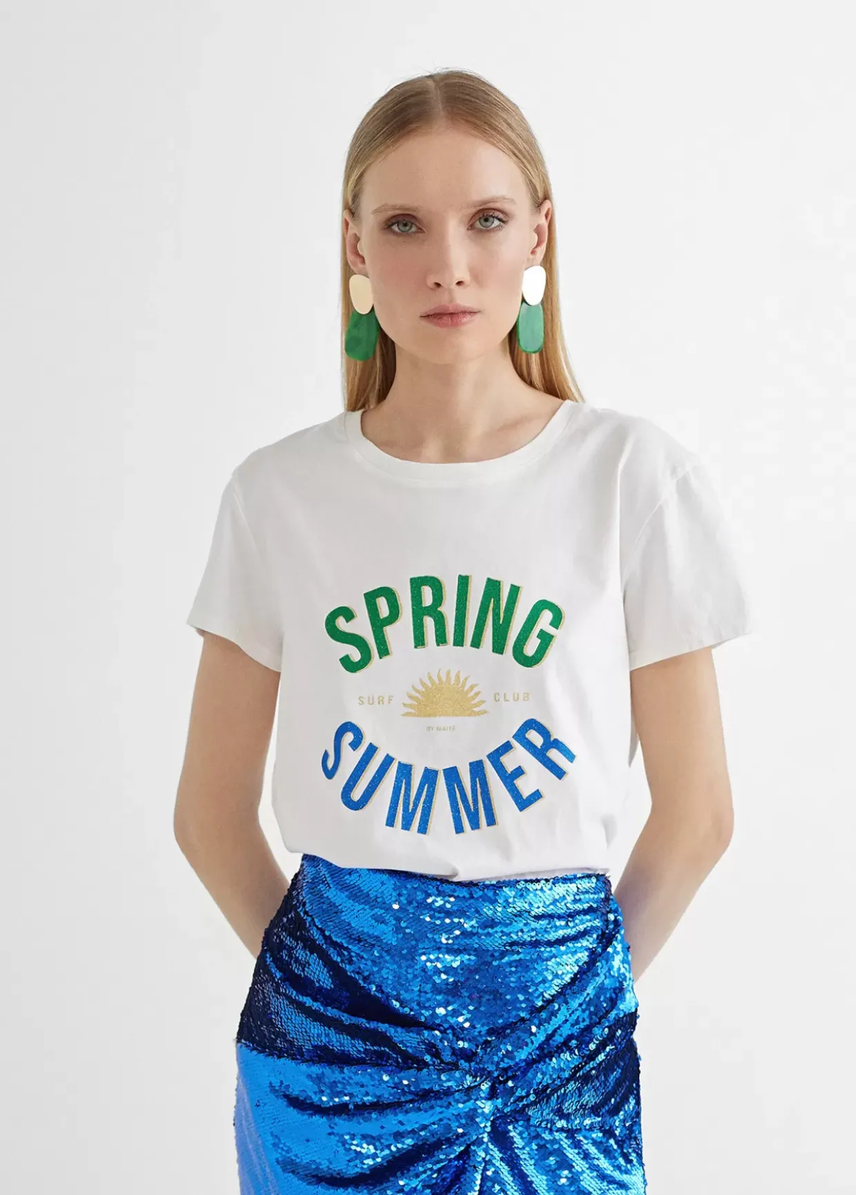Camiseta de algodón con cuello caja y manga corta. Posicionado frontal «Spring Summer» en color.