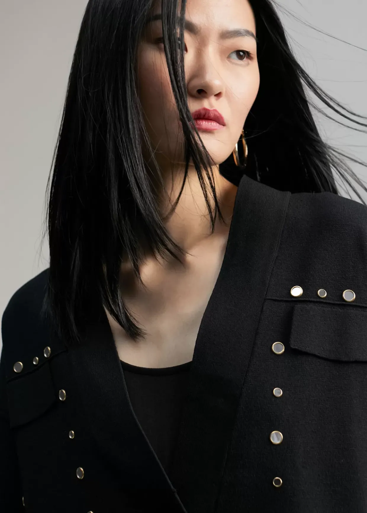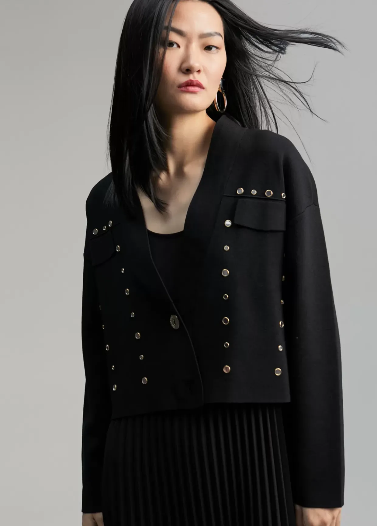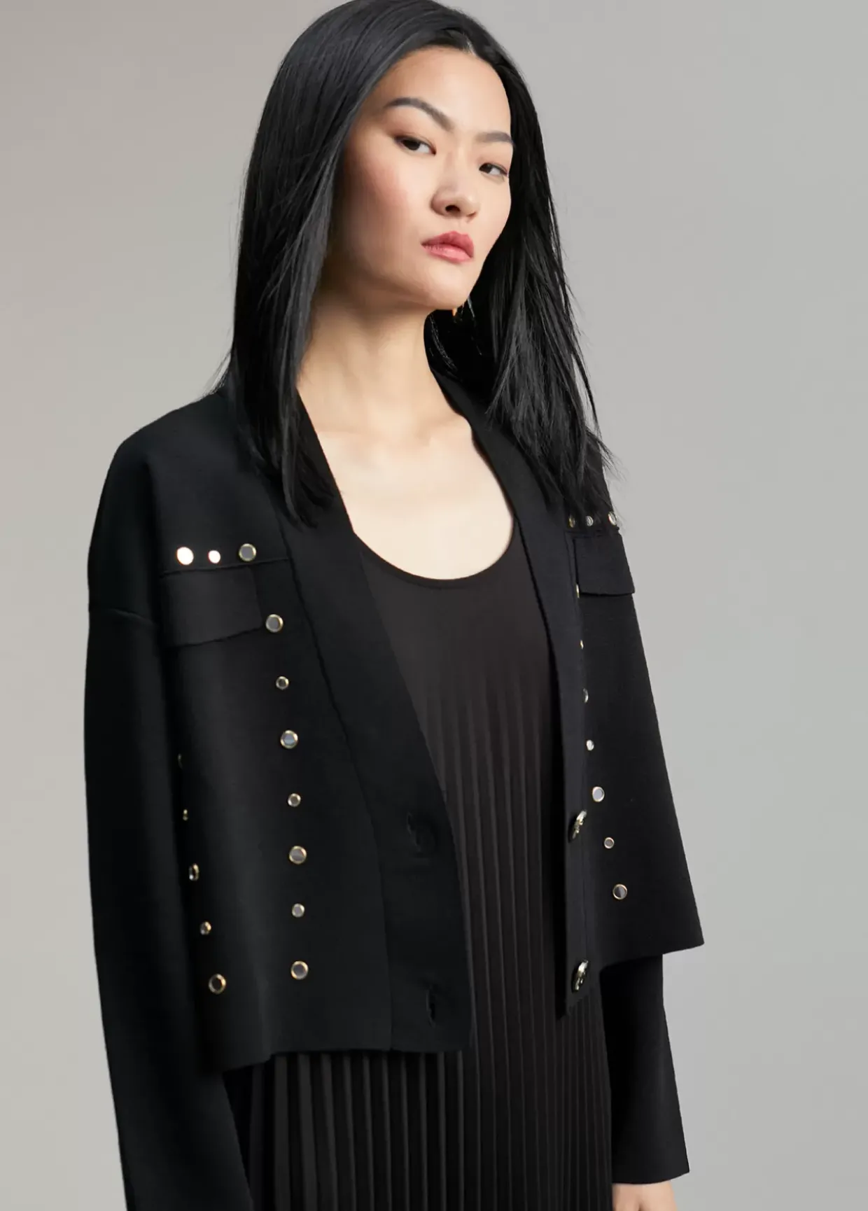 Cárdigan corto. Tapetes frontales y cerrado con dos botones metálicos. Detalle de mini espejos metálicos.