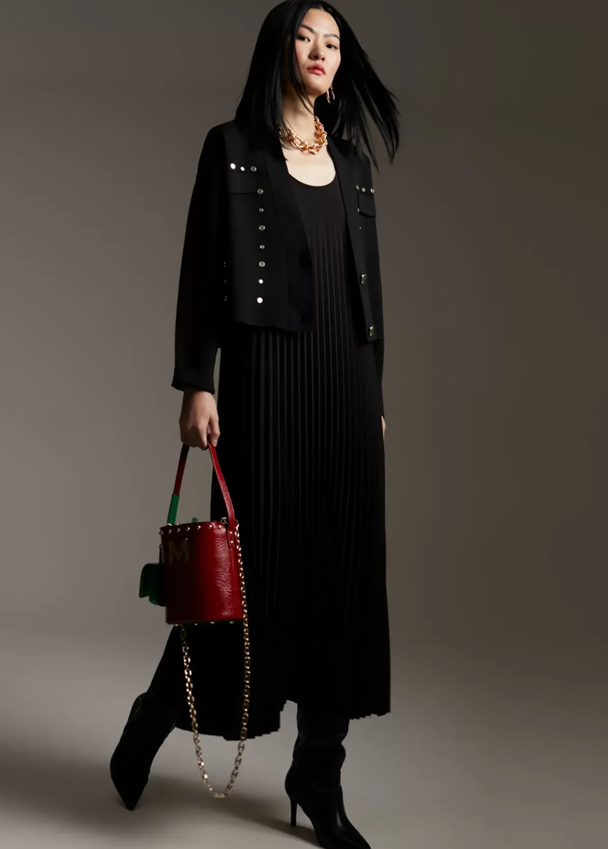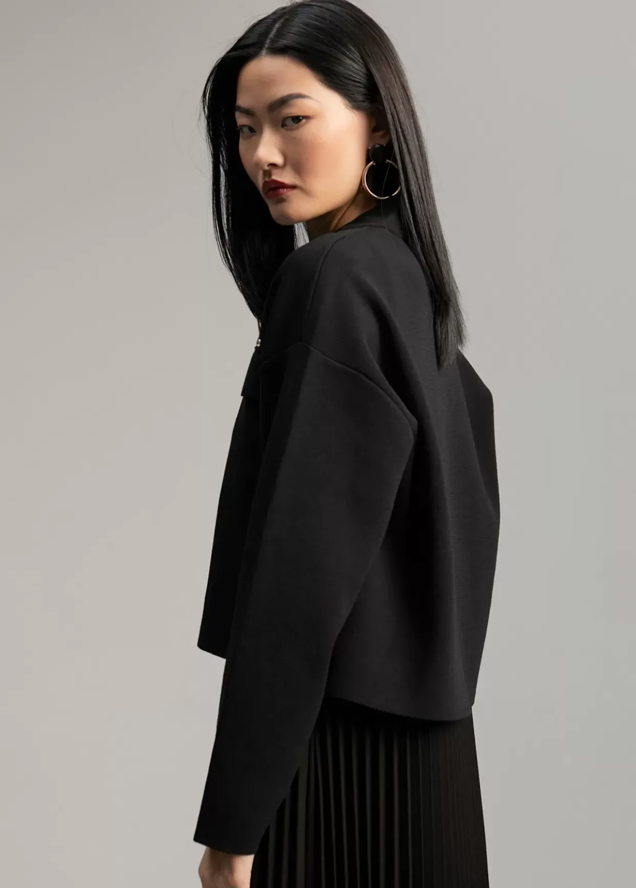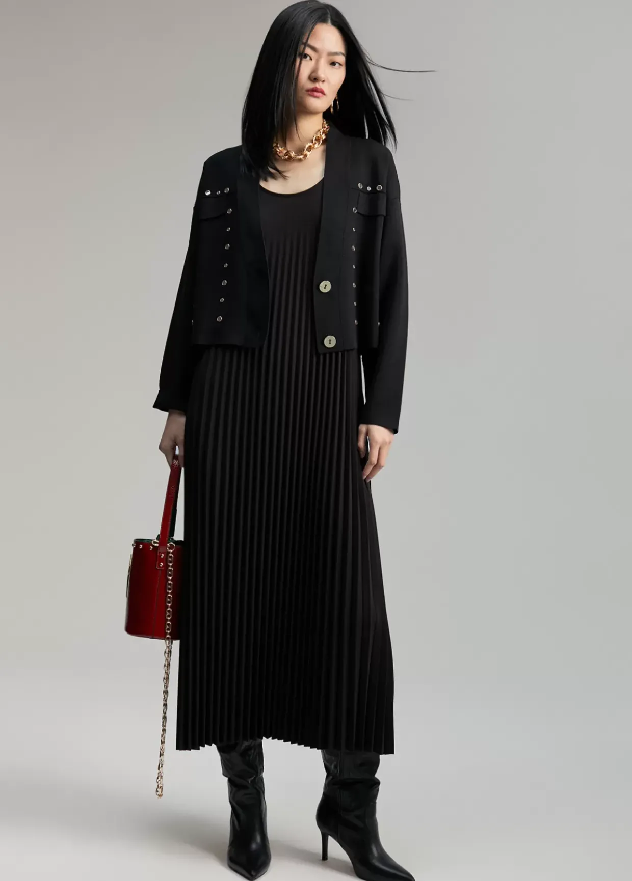 Cárdigan corto. Tapetes frontales y cerrado con dos botones metálicos. Detalle de mini espejos metálicos.