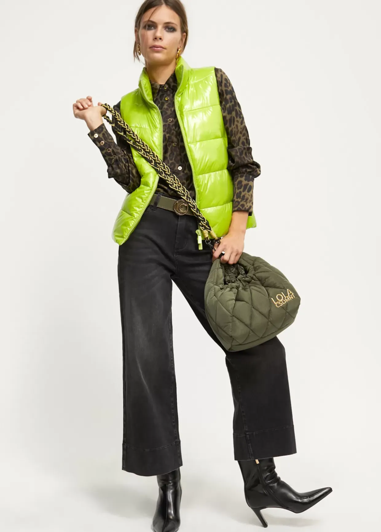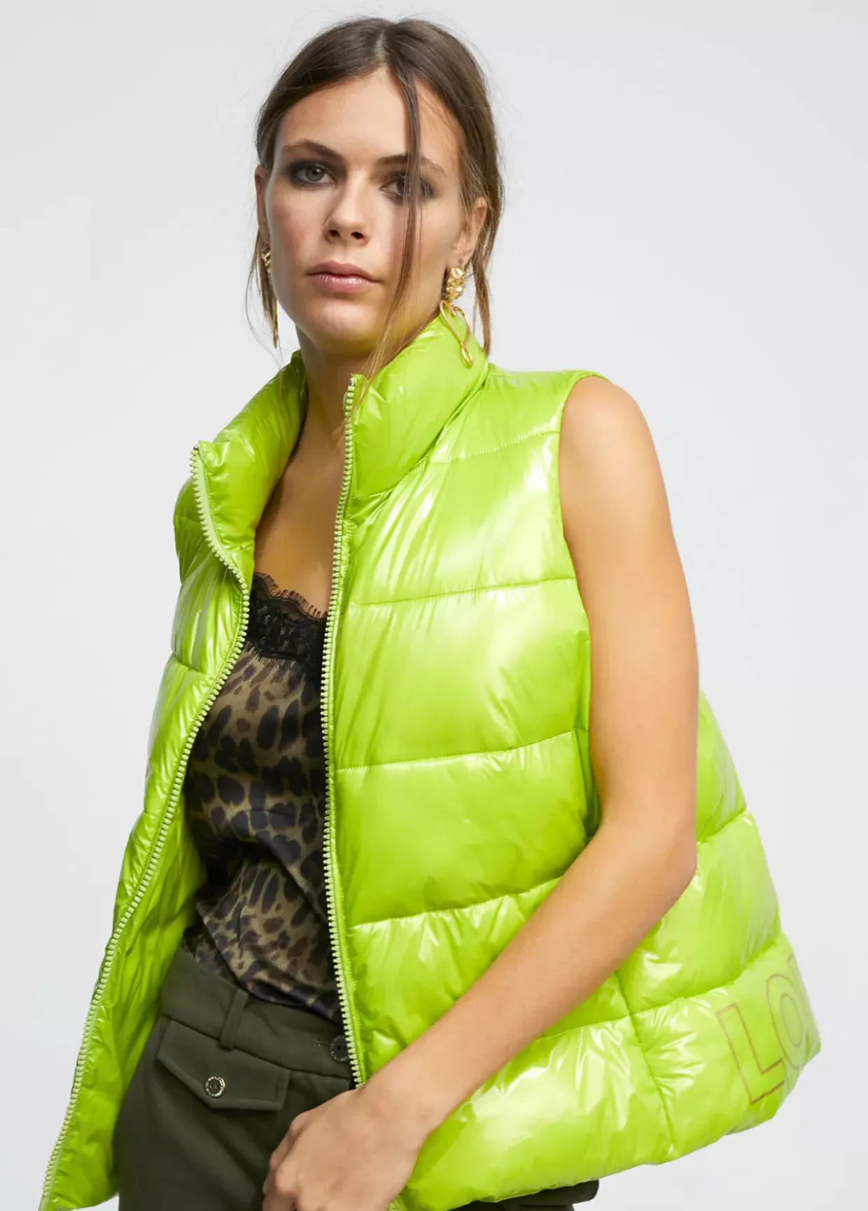 Chaleco corto acolchado en efecto charol. Cierre con cremallera de doble carro a tono. Bolsillos laterales y logo en espalda.