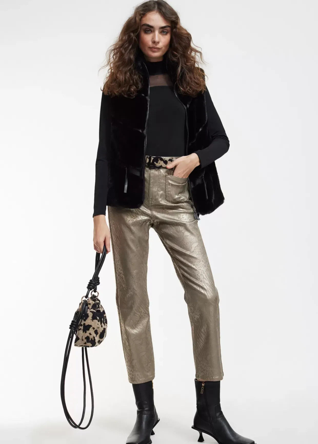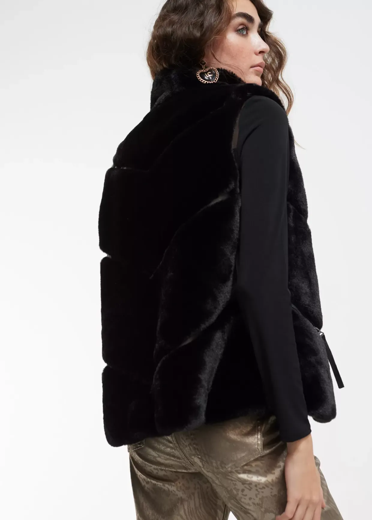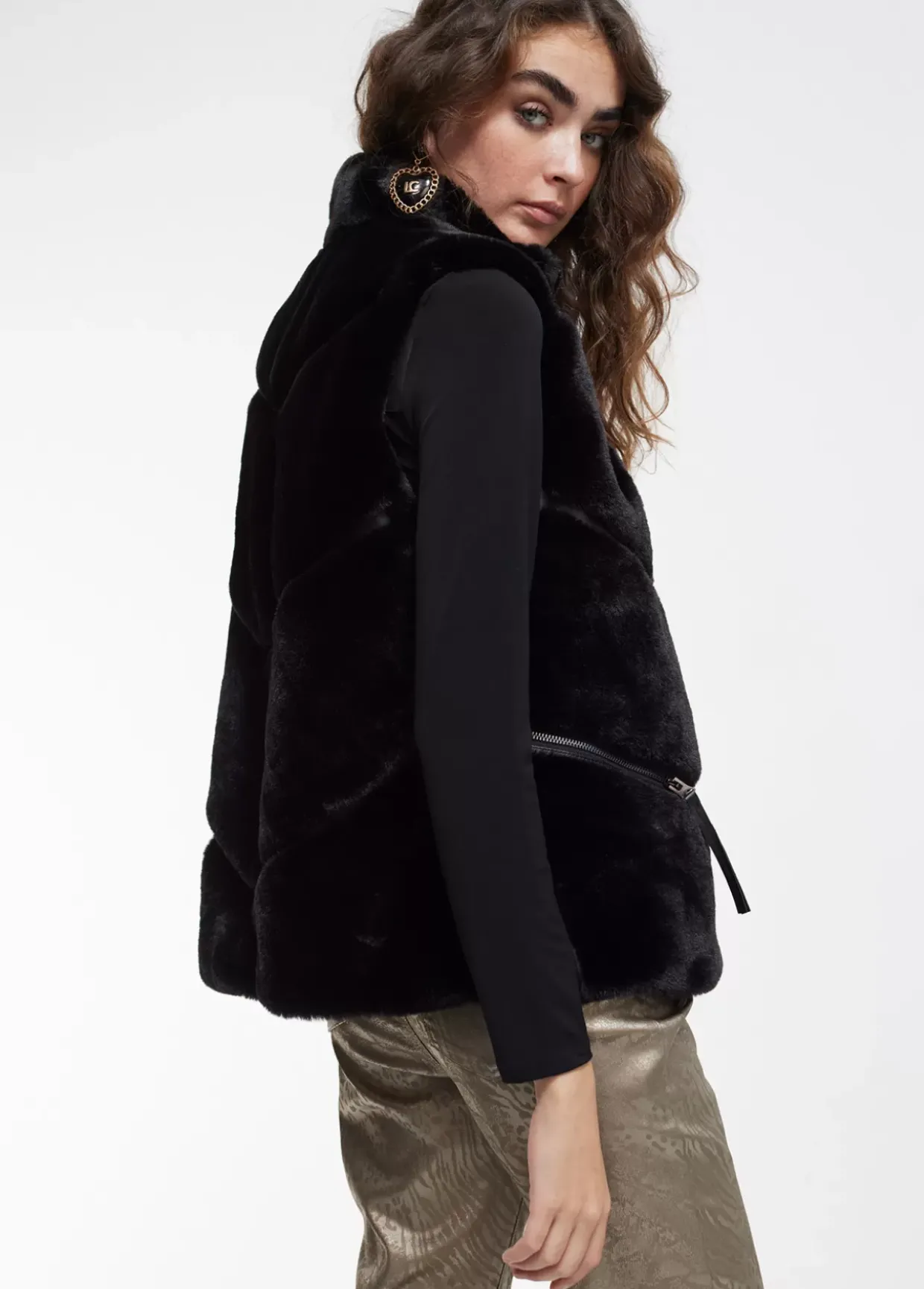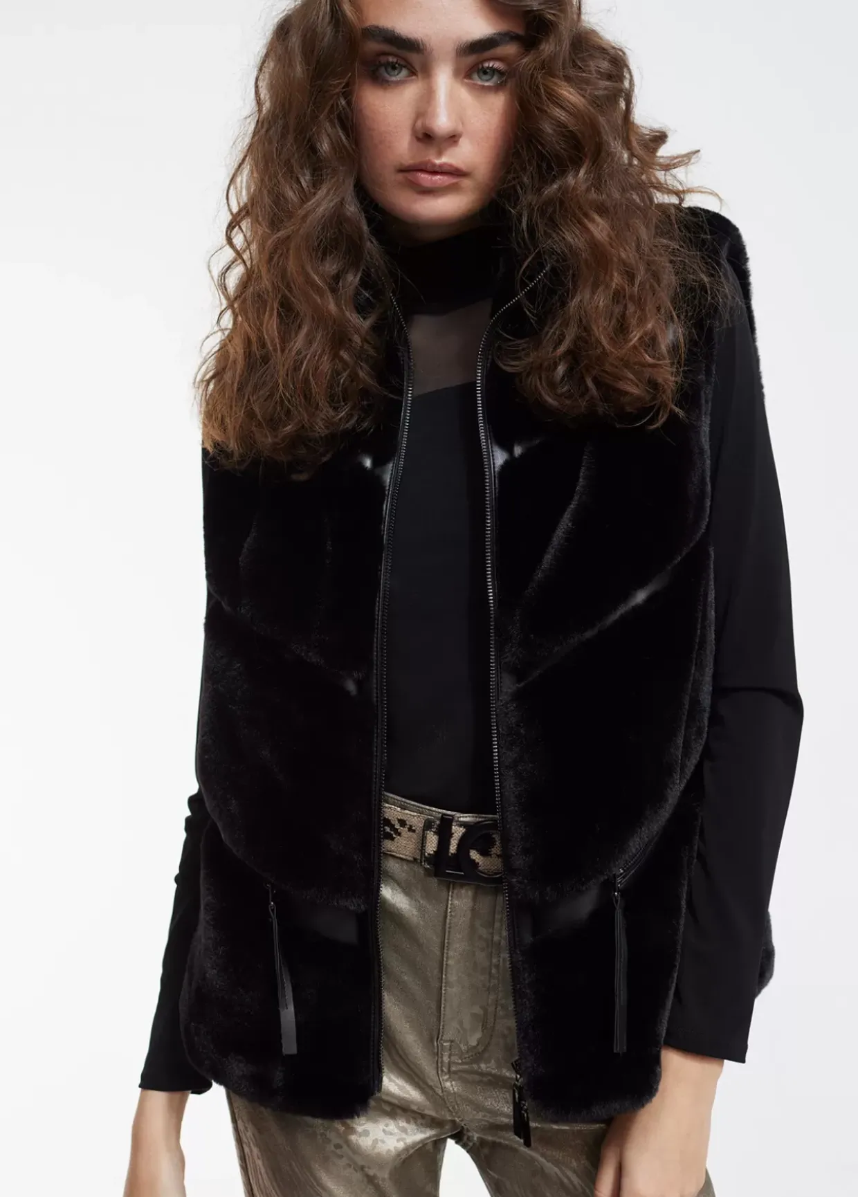 Chaleco corto de pelo combinado con efecto piel en negro. Cierre central con cremallera y bolsillos laterales.