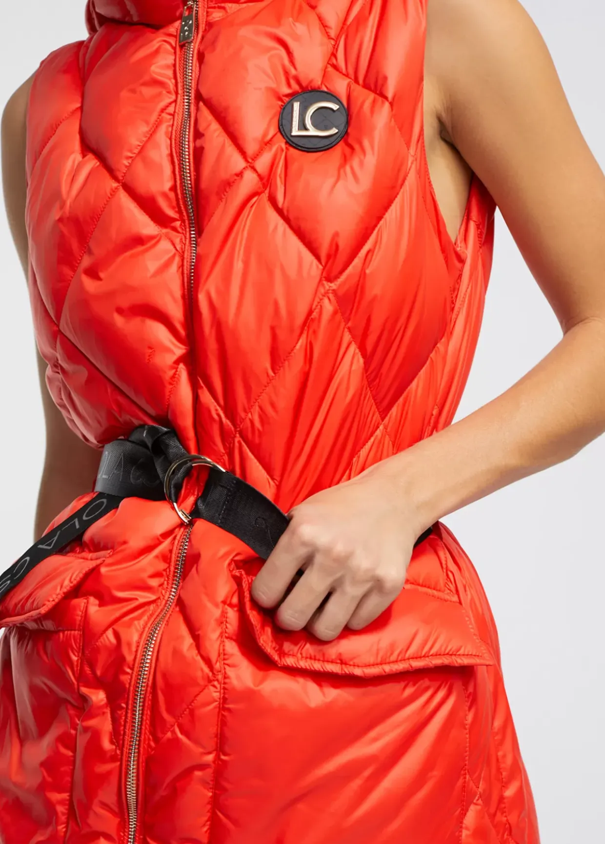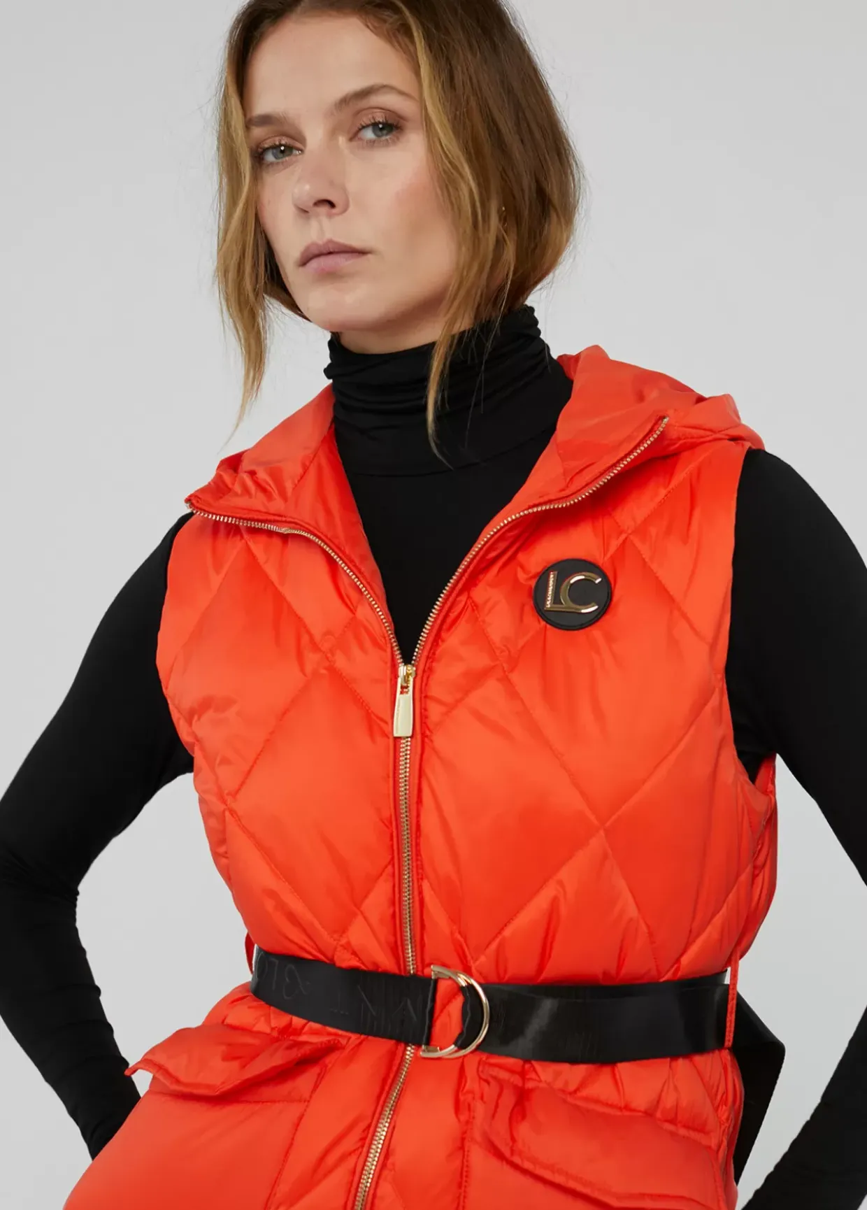 Chaleco largo acolchado con capucha. Cierre con cremallera de doble carro. Cinturón con hebilla metálica y bolsillos plastrón con tapete. Aberturas laterales en bajo.
