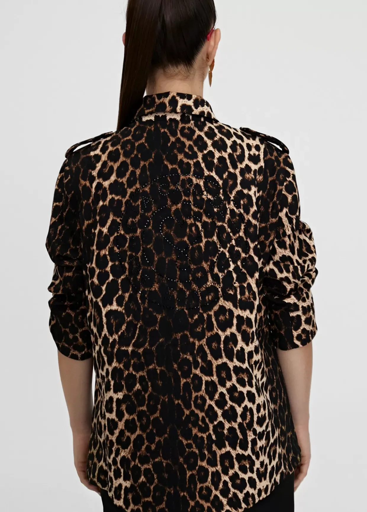 Chaqueta en estampado animal print. Espalda con logo en piedras facetadas. Cerrada con cremallera dorada de doble carro y snaps metálicos. Bolsillos frontales tipo plastrón con tapeta. Cintura ajustable. Detalle de vistas en color.