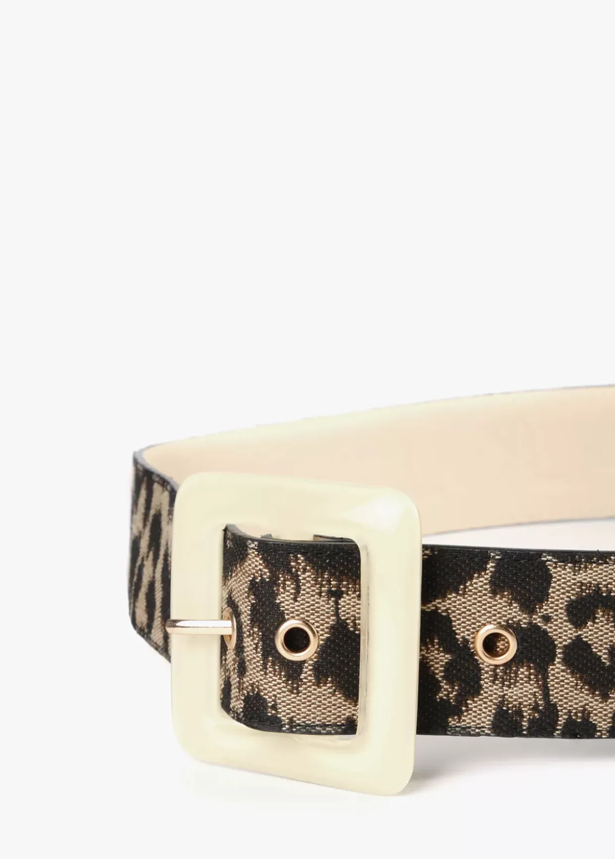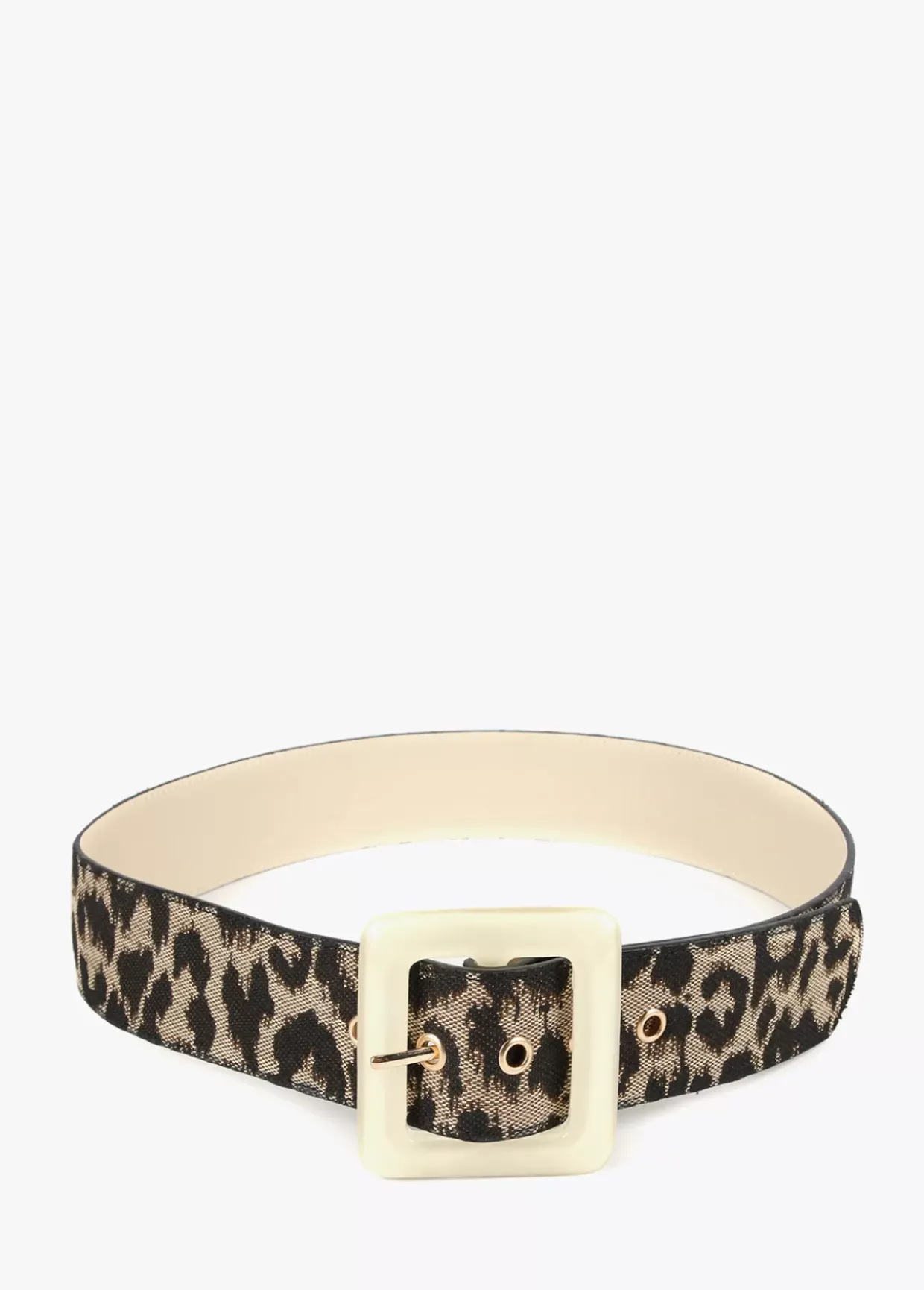 Cinturón ancho en canvas estampado de leopardo y maxi hebilla dorada.