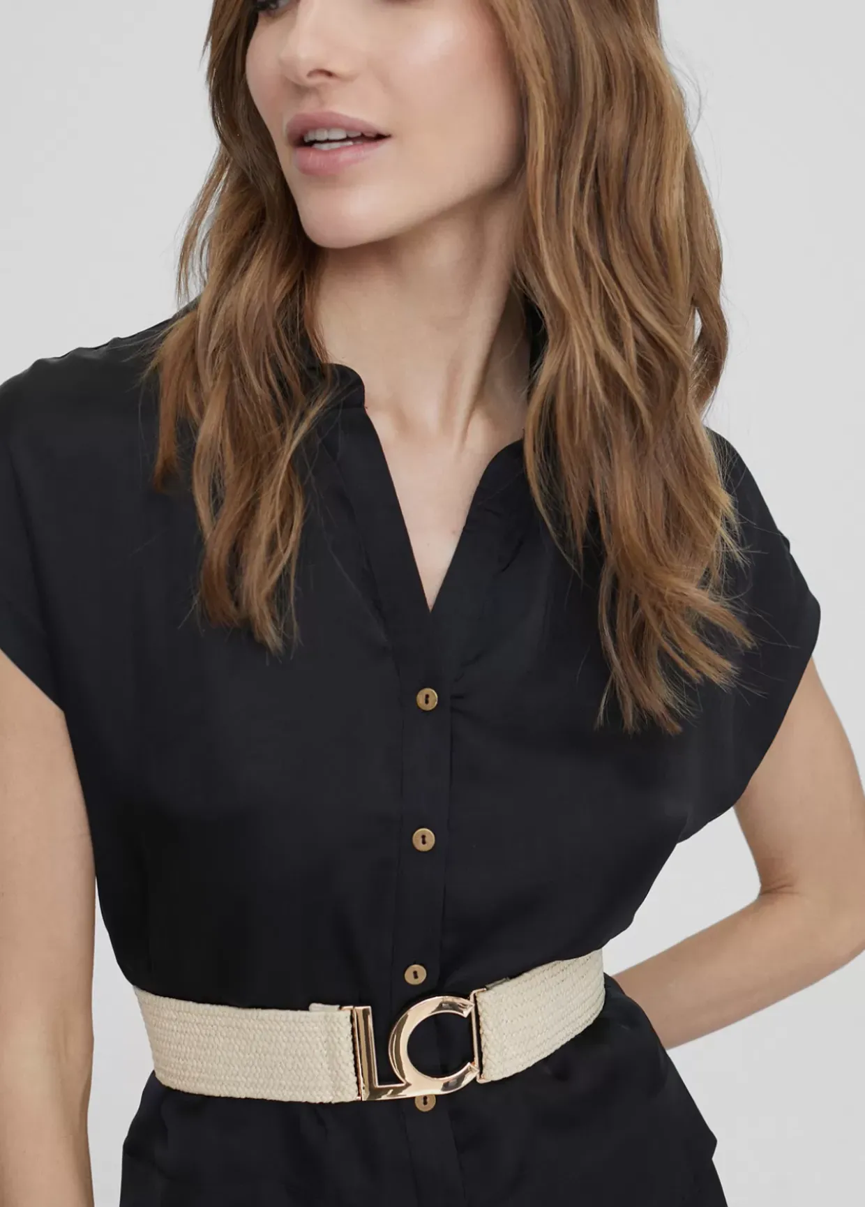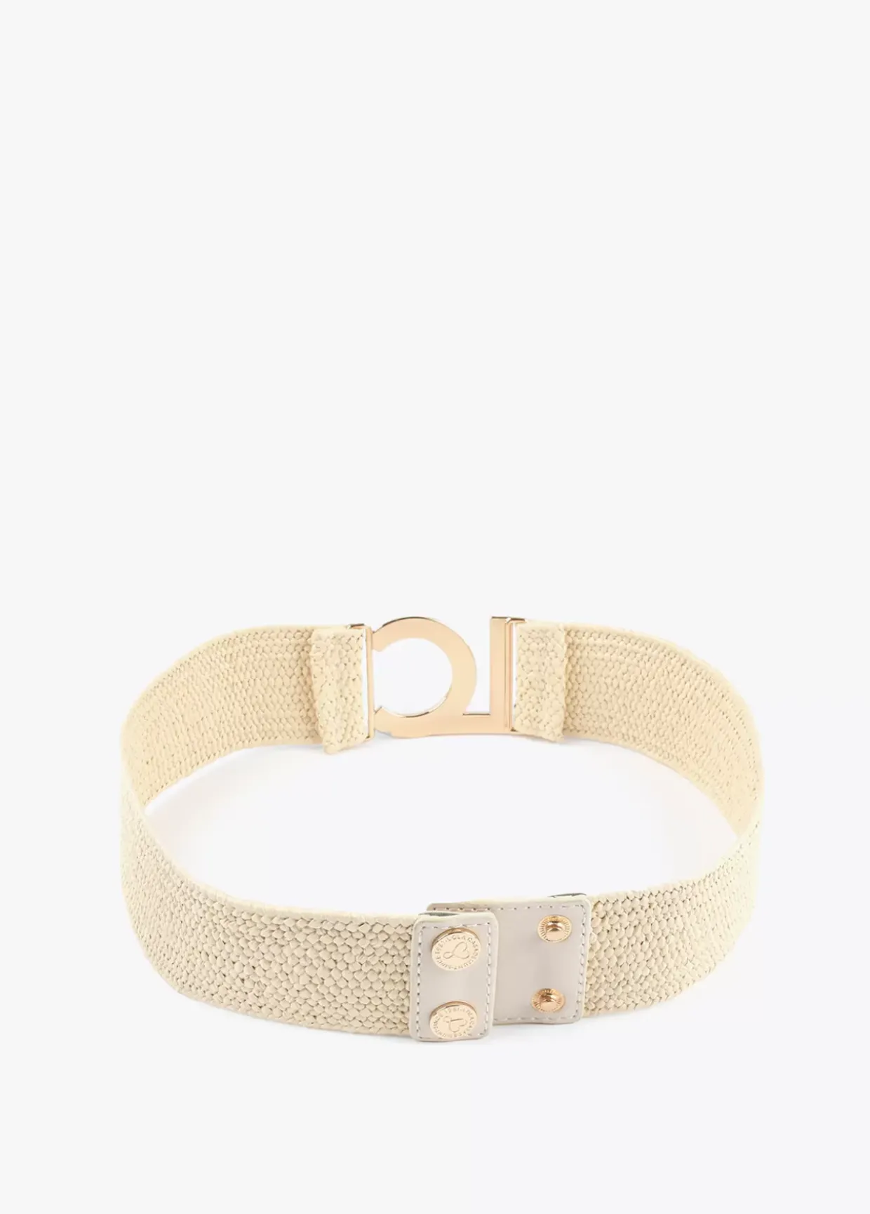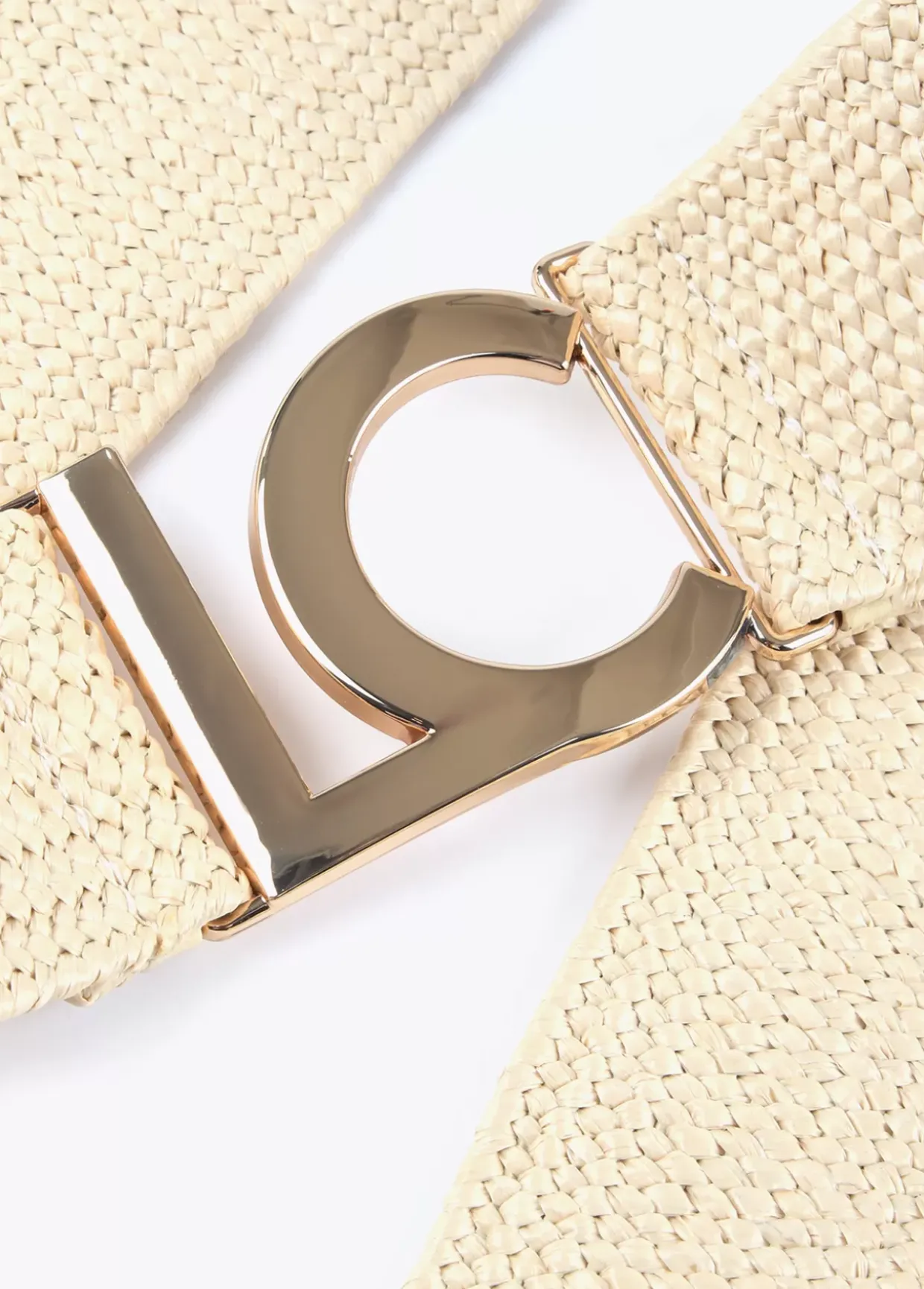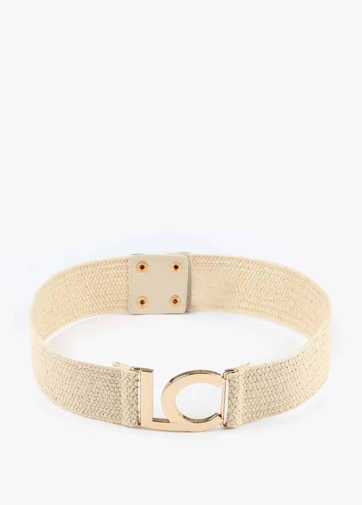 Cinturón efecto rafia elástica y logo dorado en parte frontal. Cierre trasero ajustable.