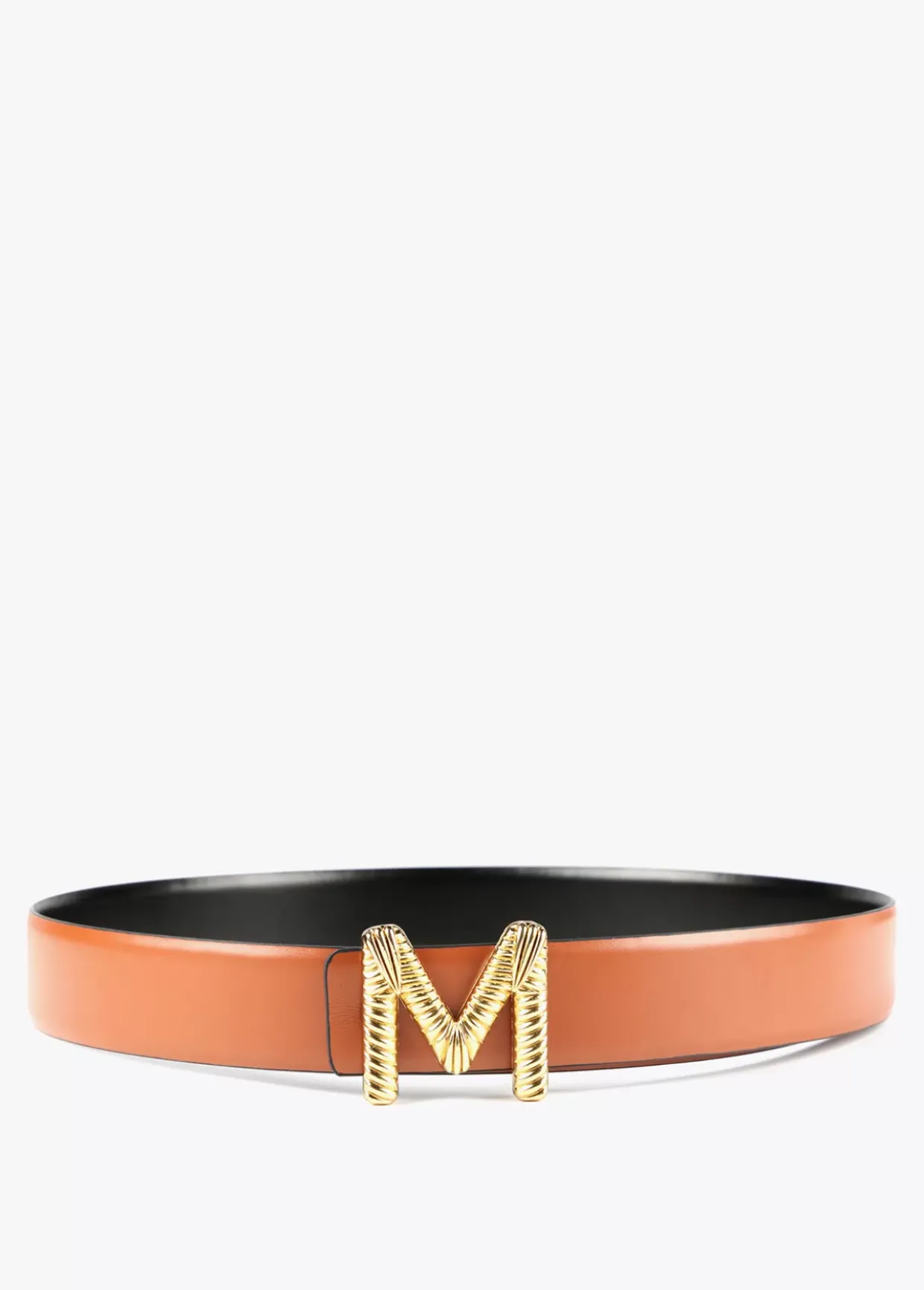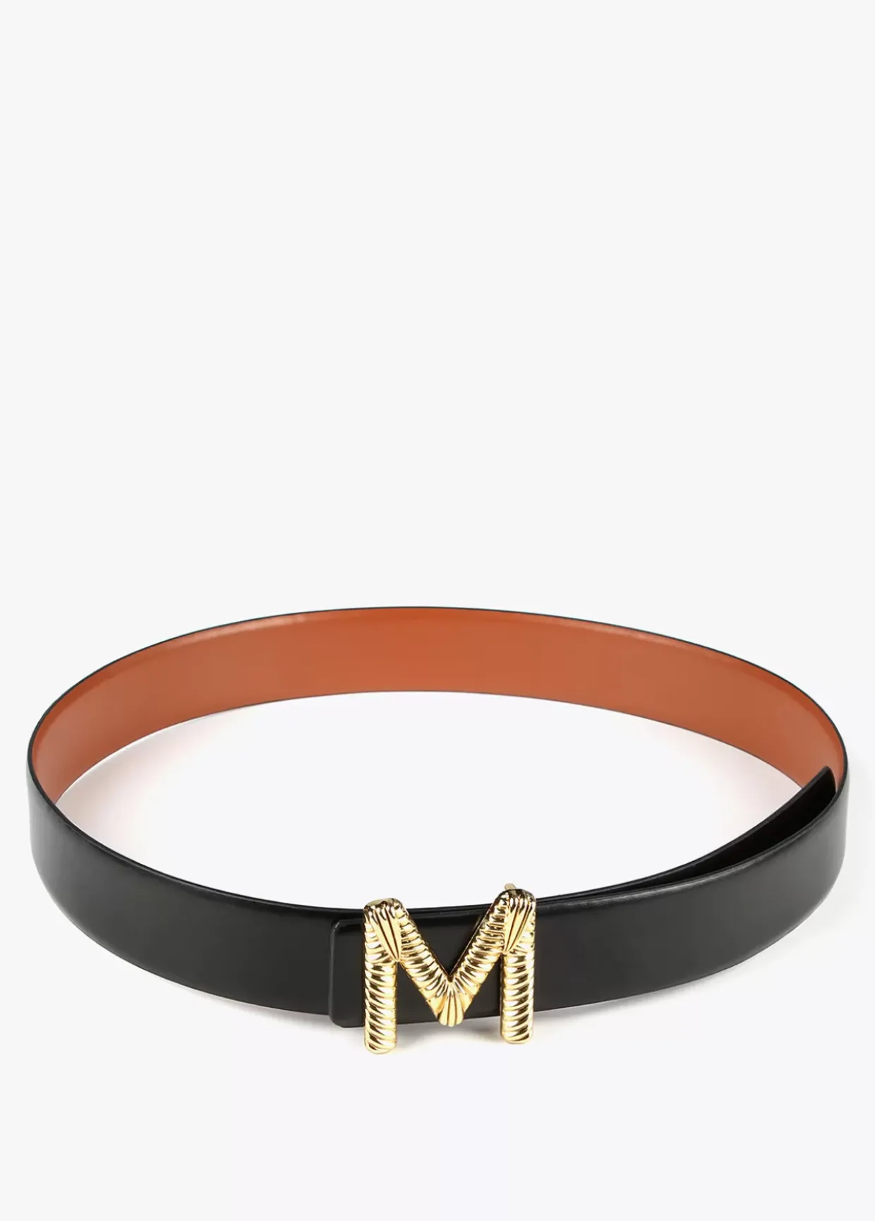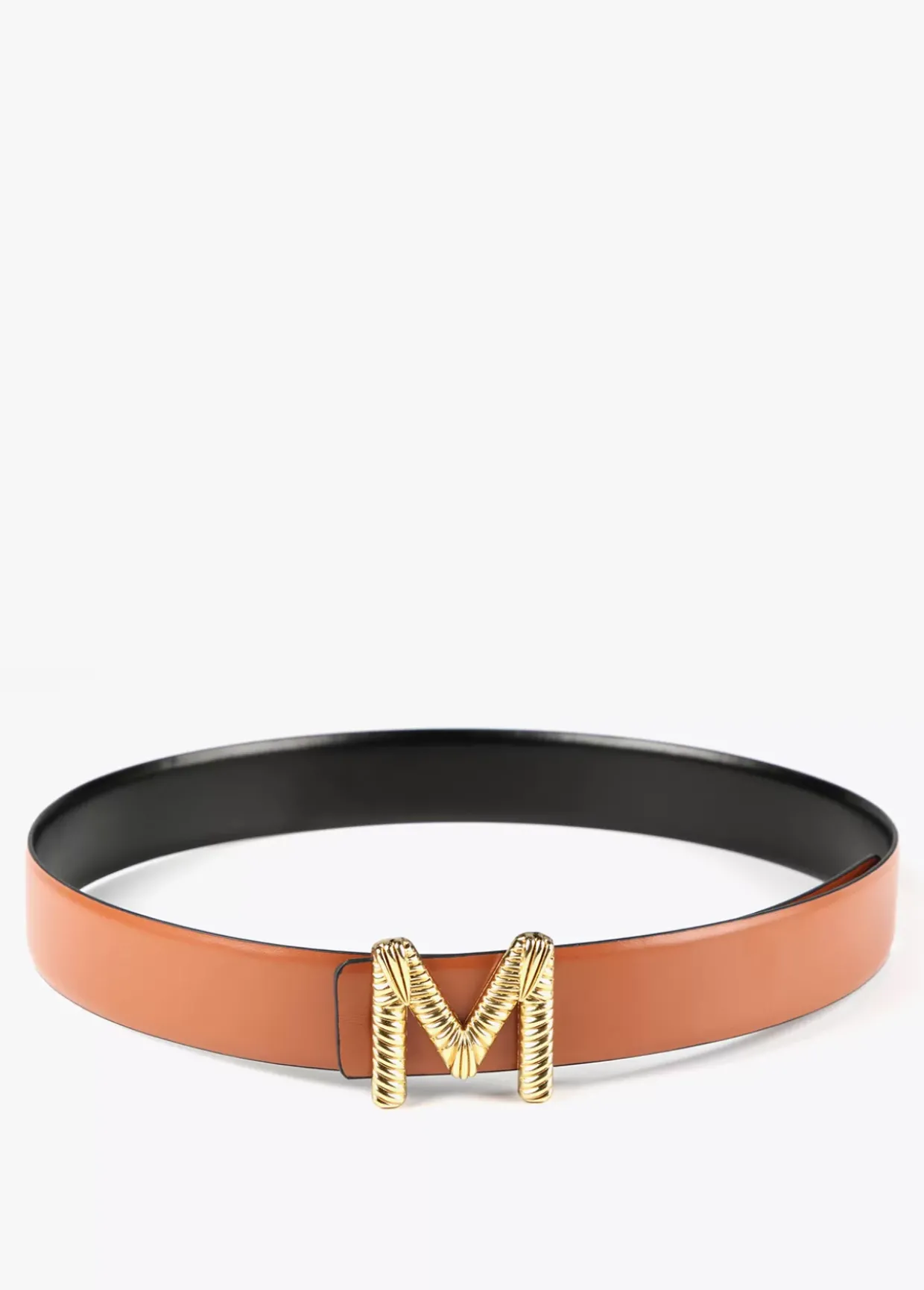 Cinturón piel reversible con letra logo dorada a modo de hebilla.
