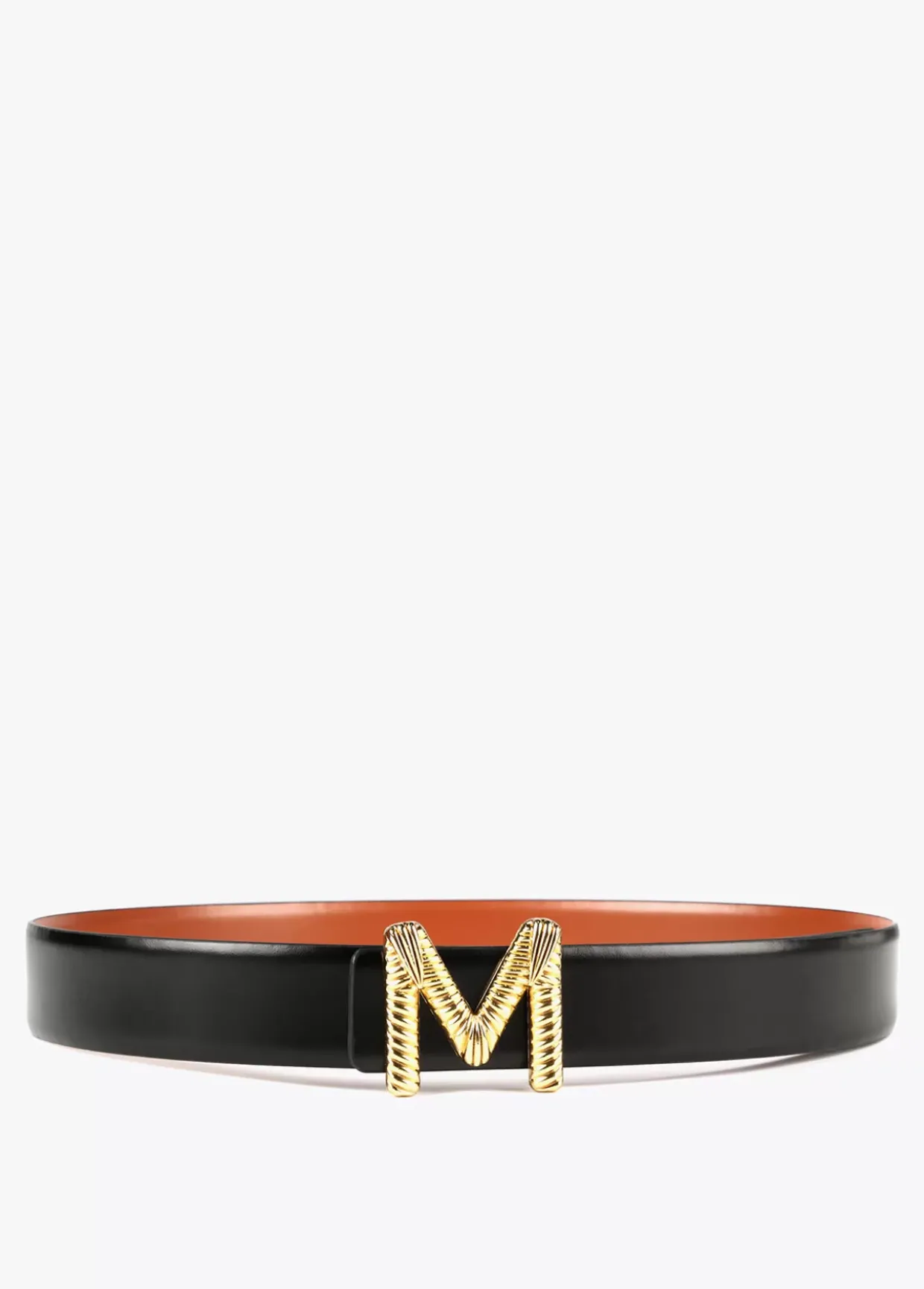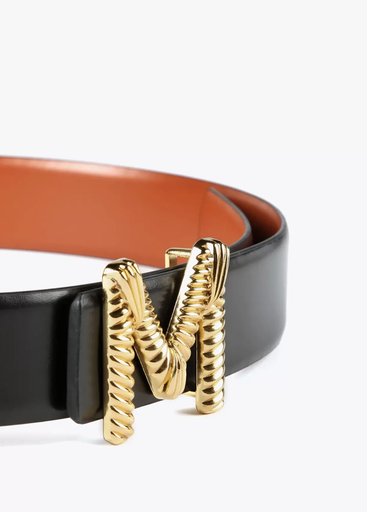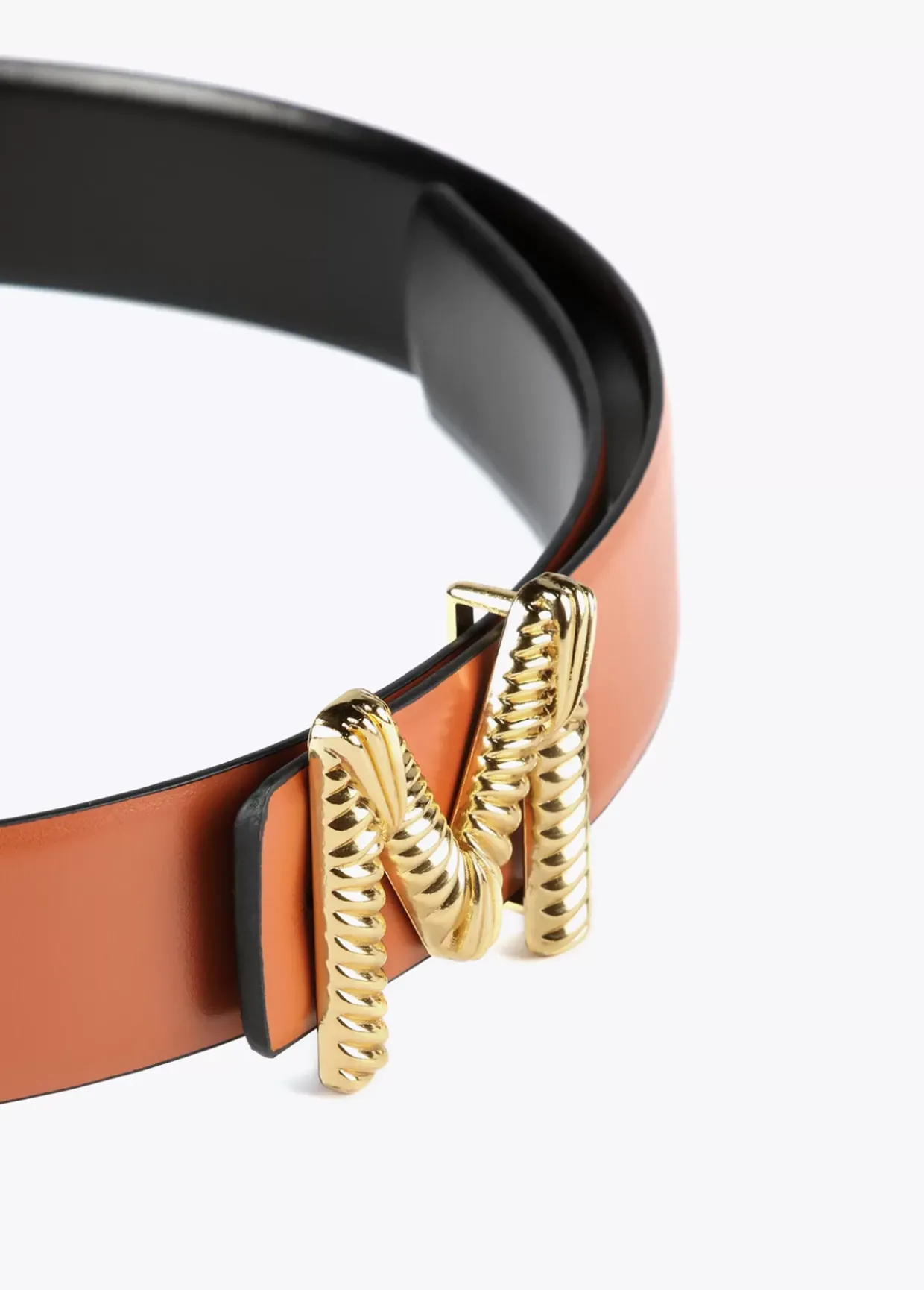 Cinturón piel reversible con letra logo dorada a modo de hebilla.